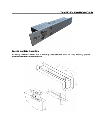 ZAMEK SOLENOIDOWY SLD Sposób montaŜu i wymiary Nie naleŜy instalować zamka SLD w spodniej części skrzydła drzwi lub ramy. PoniŜszy rysunek pokazuje prawidłowy sposób montaŜu. ZAMEK SOLENOIDOWY SLD Schemat instalacji zamka Regulacja opóźnienia zamknięcia Dane techniczne Zasilanie: Solenoid: Pobór prądu: Opóźnienie: Rygiel (średnica): Pokrywa: Płyta czołowa: Waga: Czujnik stanu rygla: Czujnik stanu drzwi: 12 VDC, pobór 0,9 A 24VDC, pobór 0,5 A czerwony (+) czarny (-) zabezpieczenie przed odwrotną polaryzacją praca ciągła 12 VDC: włączenie – 0,9 A, oczekiwanie: 0,3 A 24 VDC: włączenie – 0,5 A, oczekiwanie: 0,15 A regulowane 0 ÷ 2,5 ÷ 5 s. 15,5 mm 212 x 35 mm 220 x 38 x0,8 mm 210 x 34 x 3 mm 90 x 24 x 27 mm 0,9 kg niebieska: NO biała: Ŝółta: NC przełączanie: SPDT 1A 30 VAC/DC zielona: NO szara: pomarańczowa: NC przełączanie: SPDT 0,5 A 30 VAC/DC Elementy montaŜowe znajdujące się w komplecie Pokrywa zewnętrzna zamka: Elementy do zamontowania na skrzydle drzwi: Śruby: 1 szt. 1 kpl. M5 x 15: 5 szt. i M4 x 11: 8 szt.