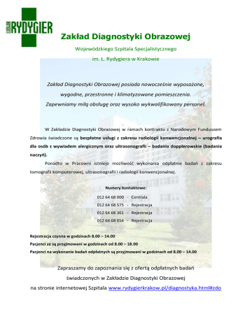 Zakład Diagnostyki Obrazowej Wojewódzkiego Szpitala Specjalistycznego im. L. Rydygiera w Krakowie Zakład Diagnostyki Obrazowej posiada nowocześnie wyposażone, wygodne, przestronne i klimatyzowane pomieszczenia. Zapewniamy miłą obsługę oraz wysoko wykwalifikowany personel. W Zakładzie Diagnostyki Obrazowej w ramach kontraktu z Narodowym Funduszem Zdrowia świadczone są bezpłatne usługi z zakresu radiologii konwencjonalnej – urografia dla osób z wywiadem alergicznym oraz ultrasonografii – badania dopplerowskie (badania naczyo). Ponadto w Pracowni istnieje możliwośd wykonania odpłatnie badao z zakresu tomografii komputerowej, ultrasonografii i radiologii konwencjonalnej. Numery kontaktowe: 012 64 68 000 - Centrala 012 64 68 575 - Rejestracja 012 64 68 361 - Rejestracja 012 64 68 654 - Rejestracja Rejestracja czynna w godzinach 8.00 – 14.00 Pacjenci ze są przyjmowani w godzinach od 8.00 – 18.00 Pacjenci na wykonanie badao odpłatnych są przyjmowani w godzinach od 8.00 – 14.00 Zapraszamy do zapoznania się z ofertą odpłatnych badao świadczonych w Zakładzie Diagnostyki Obrazowej na stronie internetowej Szpitala www.rydygierkrakow.pl/diagnostyka.html#zdo Usługi oferowane w Zakładzie Diagnostyki Obrazowej Tomografia komputerowa. Tomografia komputerowa (w skrócie TK) jest obecnie jedną z najważniejszych obrazowych technik diagnostycznych. W metodzie wykorzystywane jest promieniowanie rentgenowskie, takie samo jak w tradycyjnych prześwietleniach. Promienie X emitowane przez lampę rentgenowską przechodzą przez badany obiekt, ulegając różnego stopnia osłabieniu w zależności od tkanki, tzn. kości osłabiają bardziej, tkanki miękkie mniej, a powietrze minimalnie. W tradycyjnym prześwietleniu rentgenowskim lampa jest nieruchoma, a obraz uzyskiwany jest odwzorowywany na płaszczyźnie (np. na kliszy). W TK ostateczny wynik badania powstaje po komputerowej obróbce odczytów uzyskiwanych z wielu naświetleo, wykonywanych przez lampę, poruszającą się ruchem okrężnym wokół długiej osi ciała ludzkiego. Uzyskuje się przekroje prostopadłe do osi długiej pacjenta (tzw. płaszczyzna czołowa). Możliwa jest także tzw. rekonstrukcja obrazu w dowolnych płaszczyznach lub nawet w obrazach trójwymiarowych. Ponadto możliwe jest rozróżnienie poszczególnych rodzajów tkanek miękkich. Dodatkowo istnieje możliwośd tzw. wtórnej obróbki obrazu, pomiarów odległości, pola powierzchni itp. Radiologia konwencjonalna. Klasyczna radiologia to metoda wciąż niezbędna w diagnozowaniu schorzeo struktur kostnych i płuc. Stosuje się u nas zasadę jak najwięcej informacji przy jak najmniejszej ilości promieniowania (minimalizacja dawki). W naszym Zakładzie dokładamy wszelkich starao, by badanie przebiegało w sposób jak najbardziej bezpieczny i komfortowy. Pragniemy zapewnid wszystkim pacjentom poczucie bezpieczeostwa zdrowotnego i świadczyd usługi medyczne najwyższej jakości. Ultrasonografia. Ultrasonografia (USG) jest jedną z nieinwazyjnych metod wykrywania zmian patologicznych w narządach bez potrzeby podawania środków cieniujących. Sposób ten pozwala na ocenę kształtu, wielkości i położenia narządu czy przestrzeni anatomicznej, a także powierzchni i wnętrza tych narządów. Ważne dla jakości badania USG jest dobry kontakt głowicy z diagnozowanym narządem, dlatego w trakcie badania na skórze pacjenta rozprowadza się specjalny żel. Współczesna diagnostyka USG wykorzystuje tzw. efekt Dopplera. Badanie dopplerowskie jest rodzajem badania ultrasonograficznego, pozwalającego zdiagnozowad przepływy krwi w naczyniach. USG jest nieszkodliwe (nie ma efektów ubocznych) dla pacjenta i badającego, możliwe do wykonania u każdego pacjenta wielokrotnie. Pozwala śledzid obraz i pracę narządów w czasie rzeczywistym. Umożliwia precyzyjne wykonanie pomiarów narządów i głębokości ich położenia.