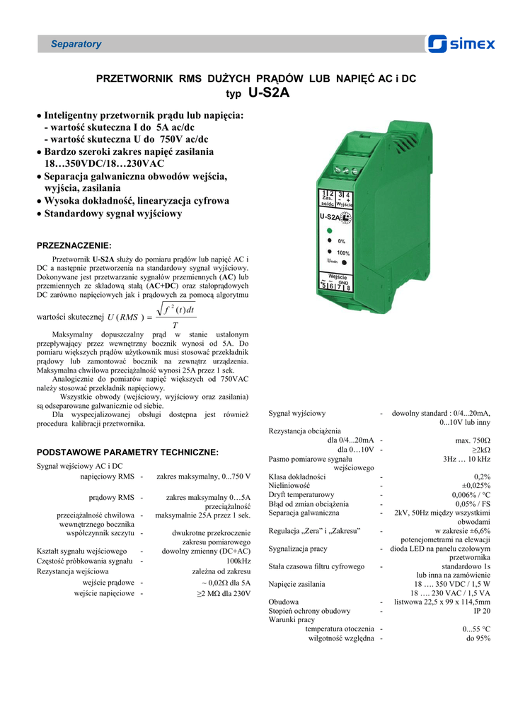 PRZETWORNIK RMS DUŻYCH PRĄDÓW LUB NAPIĘĆ AC i DC typ U-S2A Inteligentny przetwornik prądu lub napięcia: - wartość skuteczna I do 5A ac/dc - wartość skuteczna U do 750V ac/dc Bardzo szeroki zakres napięć zasilania 18…350VDC/18…230VAC Separacja galwaniczna obwodów wejścia, wyjścia, zasilania Wysoka dokładność, linearyzacja cyfrowa Standardowy sygnał wyjściowy PRZEZNACZENIE: Przetwornik U-S2A służy do pomiaru prądów lub napięć AC i DC a następnie przetworzenia na standardowy sygnał wyjściowy. Dokonywane jest przetwarzanie sygnałów przemiennych (AC) lub przemiennych ze składową stałą (AC+DC) oraz stałoprądowych DC zarówno napięciowych jak i prądowych za pomocą algorytmu 2 wartości skutecznej U ( RMS ) f ( t ) dt T Maksymalny dopuszczalny prąd w stanie ustalonym przepływający przez wewnętrzny bocznik wynosi od 5A. Do pomiaru większych prądów użytkownik musi stosować przekładnik prądowy lub zamontować bocznik na zewnątrz urządzenia. Maksymalna chwilowa przeciążalność wynosi 25A przez 1 sek. Analogicznie do pomiarów napięć większych od 750VAC należy stosować przekładnik napięciowy. Wszystkie obwody (wejściowy, wyjściowy oraz zasilania) są odseparowane galwanicznie od siebie. Dla wyspecjalizowanej obsługi dostępna jest również procedura kalibracji przetwornika. PODSTAWOWE PARAMETRY TECHNICZNE: Sygnał wejściowy AC i DC napięciowy RMS prądowy RMS przeciążalność chwilowa wewnętrznego bocznika współczynnik szczytu Kształt sygnału wejściowego Częstość próbkowania sygnału Rezystancja wejściowa wejście prądowe wejście napięciowe - zakres maksymalny, 0...750 V zakres maksymalny 0…5A przeciążalność maksymalnie 25A przez 1 sek. dwukrotne przekroczenie zakresu pomiarowego dowolny zmienny (DC+AC) 100kHz zależna od zakresu ~ 0,02 dla 5A ≥2 M dla 230V Sygnał wyjściowy Rezystancja obciążenia dla 0/4...20mA dla 0…10V Pasmo pomiarowe sygnału wejściowego Klasa dokładności Nieliniowość Dryft temperaturowy Błąd od zmian obciążenia Separacja galwaniczna - dowolny standard : 0/4...20mA, 0...10V lub inny - max. 750 ≥2k 3Hz … 10 kHz - - 0,2% ±0,025% 0,006% / C 0,05% / FS 2kV, 50Hz między wszystkimi obwodami w zakresie ±6,6% potencjometrami na elewacji dioda LED na panelu czołowym przetwornika standardowo 1s lub inna na zamówienie 18 …. 350 VDC / 1,5 W 18 …. 230 VAC / 1,5 VA listwowa 22,5 x 99 x 114,5mm IP 20 - 0...55 C do 95% Regulacja „Zera” i „Zakresu” - Sygnalizacja pracy - Stała czasowa filtru cyfrowego - Napięcie zasilania Obudowa Stopień ochrony obudowy Warunki pracy temperatura otoczenia wilgotność względna OPIS DZIAŁANIA: KALIBRACJA PRZETWORNIKA: Przetwornik mierzy sygnał wejściowy i przetwarza według zadanych parametrów oraz wylicza analogowy sygnał wyjściowy. Świecenie zielonej diody LED świadczy o podaniu zasilania oraz o sprawności wewnętrznego procesora. Na elewacji przetwornika dostępne są dla użytkownika potencjometry do kalibracji „Zera” i „Zakresu”. W przypadku sygnałów zmiennoprądowych (analiza RMS) zaleca się dodatkowo korzystanie z przycisku do automatycznej kalibracji napięcia odniesienia. UWAGA: Przetwornik jest skalibrowany fabrycznie, a nieumiejętne przeprowadzenie procedury kalibracji może spowodować jego błędną pracę. Dla sygnałów zmiennych RMS kalibrację należy rozpocząć od ustawienia napięcia odniesienia w następujący sposób: - zewrzeć zaciski wejściowe i wcisnąć klawisz „Uodn” i przytrzymać przez 6 sek. aż zacznie migać dioda LED. Przez kolejne 4 sek. (miga dioda LED) przetwornik jest kalibrowany i zakończy na przejściu do trybu normalnej pracy. W następnej kolejności możemy zadając precyzyjny sygnał na wejście przetwornika i podłączając dokładny miernik do zacisków wyjściowych przetwornika dokalibrować początek i koniec zakresu odpowiednio potencjometrami „0%” i „100%”. 1 2 3 4 U 8 7 AC AC+DC E kran 6 5 W e jście ~ + Zas. - + ac/dc Wyjście 4 U-S2A U ,I ~ W yjście GND - 3 Z asilanie A C /D C 1 0% 99 I 100% 2 Uodn Wejście ~~ Rys. 1). Opis zacisków podłączeniowych GND *8 7 6 5 114,5 22,5 Rys. 2). Szkic obudowy. Widok elewacji przetwornika S P O S Ó B Z A M AW IA N IA U -S 2A Z akres w ejściow y Z akres w yjśc iow y (1...7) Z akresy w yjściow e : 1- 0...5m A , 2 - 0...20m A 3 - 4...20m A , 4 - 0...5V 5 - 0...10V, 6 - 1...5V 7 - inny (nie typow y) PRZYKŁAD ZAMÓWIENIA: Przetwornik US2A, wejście 0...5A, wyjście 4...20mA - :typ. US2A–0...5Aac-3