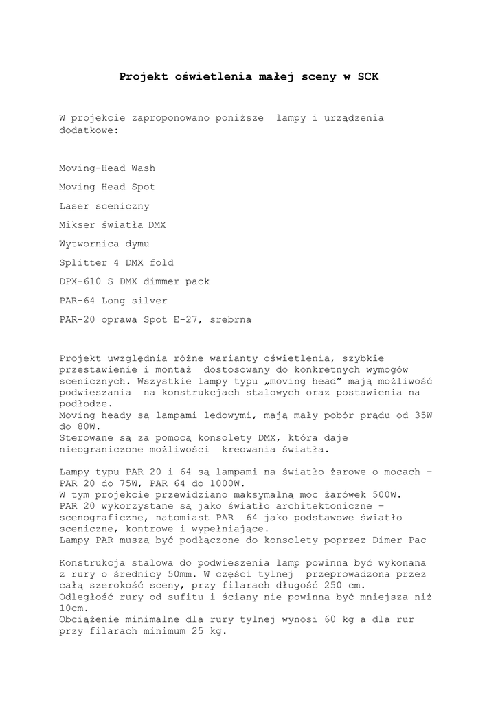 Projekt oświetlenia małej sceny w SCK W projekcie zaproponowano poniższe dodatkowe: lampy i urządzenia Moving-Head Wash Moving Head Spot Laser sceniczny Mikser światła DMX Wytwornica dymu Splitter 4 DMX fold DPX-610 S DMX dimmer pack PAR-64 Long silver PAR-20 oprawa Spot E-27, srebrna Projekt uwzględnia różne warianty oświetlenia, szybkie przestawienie i montaż dostosowany do konkretnych wymogów scenicznych. Wszystkie lampy typu „moving head” mają możliwość podwieszania na konstrukcjach stalowych oraz postawienia na podłodze. Moving heady są lampami ledowymi, mają mały pobór prądu od 35W do 80W. Sterowane są za pomocą konsolety DMX, która daje nieograniczone możliwości kreowania światła. Lampy typu PAR 20 i 64 są lampami na światło żarowe o mocach – PAR 20 do 75W, PAR 64 do 1000W. W tym projekcie przewidziano maksymalną moc żarówek 500W. PAR 20 wykorzystane są jako światło architektoniczne – scenograficzne, natomiast PAR 64 jako podstawowe światło sceniczne, kontrowe i wypełniające. Lampy PAR muszą być podłączone do konsolety poprzez Dimer Pac Konstrukcja stalowa do podwieszenia lamp powinna być wykonana z rury o średnicy 50mm. W części tylnej przeprowadzona przez całą szerokość sceny, przy filarach długość 250 cm. Odległość rury od sufitu i ściany nie powinna być mniejsza niż 10cm. Obciążenie minimalne dla rury tylnej wynosi 60 kg a dla rur przy filarach minimum 25 kg. W zasilaniu na scenie, dodatkowo należy przewidzieć możliwość podłączenia wytwornicy dymu pobierającej 2000W. Okablowanie DMX – z uwagi na bardzo różnorodne możliwości wykorzystania świateł typu Moving Head, przewody DMX najlepiej prowadzić po wierzchu. UWAGA!! Wycena dotyczy tylko położenia instalacji przewodów elektrycznych bez dostarczenia urządzeń oświetlenia i sterowania sceną. Projekt oświetlenia nr 1 Projekt oświetlenia nr 2 Projekt oświetlenia nr 3 Projekt oświetlenia nr 4