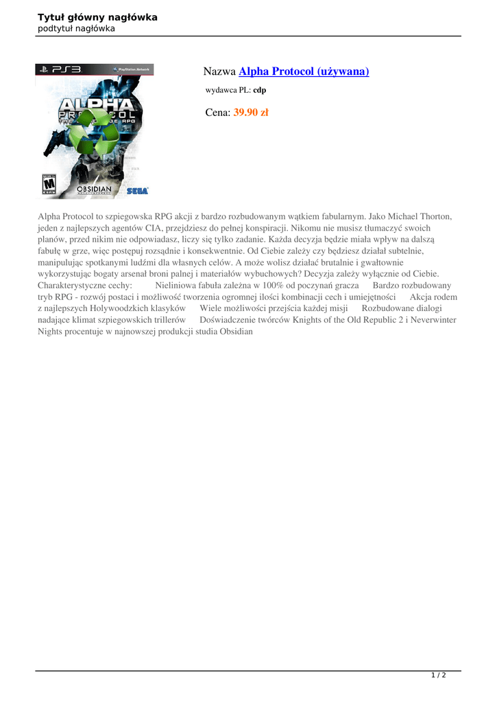 Tytuł główny nagłówka podtytuł nagłówka Nazwa Alpha Protocol (używana) wydawca PL: cdp Cena: 39.90 zł Alpha Protocol to szpiegowska RPG akcji z bardzo rozbudowanym wątkiem fabularnym. Jako Michael Thorton, jeden z najlepszych agentów CIA, przejdziesz do pełnej konspiracji. Nikomu nie musisz tłumaczyć swoich planów, przed nikim nie odpowiadasz, liczy się tylko zadanie. Każda decyzja będzie miała wpływ na dalszą fabułę w grze, więc postępuj rozsądnie i konsekwentnie. Od Ciebie zależy czy będziesz działał subtelnie, manipulując spotkanymi ludźmi dla własnych celów. A może wolisz działać brutalnie i gwałtownie wykorzystując bogaty arsenał broni palnej i materiałów wybuchowych? Decyzja zależy wyłącznie od Ciebie. Charakterystyczne cechy: Nieliniowa fabuła zależna w 100% od poczynań gracza Bardzo rozbudowany tryb RPG - rozwój postaci i możliwość tworzenia ogromnej ilości kombinacji cech i umiejętności Akcja rodem z najlepszych Holywoodzkich klasyków Wiele możliwości przejścia każdej misji Rozbudowane dialogi nadające klimat szpiegowskich trillerów Doświadczenie twórców Knights of the Old Republic 2 i Neverwinter Nights procentuje w najnowszej produkcji studia Obsidian 1/2 Tytuł główny nagłówka podtytuł nagłówka Nazwa Wartość Wydawca PL CD Projekt Data premiery 2010 Producent Tryb gry Kategoria wiekowa Wersja językowa Wymagania sprzętowe Format Obsidian Entertainment Single Player 18+ ENG Konsola PlayStation 3 Blu-Ray 2/2