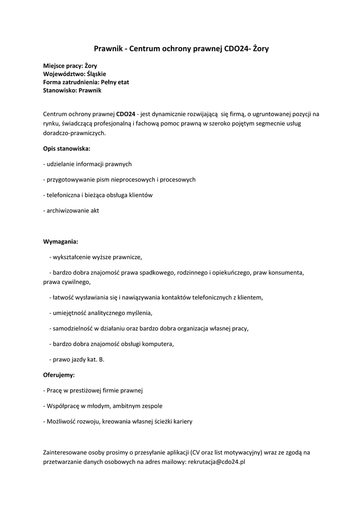Prawnik - Centrum ochrony prawnej CDO24- Żory Miejsce pracy: Żory Województwo: Śląskie Forma zatrudnienia: Pełny etat Stanowisko: Prawnik Centrum ochrony prawnej CDO24 - jest dynamicznie rozwijającą się firmą, o ugruntowanej pozycji na rynku, świadczącą profesjonalną i fachową pomoc prawną w szeroko pojętym segmecnie usług doradczo-prawniczych. Opis stanowiska: - udzielanie informacji prawnych - przygotowywanie pism nieprocesowych i procesowych - telefoniczna i bieżąca obsługa klientów - archiwizowanie akt Wymagania: - wykształcenie wyższe prawnicze, - bardzo dobra znajomość prawa spadkowego, rodzinnego i opiekuńczego, praw konsumenta, prawa cywilnego, - łatwość wysławiania się i nawiązywania kontaktów telefonicznych z klientem, - umiejętność analitycznego myślenia, - samodzielność w działaniu oraz bardzo dobra organizacja własnej pracy, - bardzo dobra znajomość obsługi komputera, - prawo jazdy kat. B. Oferujemy: - Pracę w prestiżowej firmie prawnej - Współpracę w młodym, ambitnym zespole - Możliwość rozwoju, kreowania własnej ścieżki kariery Zainteresowane osoby prosimy o przesyłanie aplikacji (CV oraz list motywacyjny) wraz ze zgodą na przetwarzanie danych osobowych na adres mailowy: [email protected] Skontaktujemy się tylko z wybranymi Kandydatami. Prosimy o zamieszczenie klauzuli następującej treści: „Wyrażam zgodę na przetwarzanie moich danych osobowych w celach rekrutacji, zgodnie z Ustawą o Ochronie Danych Osobowych z dnia 29 sierpnia 1997 r. (Dz. U. Nr 133 poz. 883)”.