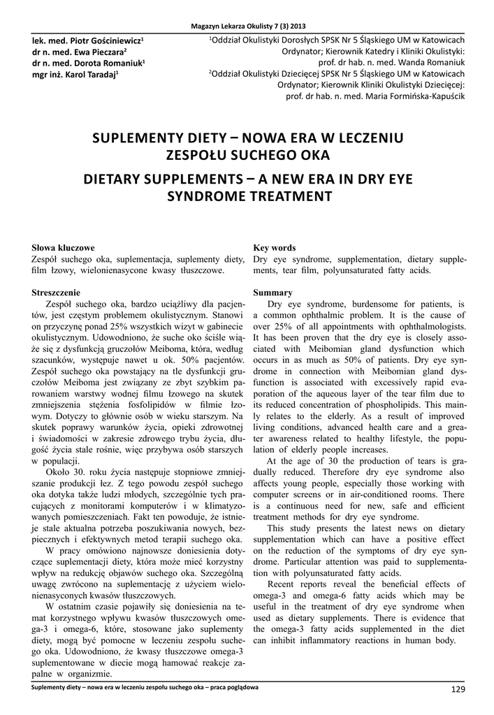 Magazyn Lekarza Okulisty 7 (3) 2013 lek. med. Piotr Gościniewicz1 dr n. med. Ewa Pieczara2 dr n. med. Dorota Romaniuk1 mgr inż. Karol Taradaj1 Oddział Okulistyki Dorosłych SPSK Nr 5 Śląskiego UM w Katowicach Ordynator; Kierownik Katedry i Kliniki Okulistyki: prof. dr hab. n. med. Wanda Romaniuk 2 Oddział Okulistyki Dziecięcej SPSK Nr 5 Śląskiego UM w Katowicach Ordynator; Kierownik Kliniki Okulistyki Dziecięcej: prof. dr hab. n. med. Maria Formińska-Kapuścik 1 Suplementy diety – nowa era w leczeniu zespołu suchego oka Dietary supplements – a new era in dry eye syndrome treatment Słowa kluczowe Key words Zespół suchego oka, suplementacja, suplementy diety, Dry eye syndrome, supplementation, dietary supplefilm łzowy, wielonienasycone kwasy tłuszczowe. ments, tear film, polyunsaturated fatty acids. Streszczenie Zespół suchego oka, bardzo uciążliwy dla pacjentów, jest częstym problemem okulistycznym. Stanowi on przyczynę ponad 25% wszystkich wizyt w gabinecie okulistycznym. Udowodniono, że suche oko ściśle wiąże się z dysfunkcją gruczołów Meiboma, która, według szacunków, występuje nawet u ok. 50% pacjentów. Zespół suchego oka powstający na tle dysfunkcji gruczołów Meiboma jest związany ze zbyt szybkim parowaniem warstwy wodnej filmu łzowego na skutek zmniejszenia stężenia fosfolipidów w filmie łzowym. Dotyczy to głównie osób w wieku starszym. Na skutek poprawy warunków życia, opieki zdrowotnej i świadomości w zakresie zdrowego trybu życia, długość życia stale rośnie, więc przybywa osób starszych w populacji. Około 30. roku życia następuje stopniowe zmniejszanie produkcji łez. Z tego powodu zespół suchego oka dotyka także ludzi młodych, szczególnie tych pracujących z monitorami komputerów i w klimatyzowanych pomieszczeniach. Fakt ten powoduje, że istnieje stale aktualna potrzeba poszukiwania nowych, bezpiecznych i efektywnych metod terapii suchego oka. W pracy omówiono najnowsze doniesienia dotyczące suplementacji diety, która może mieć korzystny wpływ na redukcję objawów suchego oka. Szczególną uwagę zwrócono na suplementację z użyciem wielonienasyconych kwasów tłuszczowych. W ostatnim czasie pojawiły się doniesienia na temat korzystnego wpływu kwasów tłuszczowych omega-3 i omega-6, które, stosowane jako suplementy diety, mogą być pomocne w leczeniu zespołu suchego oka. Udowodniono, że kwasy tłuszczowe omega-3 suplementowane w diecie mogą hamować reakcje zapalne w organizmie. Summary Dry eye syndrome, burdensome for patients, is a common ophthalmic problem. It is the cause of over 25% of all appointments with ophthalmologists. It has been proven that the dry eye is closely associated with Meibomian gland dysfunction which occurs in as much as 50% of patients. Dry eye syndrome in connection with Meibomian gland dysfunction is associated with excessively rapid evaporation of the aqueous layer of the tear film due to its reduced concentration of phospholipids. This mainly relates to the elderly. As a result of improved living conditions, advanced health care and a greater awareness related to healthy lifestyle, the population of elderly people increases. At the age of 30 the production of tears is gradually reduced. Therefore dry eye syndrome also affects young people, especially those working with computer screens or in air-conditioned rooms. There is a continuous need for new, safe and efficient treatment methods for dry eye syndrome. This study presents the latest news on dietary supplementation which can have a positive effect on the reduction of the symptoms of dry eye syndrome. Particular attention was paid to supplementation with polyunsaturated fatty acids. Recent reports reveal the beneficial effects of omega-3 and omega-6 fatty acids which may be useful in the treatment of dry eye syndrome when used as dietary supplements. There is evidence that the omega-3 fatty acids supplemented in the diet can inhibit inflammatory reactions in human body. Suplementy diety – nowa era w leczeniu zespołu suchego oka – praca poglądowa 129