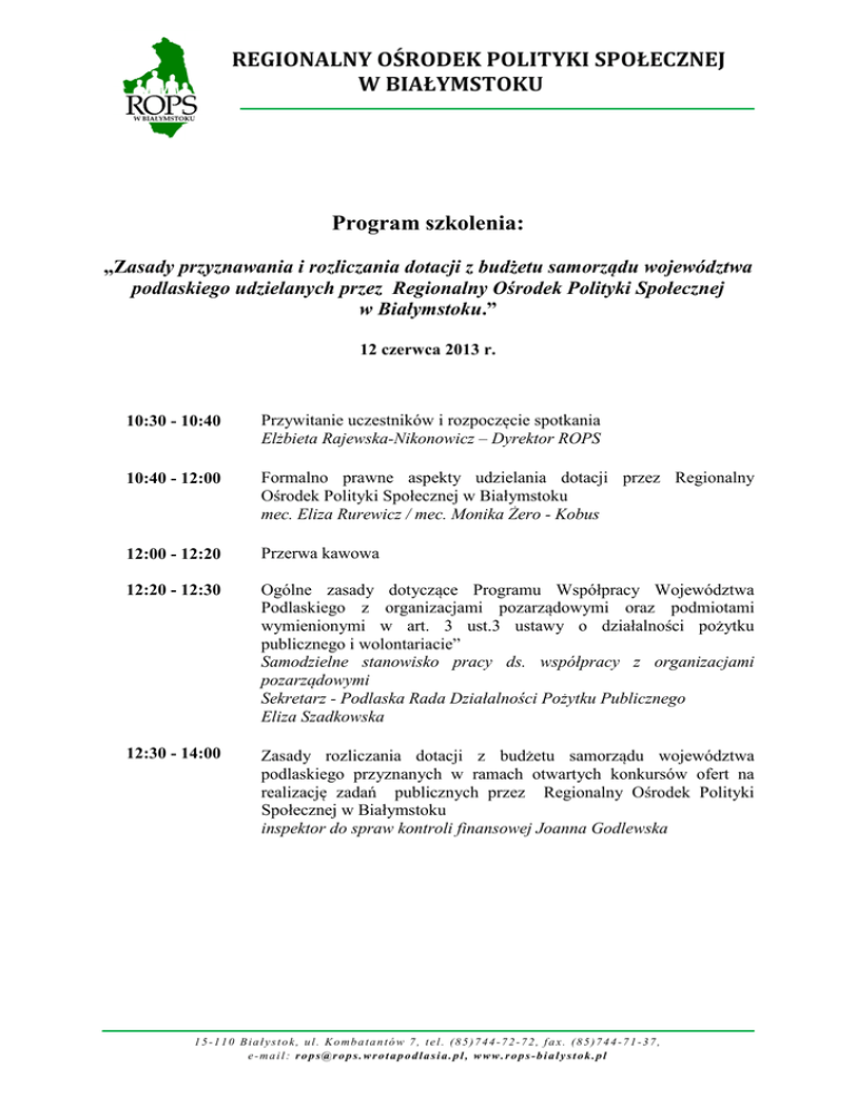 REGIONALNY OŚRODEK POLITYKI SPOŁECZNEJ W BIAŁYMSTOKU Program szkolenia: „Zasady przyznawania i rozliczania dotacji z budżetu samorządu województwa podlaskiego udzielanych przez Regionalny Ośrodek Polityki Społecznej w Białymstoku.” 12 czerwca 2013 r. 10:30 - 10:40 Przywitanie uczestników i rozpoczęcie spotkania Elżbieta Rajewska-Nikonowicz – Dyrektor ROPS 10:40 - 12:00 Formalno prawne aspekty udzielania dotacji przez Regionalny Ośrodek Polityki Społecznej w Białymstoku mec. Eliza Rurewicz / mec. Monika Żero - Kobus 12:00 - 12:20 Przerwa kawowa 12:20 - 12:30 Ogólne zasady dotyczące Programu Współpracy Województwa Podlaskiego z organizacjami pozarządowymi oraz podmiotami wymienionymi w art. 3 ust.3 ustawy o działalności pożytku publicznego i wolontariacie” Samodzielne stanowisko pracy ds. współpracy z organizacjami pozarządowymi Sekretarz - Podlaska Rada Działalności Pożytku Publicznego Eliza Szadkowska 12:30 - 14:00 Zasady rozliczania dotacji z budżetu samorządu województwa podlaskiego przyznanych w ramach otwartych konkursów ofert na realizację zadań publicznych przez Regionalny Ośrodek Polityki Społecznej w Białymstoku inspektor do spraw kontroli finansowej Joanna Godlewska 15-110 Białystok, ul. Kombatantów 7, tel. (85)744-72-72, fax. (85)744-71-37, e-mail: [email protected], www.rops-bialystok.pl