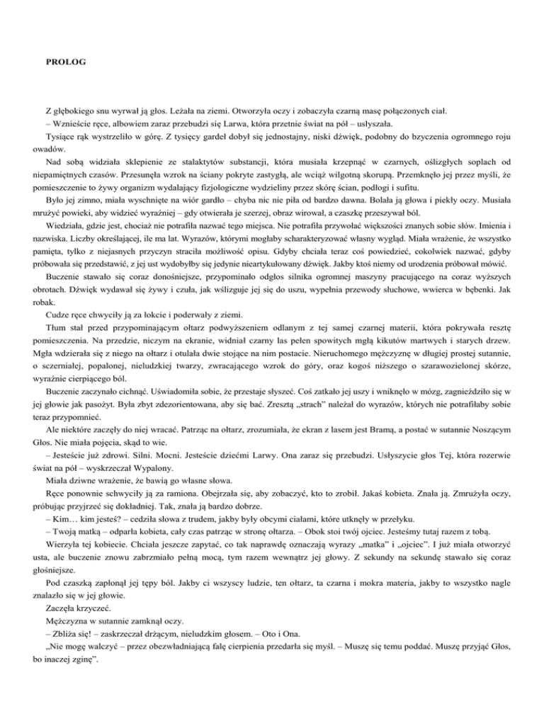 PROLOG Z głębokiego snu wyrwał ją głos. Leżała na ziemi. Otworzyła oczy i zobaczyła czarną masę połączonych ciał. – Wznieście ręce, albowiem zaraz przebudzi się Larwa, która przetnie świat na pół – usłyszała. Tysiące rąk wystrzeliło w górę. Z tysięcy gardeł dobył się jednostajny, niski dźwięk, podobny do bzyczenia ogromnego roju owadów. Nad sobą widziała sklepienie ze stalaktytów substancji, która musiała krzepnąć w czarnych, oślizgłych soplach od niepamiętnych czasów. Przesunęła wzrok na ściany pokryte zastygłą, ale wciąż wilgotną skorupą. Przemknęło jej przez myśli, że pomieszczenie to żywy organizm wydalający fizjologiczne wydzieliny przez skórę ścian, podłogi i sufitu. Było jej zimno, miała wyschnięte na wiór gardło – chyba nic nie piła od bardzo dawna. Bolała ją głowa i piekły oczy. Musiała mrużyć powieki, aby widzieć wyraźniej – gdy otwierała je szerzej, obraz wirował, a czaszkę przeszywał ból. Wiedziała, gdzie jest, chociaż nie potrafiła nazwać tego miejsca. Nie potrafiła przywołać większości znanych sobie słów. Imienia i nazwiska. Liczby określającej, ile ma lat. Wyrazów, którymi mogłaby scharakteryzować własny wygląd. Miała wrażenie, że wszystko pamięta, tylko z niejasnych przyczyn straciła możliwość opisu. Gdyby chciała teraz coś powiedzieć, cokolwiek nazwać, gdyby próbowała się przedstawić, z jej ust wydobyłby się jedynie nieartykułowany dźwięk. Jakby ktoś niemy od urodzenia próbował mówić. Buczenie stawało się coraz donośniejsze, przypominało odgłos silnika ogromnej maszyny pracującego na coraz wyższych obrotach. Dźwięk wydawał się żywy i czuła, jak wślizguje jej się do uszu, wypełnia przewody słuchowe, wwierca w bębenki. Jak robak. Cudze ręce chwyciły ją za łokcie i poderwały z ziemi. Tłum stał przed przypominającym ołtarz podwyższeniem odlanym z tej samej czarnej materii, która pokrywała resztę pomieszczenia. Na przedzie, niczym na ekranie, widniał czarny las pełen spowitych mgłą kikutów martwych i starych drzew. Mgła wdzierała się z niego na ołtarz i otulała dwie stojące na nim postacie. Nieruchomego mężczyznę w długiej prostej sutannie, o sczerniałej, popalonej, nieludzkiej twarzy, zwracającego wzrok do góry, oraz kogoś niższego o szarawozielonej skórze, wyraźnie cierpiącego ból. Buczenie zaczynało cichnąć. Uświadomiła sobie, że przestaje słyszeć. Coś zatkało jej uszy i wniknęło w mózg, zagnieździło się w jej głowie jak pasożyt. Była zbyt zdezorientowana, aby się bać. Zresztą „strach” należał do wyrazów, których nie potrafiłaby sobie teraz przypomnieć. Ale niektóre zaczęły do niej wracać. Patrząc na ołtarz, zrozumiała, że ekran z lasem jest Bramą, a postać w sutannie Noszącym Głos. Nie miała pojęcia, skąd to wie. – Jesteście już zdrowi. Silni. Mocni. Jesteście dziećmi Larwy. Ona zaraz się przebudzi. Usłyszycie głos Tej, która rozerwie świat na pół – wyskrzeczał Wypalony. Miała dziwne wrażenie, że bawią go własne słowa. Ręce ponownie schwyciły ją za ramiona. Obejrzała się, aby zobaczyć, kto to zrobił. Jakaś kobieta. Znała ją. Zmrużyła oczy, próbując przyjrzeć się dokładniej. Tak, znała ją bardzo dobrze. – Kim… kim jesteś? – cedziła słowa z trudem, jakby były obcymi ciałami, które utknęły w przełyku. – Twoją matką – odparła kobieta, cały czas patrząc w stronę ołtarza. – Obok stoi twój ojciec. Jesteśmy tutaj razem z tobą. Wierzyła tej kobiecie. Chciała jeszcze zapytać, co tak naprawdę oznaczają wyrazy „matka” i „ojciec”. I już miała otworzyć usta, ale buczenie znowu zabrzmiało pełną mocą, tym razem wewnątrz jej głowy. Z sekundy na sekundę stawało się coraz głośniejsze. Pod czaszką zapłonął jej tępy ból. Jakby ci wszyscy ludzie, ten ołtarz, ta czarna i mokra materia, jakby to wszystko nagle znalazło się w jej głowie. Zaczęła krzyczeć. Mężczyzna w sutannie zamknął oczy. – Zbliża się! – zaskrzeczał drżącym, nieludzkim głosem. – Oto i Ona. „Nie mogę walczyć – przez obezwładniającą falę cierpienia przedarła się myśl. – Muszę się temu poddać. Muszę przyjąć Głos, bo inaczej zginę”. – Oto i Ona. Za chwilę otworzymy Bramę – powtórzył Wypalony. Wtedy ten drugi otworzył usta. Obraz lasu zafalował, a następnie zniknął. W jego miejsce pojawił się ziejący czernią otwór. Otchłań, która wypluła na zebranych falę zimnego, przeszywającego wiatru. Chudy mężczyzna zaczął się trząść jak ktoś rażony prądem. Jego ciało wygięło się w łuk. Po chwili znieruchomiał, a z jego ust wypełzł długi, tłusty, biały robak. – Oto i Ona! – wykrzyczał Wypalony. – Oto Larwa. Początek Ciemności. Zgniecenie Świata. Oto moment, w którym rzeczy zaczynają się koñczyć. Oto otwiera się Brama, moi drodzy. Wrzask, wrzask z tysięcy gardeł. Zacisnęła dłonie na głowie tak mocno, jakby chciała ją zgnieść. Z oczu ciekły jej strumienie łez. Z nosa wypłynęła strużka krwi. Przykucnęła na chwilę, chowając głowę między kolanami, ale wtedy ręce matki i ojca poderwały ją do góry. Krzyczała z bólu, ale nie potrafiła tego usłyszeć. Cierpienie pożerało ją od środka. Wychudzony mężczyzna otworzył usta jeszcze szerzej, aby zrobić miejsce dla coraz grubszego ciała Larwy. Miało już ponad metr długości. – Oto Głos – powiedział mężczyzna. „Głosie – coś pomyślało w niej – odezwij się we mnie. Zduś wrzask. Pomóż mi. Nie chcę, aby bolało, nie chcę. Głosie, proszę”. – Oto Głos – powtórzył. – Jestem – zabrzmiał Głos. Był niski, przytłumiony, jakby dobiegające z oddali bicie potężnego dzwonu. – Jestem – ciągnął Głos – a wy jesteście mną. Głos rozlewał się po jej mózgu jak kojący balsam. Zmniejsza