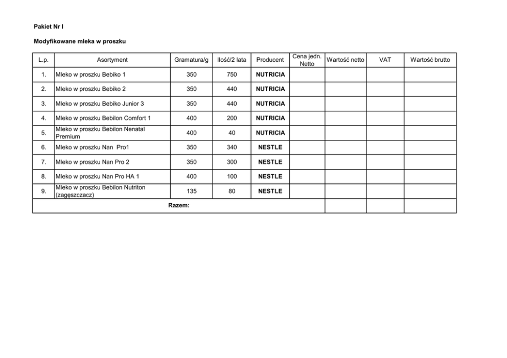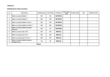 Pakiet Nr I Modyfikowane mleka w proszku L.p. Asortyment Gramatura/g Ilość/2 lata Producent 1. Mleko w proszku Bebiko 1 350 750 NUTRICIA 2. Mleko w proszku Bebiko 2 350 440 NUTRICIA 3. Mleko w proszku Bebiko Junior 3 350 440 NUTRICIA 4. Mleko w proszku Bebilon Comfort 1 400 200 NUTRICIA 5. Mleko w proszku Bebilon Nenatal Premium 400 40 NUTRICIA 6. Mleko w proszku Nan Pro1 350 340 NESTLE 7. Mleko w proszku Nan Pro 2 350 300 NESTLE 8. Mleko w proszku Nan Pro HA 1 400 100 NESTLE 9. Mleko w proszku Bebilon Nutriton (zagęszczacz) 135 80 NESTLE Razem: Cena jedn. Wartość netto Netto VAT Wartość brutto Pakiet II Mleka modyfikowane przeznaczone dla niemowląt od urodzenia w płynie L.p. Asortyment Enfamil Premium LIPIL DHA op.a 6 szt. Bebilon Nenatal Premium RTF 2. op.a 24szt. HiPP Pre Bio Combiotik 3. op.a 24 szt. Bebilon 1 RTF Profutura op.a 24 4. szt. Bebilon HMF – saszetka 5. op.a 50 saszetek Razem: 1. poj. op. Ilość/szt. 2 lata Producent 59 ml 504 MEAD JOHNSON 70 ml 2848 NUTRICIA 90 ml 2736 HIPP GMBH 70 ml 2880 NUTRICIA 2,2 g 6 NUTRICIA Cena jedn. netto X X Producent Cena jedn. Netto Wartość netto VAT Wartość brutto X Pakiet Nr III Produkty odżywcze dla dzieci L.p. 1. 2. Asortyment Produkt zbożowy bezglutenowy dla niemowląt z alergią na białko mleka krowiego i białko sojowe od 5-go m-ca życia – Sinlac Nutridrinnk – wanilia, truskawka, czekolada, naturalny Poj.op. Ilość/szt. 2 lata 500 g 80 NESTLE 200 ml 200 NUTRICIA Razem: Wartość netto VAT Wartość brutto Pakiet IV Produkty uzupełniające dietę dziecka Ilość/szt. 2 lata Producent 1. Kleik ryżowy a '160g 800 NESTLE 2. Kleik kukurydziany a' 160g 70 NESTLE 3. Kaszka ryżowa - malina a 180g 340 NESTLE 4. Kaszka ryżowa - banan a' 180g 300 NESTLE 5. Kaszka mleczno-ryżowa - banan a'230g 340 NESTLE 6. Kaszka mleczno-ryżowa - malina a' 230g 440 NESTLE 7. Kaszka mleczno-ryżowa - morela a' 230g 440 NESTLE Razem: X X L.p. Asortyment Cena jedn. Netto X Wartość netto VAT Wartość brutto