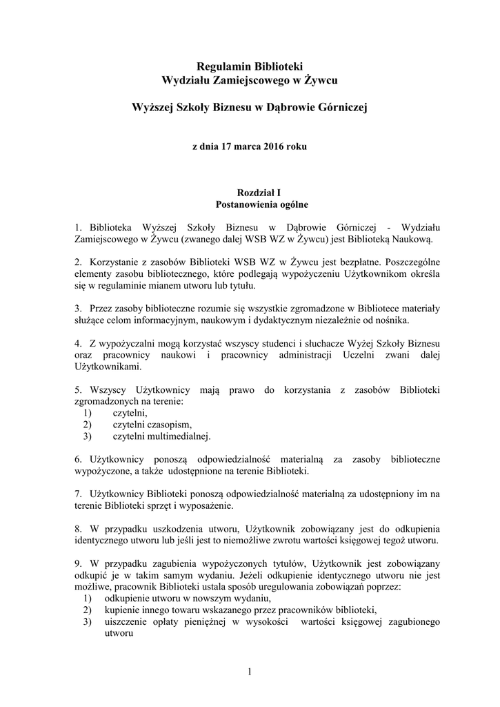 Regulamin biblioteki - Wyższa Szkoła Biznesu w Dąbrowie Górniczej