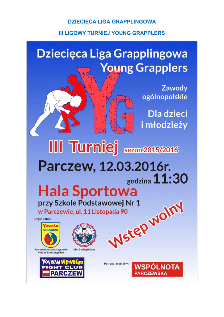 DZIECIĘCA LIGA GRAPPLINGOWA III LIGOWY TURNIEJ YOUNG GRAPPLERS W czasie zawodów odbędą się walki grapplingowe dzieci w kategoriach wiekowych: Grupa A zawodnicy w wieku 8 – 9 lat (z podziałem na dziewczęta i chłopców) Grupa B zawodnicy w wieku 10 – 11 lat (z podziałem na dziewczęta i chłopców) Grupa C zawodnicy w wieku 12 – 13 lat (z podziałem na dziewczęta i chłopców) Grupa D zawodnicy w wieku 14 – 15 lat (z podziałem na dziewczęta i chłopców) OBOWIĄZUJĄCY REGULAMIN WALK JEST ZAMIESZCZONY NA STRONIE www.vietboxing.pl Podział zawodników ze względu na wagę: Grupa A -20kg; -24kg; -28kg; -32kg; -36kg; -40kg; -44kg; -48kg; +48kg; Grupa B -32kg; -36kg; -40kg; -44kg; -48kg; -52kg; -56kg; -60kg; +60kg; Grupa C -36kg; -40kg; -44kg; -48kg; -52kg; -56kg; -60kg; -64kg; +64kg; Grupa D: -44kg; -48kg; -52kg; -56kg; -60kg; -64kg; -68kg; -72kg; +72kg; Przy malej ilości zawodników/zawodniczek organizator może połączyć kategorie wagowe oraz zrezygnować z podziału na dziewczęta i chłopców Plan zawodów Sobota 12 marca 2016 Obowiązuje następujący plan godzinowy: 09:00 – 11:00 rejestracja i ważenie zawodników 11:00 – 11:30 omówienie przepisów i uroczyste otwarcie 11:30 - start zawodów Warunkiem udziału w zawodach jest posiadanie: - dowodu tożsamości (dowodu osobistego, paszportu lub legitymacji szkolnej); - aktualnych badań lekarskich (pod kątem startu w zawodach grapplingowych) wystawionych przez lekarza sportowego lub przychodnię sportową; - ubezpieczenie NNW (UWAGA - nie będzie można wykupić na miejscu!): - uiszczenia opłaty startowej za zawodnika w wysokości 40 zł przez trenerów klubowych (zgłoszenia osób indywidualnych nie są przyjmowane); - właściwego stroju – koszulka i długie spodnie od kimona - oświadczenia opiekuna - rodzica. Oświadczenie musi być podpisane przez rodzica/opiekuna, a autentyczność musi potwierdzić swoim podpisem kierownik ekipy lub trener. Oświadczenie może być podpisane tylko przez rodzica/opiekuna, jeżeli podpis zostanie złożony w obecności sędziego; Niespełnienie któregokolwiek z powyższych warunków skutkować będzie niedopuszczeniem do startu w zawodach. Rejestracja zawodników na zawody odbywa się drogą mailową na adres: [email protected] Zgłaszać zawodników można do 9 marca 2016 do godziny 22:00. Po tym terminie zgłoszenia będą przyjmowane tylko w dniu imprezy. Kluby, które nie zgłoszą się elektronicznie w określonym terminie, za dopisanie do listy w dniu zawodów będą musiały zapłacić dodatkowo 20 zł. Każdy zgłoszony klub otrzyma maila zwrotnego potwierdzającego przyjęcie zgłoszenia. Zgłoszenie do zawodów jest równoznaczne z akceptacją postanowień niniejszego komunikatu. W sprawach nieobjętych regulaminem decyduje Sędzia Główny Zawodów. Organizatorzy nie ponoszą odpowiedzialności za rzeczy zagubione, jak również szkody i wypadki. Organizatorzy zastrzegają sobie prawo do wykorzystania wizerunków zawodników w materiałach fotograficznych i filmowych z zawodów oraz w celach promocyjnych Zawodów. Wszelkie informacje na temat zawodów : - Łukasz Waszczuk 509 640 472 [email protected] Piotr Bonikowski 731 444 833 [email protected] -