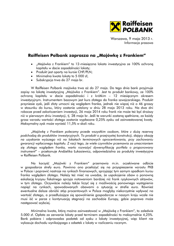 Warszawa, 9 maja 2013 r. Informacja prasowa Raiffeisen Polbank zaprasza na „Majówkę z Frankiem” „Majówka z Frankiem” to 12-miesięczna lokata inwestycyjna ze 100% ochroną kapitału w dacie zapadalności lokaty; Produkt jest oparty na kursie CHF/PLN; Minimalna kwota lokaty to 5 000 zł, Subskrypcja trwa do 27 maja br. W Raiffeisen Polbank majówka trwa aż do 27 maja. Do tego dnia bank przyjmuje zapisy na lokatę inwestycyjną „Majówka z Frankiem”. Jest to produkt bankowy, ze 100% ochroną kapitału w dacie zapadalności i z krótkim – 12 miesięcznym okresem inwestycyjnym. Instrumentem bazowym jest kurs złotego do franka szwajcarskiego. Produkt przyniesie zysk, jeśli złoty umocni się względem franka, jednak nie więcej niż o 46 groszy w stosunku do kursu, który zostanie ustalony w dniu 28 maja 2013 roku. Na dwa dni robocze przed zakończeniem inwestycji, 26 maja 2014 roku frank nie może też być droższy niż w pierwszym dniu inwestycji, tj. 28 maja br. Jeśli te warunki zostaną spełnione, za każdy grosz wzrostu wartości złotego zostanie wypłacone 0,25% zysku od zainwestowanej kwoty. Maksymalny zysk może wynieść 11,5% w skali roku. „Majówkę z Frankiem polecamy przede wszystkim osobom, które z dużą rezerwą podchodzą do produktów inwestycyjnych. To produkt o przejrzystej konstrukcji, dający okazję na uzyskanie wyższego niż na lokatach terminowych oprocentowania, przy zachowaniu gwarancji wpłaconego kapitału. Z racji tego, że wiele czynników przemawia za umacnianiem się złotego względem franka, warto rozważyć dywersyfikację portfela o proponowany instrument” – przekonuje Andżelika Łukasiewicz, odpowiedzialna za produkty inwestycyjne w Raiffeisen Polbank. Na korzyść „Majówki z Frankiem” przemawia m.in. oczekiwane odbicie w gospodarce strefy euro. Powinno ono przełożyć się na przyspieszenie wzrostu PKB w Polsce i poprawić nastroje na rynkach finansowych, sprzyjając tym samym spadkom kursu franka względem złotego. Należy też mieć na uwadze, że uspokojenie obaw o ponowną eskalację kryzysu fiskalnego sprzyja notowaniom bardziej niż frank ryzykownych aktywów, w tym złotego. Oczywiście należy także liczyć się z możliwością ponownego wystąpienia napięć na rynkach, spowodowanych obawami o sytuację w strefie euro. Również ewentualne dalsze obniżki stóp procentowych w Polsce mogłyby niekorzystnie wpływać na wartość złotego, a przedłużające się spowolnienie gospodarcze w naszym kraju wcale nie musi iść w parze z kontynuacją stagnacji na zachodzie Europy, gdzie poprawa może następować szybciej. Minimalna kwota, którą można zainwestować w „Majówkę z Frankiem”, to zaledwie 5.000 zł. Opłata za zerwanie lokaty przed terminem zapadalności to maksymalnie 4,25%. Bank pobiera i odprowadza podatek od zysku z lokaty inwestycyjnej, więc klient nie wykazuje dochodu wynikającego z odsetek z lokaty w rozliczeniu rocznym. ##### Dodatkowych informacji udziela: Marcin Jedliński, rzecznik prasowy Raiffeisen Bank Polska S.A. tel. (22) 585 20 43, email: [email protected] ****** Raiffeisen Bank Polska S.A. rozpoczął działalność w 1991 roku. Oferuje pełen zakres usług zarówno dla klientów indywidualnych, jak i przedsiębiorstw – od firm mikro do największych korporacji. W skład grupy kapitałowej Raiffeisen Bank Polska S.A. wchodzą: Raiffeisen-Leasing Polska S.A. oraz Raiffeisen Investment Polska Sp. z o.o. W 2012 roku Raiffeisen Bank Polska S.A. awansował do grona największych banków w Polsce za sprawą połączenia z Polbank EFG S.A. Z usług Banku korzysta około 900 tysięcy klientów za pośrednictwem sieci 400 placówek na terenie całej Polski. Bank oferuje posiadaczom rachunków także możliwość dokonywania transakcji poprzez nowoczesne centrum obsługi telefonicznej, a także systemy bankowości elektronicznej.