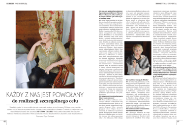 kobiety nas inspirują kobiety nas inspirują OG: Jest pani założycielką i właścicielką prestiżowej sieci Salonów Piękności Milord w Warszawie. Jak zrodził się taki pomysł na biznes i jak udało się pani rozwinąć firmę? Każdy z nas jest powołany do realizacji szczególnego celu Dwadzieścia pięć lat temu podjęła decyzję o związaniu swojego życia z biznesem. Od tego czasu inwestuje również w ludzi. Wierzy w inicjatywę lokalną i życiowe powołanie każdego człowieka. O wartościach w biznesie oraz misji odrodzenia ludzkich serc opowiada KRYSTYNA TARASIUK – właścicielka warszawskiej sieci Salonów Piękności Milord oraz założycielka i Prezes Społecznej Fundacji Bezpieczeństwa Obywateli „Twoje Bezpieczeństwo”. Rozmawia Olga Gontarek 66 KT: Swoją firmę prowadzę już od dwudziestu pięciu lat. Z zawodu jestem dietetyczką, a do rozpoczęcia przygody z biznesem zainspirował mnie znajomy fryzjer. To on rozbudził kiełkującą w mym sercu pasję do biznesu i natchnął odwagą. Dokładnie 24 października 1989 roku otworzyłam swój pierwszy salon fryzjerski przy ul. Kobielskiej 17 na warszawskiej Pradze. Ówcześnie salon nosił nazwę Ketino, a następnie został przemianowany na Studio Jowita, na cześć najstarszej córki. Trzy lata po założeniu pierwszego salonu uruchomiłam kolejny, przy al. J. Waszyngtona 30/36, tym samym tworząc sieć salonów o nowo przyjętej nazwie Salony Piękności Milord. Wraz z powstaniem kolejnych punktów dołączyła do mnie młodsza siostra, Grażyna Nalewajko, i córka Jowita, a zainicjowane przeze mnie przedsięwzięcie stało się biznesem rodzinnym. Równolegle z rozwojem sieci lokali, których obecnie mamy pięć, intensywnie pracowaliśmy nad rozszerzeniem i udoskonaleniem portfolio usług. W dzisiejszych czasach w branży fryzjersko-kosmetycznej jest ogromna konkurencja, a rynek nasycony tradycyjnymi usługami. Jednocześnie ma miejsce ogromny postęp w dziedzinie kosmetologii – pojawiają się nowe zabiegi, a producenci oferują coraz bogatszą gamę nowoczesnych preparatów. Warunkiem niezbędnym do tego, aby sprostać wymaganiom klientów i tym samym utrzymać się na rynku, jest ciągłe poszerzanie wiedzy w dziedzinie kosmetologii oraz bycie na bieżąco z pojawiającymi się trendami i nowinkami. Dlatego moi pracownicy regularnie biorą udział w szkoleniach produktowo-sprzedażowych oraz pielęgnacyjnych. OG: Jakie nowości ma do zaoferowania Milord swoim klientom? KT: Poza szerokim wachlarzem nowoczesnych zabiegów i tradycyjnych usług fryzjersko-kosmetycznych mamy w naszej ofercie nowość, która od trzech miesięcy jest dostępna w Polsce – system do pielęgnacji włosów Olaplex. Został on stworzony, by replikować i regenerować mostki dwusiarczkowe włosów podczas koloryzacji. Olaplex można też oczywiście stosować jako zabieg regenerujący włosy – bez farbowania. Efekt zabiegu to diametralna odbudowa i odnowa włosów, nawet tych najbardziej zniszczonych i uszkodzonych. Zabieg znakomicie sprawdzi się jako kuracja uszkodzonych włosów po wakacjach. Jest to także znakomity sposób na odświeżenie koloru włosów bez kolejnych nadwyrężeń. Naszym klientkom proponujemy również innowacyjny zabieg kosmetyczny na skórę – Retises CT firmy Mediderma. Retises CT zawiera duże stężenia retinolu i witaminy C, dzięki czemu regeneruje, odświeża, spłyca zmarszczki, usuwa przebarwienia i zmniejsza pory. Zabieg zalecamy w szczególności po słonecznym urlopie. rozpoczyna się w momencie, kiedy klient wchodzi do salonu. Dlatego tak ważny jest uśmiech recepcjonistki i podanie smacznej kawy. Jesteśmy profesjonalistami pod każdym względem. Do każdego klienta podchodzimy indywidualnie i holistycznie. Pełnimy w pewnym sensie rolę psychologa – zawsze musimy trafnie zidentyfikować problem, z którym dana osoba do nas przychodzi. Aby ten cel osiągnąć, potrzebny jest zgrany zespół pracowników, skupiony wokół wspólnych firmowych wartości, którymi są: szacunek do siebie i innych, uczciwość, odpowiedzialność, zaangażowanie i duma ze wspólnych osiągnięć. W pracy stosuję zasadę otwartej i szczerej komunikacji. Na bieżąco dzielimy się uwagami i służymy sobie wzajemną pomocą. Mam też szczęście zatrudniać wspaniałą managerkę – panią Marzenę Żak, która wspiera mnie w aspektach zarządzania ludźmi. Dobór odpowiednich współpracowników i umiejętność pokierowania nimi decydują o sukcesie lub porażce biznesu. Bardzo starannie dobieram swoich pracowników i dużo od nich wymagam. Biznes to ludzie – oni go tworzą i są jego siłą. To prawdziwy motor każdego biznesu. Dobrzy pracownicy nie tylko są kluczowi dla firmy – to oni są firmą. OG: Jednak komercyjne oblicze biznesu to nie wszystko. Jest pani również założycielką i prezesem Społecznej Fundacji Bezpieczeństwa Obywateli „Twoje Bezpieczeństwo”. Czym zajmuje się Fundacja? OG: Czy klienci wracają do Milorda? KT: Z dumą mogę powiedzieć, że tak. Mamy liczne grono wieloletnich i wiernych klientów. Jest to dla nas największa nagroda i motywacja. Myślę, że tę lojalność mogę zawdzięczać konsekwencji w budowaniu i promowaniu marki Milord, dbałości o długofalowe relacje z klientami, a nade wszystko jakości naszych usług. Wynika to poniekąd z faktu, że Milord jest firmą rodzinną, w której rozwój zainwestowaliśmy wiele pracy, czasu i zaangażowania. Poświęciliśmy firmie bardzo wiele, czyniąc z niej ważną część naszego życia, stąd pieczołowicie dbamy o każdy aspekt jej funkcjonowania. OG: Jakimi zasadami i wartościami kieruje się pani w swej pracy? KT: Największą wartością dla mnie i moich współpracowników jest to, aby sprostać wymaganiom klientów i wyjść naprzeciw ich potrzebom. U nas usługa KT: Społeczną Fundację Bezpieczeństwa Obywateli „Twoje Bezpieczeństwo” powołałam do życia w 1998 roku. Jesteśmy gru
