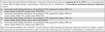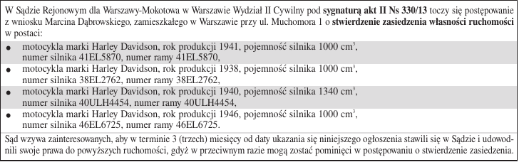 W Sądzie Rejonowym dla Warszawy-Mokotowa w Warszawie Wydział II Cywilny pod sygnaturą akt II Ns 330/13 toczy się postępowanie z wniosku Marcina Dąbrowskiego, zamieszkałego w Warszawie przy ul. Muchomora 1 o stwierdzenie zasiedzenia własności ruchomości w postaci: motocykla marki Harley Davidson, rok produkcji 1941, pojemność silnika 1000 cm3, numer silnika 41EL5870, numer ramy 41EL5870, motocykla marki Harley Davidson, rok produkcji 1938, pojemność silnika 1000 cm3, numer silnika 38EL2762, numer ramy 38EL2762, motocykla marki Harley Davidson, rok produkcji 1940, pojemność silnika 1340 cm3, numer silnika 40ULH4454, numer ramy 40ULH4454, motocykla marki Harley Davidson, rok produkcji 1946, pojemność silnika 1000 cm3, numer silnika 46EL6725, numer ramy 46EL6725. Sąd wzywa zainteresowanych, aby w terminie 3 (trzech) miesięcy od daty ukazania się niniejszego ogłoszenia stawili się w Sądzie i udowodnili swoje prawa do powyższych ruchomości, gdyż w przeciwnym razie mogą zostać pominięci w postępowaniu o stwierdzenie zasiedzenia. . . . .