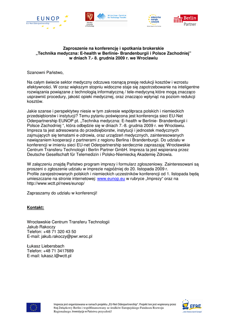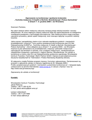 Zaproszenie na konferencję i spotkania brokerskie „Technika medyczna: E-health w Berlinie- Brandenburgii i Polsce Zachodniej” w dniach 7.- 8. grudnia 2009 r. we Wroclawiu Szanowni Państwo, Na całym świecie sektor medyczny odczuwa rosnącą presję redukcji kosztów i wzrostu efektywności. W coraz większym stopniu widoczne staje się zapotrzebowanie na inteligentne rozwiązania powiązane z technologią informatyczną / tele-medycyną które mogą znacząco usprawnić procedury, jakość opieki medycznej, oraz znacząco wpłynąć na poziom redukcji kosztów. Jakie szanse i perspektytwy niesie w tym zakresie współpraca polskich i niemieckich przedsiębiorstw i instytucji? Temu pytaniu poświęcona jest konferencja sieci EU-Net Oderpartnership EUNOP pt. „Technika medyczna: E-health w Berlinie- Brandenburgii i Polsce Zachodniej “, która odbędzie się w dniach 7.-8. grudnia 2009 r. we Wrocławiu. Impreza ta jest adresowana do przedsiębiorstw, instytucji i jednostek medycznych zajmujących się tematami e-zdrowia, oraz urządzeń medycznych, zainteresowanych nawiązaniem kooperacji z partnerami z regionu Berlina i Brandenburgii. Do udziału w konferencji w imieniu sieci EU-net Oderpartnership serdecznie zapraszają: Wrocławskie Centrum Transferu Technologii i Berlin Partner GmbH. Impreza ta jest wspierana przez Deutsche Gesellschaft für Telemedizin i Polsko-Niemiecką Akademię Zdrowia. W załączeniu znajdą Państwo program imprezy i formularz zgłoszeniowy. Zainteresowani są proszeni o zgłoszenie udziału w imprezie najpóźniej do 20. listopada 2009 r. Profile zarejestrowanych polskich i niemieckich uczestników konferencji od 1. listopada będą umieszczane na stronie internetowej: www.eunop.eu w rubryce „Imprezy“ oraz na http://www.wctt.pl/news/eunop/ Zapraszamy do udziału w konferencji! Kontakt: Wrocławskie Centrum Transferu Technologii Jakub Rakoczy Telefon: +48 71 320 43 50 E-mail: [email protected] Łukasz Liebersbach Telefon: +48 71 3417689 E-mail: [email protected] Impreza jest organizowana w ramach projektu „EU-Net Oderpartnership“. Projekt ten jest wspierany przez Kraj Związkowy Berlin i współfinansowany ze środków Europejskiego Funduszu Rozwoju Regionalnego. Inwestycja w Państwa przyszłość! Technika medyczna: E-health w Berlinie- Brandenburgii i Polsce Zachodniej Program 7. grudnia 2009 r. godz. 11:00 – 11:15 Rejestracja uczestników, w miejscu konferencji: Wrocławskie Centrum Transferu Technologii ul. Smoluchowskiego 48, 50-370 Wrocław sala konferencyjna godz. 11:15 - 11:25 Powitanie godz. 11:25 - 11:50 Zarys rynku ochrony zdrowia i systemu opieki zdrowotnej w Polsce na przykładzie woj. dolnośląskiego Jarosław Maroszek Dyrektor Departamentu Polityki Zdrowotnej Urząd Marszałkowski woj. dolnośląskiego godz. 11:50 - 12:20 E-Health/ telemedycyna i informatyka medyczna w Polsce – potencjał naukowy i gospodarczy Krzysztof Kmieciak Prezes Health Care Technology Solutions Polska godz. 12:20 - 13:30 Krótkie prezentacje wybranych przedsiębiortsw z Polski Zachodniej (zakres działalności, projekty, oferta). (5 prezentacji á ok. 10 min.) godz.13:30 -14:15 Przerwa na lunch godz. 14:15 - 14:30 Zarys niemieckego systemu opieki zdrowotnej, Detlef Lischka, Prezes Niemiecko-Polskiej Akademii Medycznej (zapytany) godz. 14:30 - 15:00 E-Health/telemedycyna w Berlinie-Brandenburgii potencjał naukowy i gospodarczy, Wolfgang Loos Prezes Zarządu Deutsche Gesellschaft für Telemedizin – DGTelemed e.V. (Niemieckego Towarzystwa Telemedycznego) godz. 15:00 - 16:00 Krótkie prezentacje wybranych przedsiębiorstw z Berlina i Brandenburgii (zakres działalności, projekty, oferta) (4 prezentacje á ok. 10 min.) od godz. 16:00 Business mixer* (indywidualne rozmowy) Koniec spotkania ok. godz. 18:00 * Profile zarejestrowanych polskich i niemieckich uczestników konferencji od 1. listopada będą umieszczane na stronie internetowej www.eunop.eu w rubryce „Imprezy“ oraz na http://www.wctt.pl/news/eunop/ Impreza jest organizowana w ramach projektu „EU-Net Oderpartnership“. Projekt ten jest wspierany przez Kraj Związkowy Berlin i współfinansowany ze środków Europejskiego Funduszu Rozwoju Regionalnego. Inwestycja w Państwa przyszłość! 8. grudnia 2009 r. godz. 10:00 Wizyta w szpitalu Akademii Medycznej we Wrocławiu* adres: Akademicki Szpital Kliniczny ul. Borowska 213 50-556 Wrocław nastepnie: Wizyta we Wrocławskim Parku Technologicznym we Wrocławiu* adres:ul. Muchoborska 18 54-424 Wrocław Dokładne dane dotyczące wizyty w Akademickim Szpitalu Klinicznym, oraz Wrocławskim Parku Technologicznym zostaną przekazane uczestnikom po przesłaniu formularza zgłoszeniowego. godz. 13:30 Lunch i zakończenie imprezy. Wyjazd niemieckich uczestników lub indywidualne spotkania uczestników. Panel konferencyjny w pierwszym dniu imprezy, tj. 7.12.2009 r. odbędzie się w języku polskim i niemieckim (tłumaczenie symultaniczne). Prezentacje w drugim dniu imprezy, 08.12.2009 r. odbędą się w języku angielskim. ---------------------------------------------------------------------------------------------------------------* Polscy uczestnicy - dojazd we własnym zakresie. Serdecznie dziękujemy naszym partnerom: Deutsche Gesellschaft für Telemedizin e.V. (DGTelemed) jest działającym na terenie całych Niemiec zrzeszeniem, którego celem jest wspieranie, rozpowszechnianie i publikacja nowoczesnych, innowacyjnych trendów, rozwiązań i produktów w dziedzinie telemedycyny. DGTelemed jest towarzystwem branŜowym telemedycyny, które zrzesza i kontaktuje ze sobą ekspertów. Stowarzyszenie stanowi i organizuje platformę wymiany doświadczeń fachowców. Członkami DGTelemed są szpitale, lekarze, naukowcy, szkoły wyŜsze, placówki naukowo-badawcze, przedsiębiortswa z branŜ techniki medycznej i farmaceutycznej, firmy doradcze i usługowe, kasy chorych, stowarzyszenia lekarzy, firmy IT oraz inne osoby i instytucje. DGTelemed wspiera sieciow