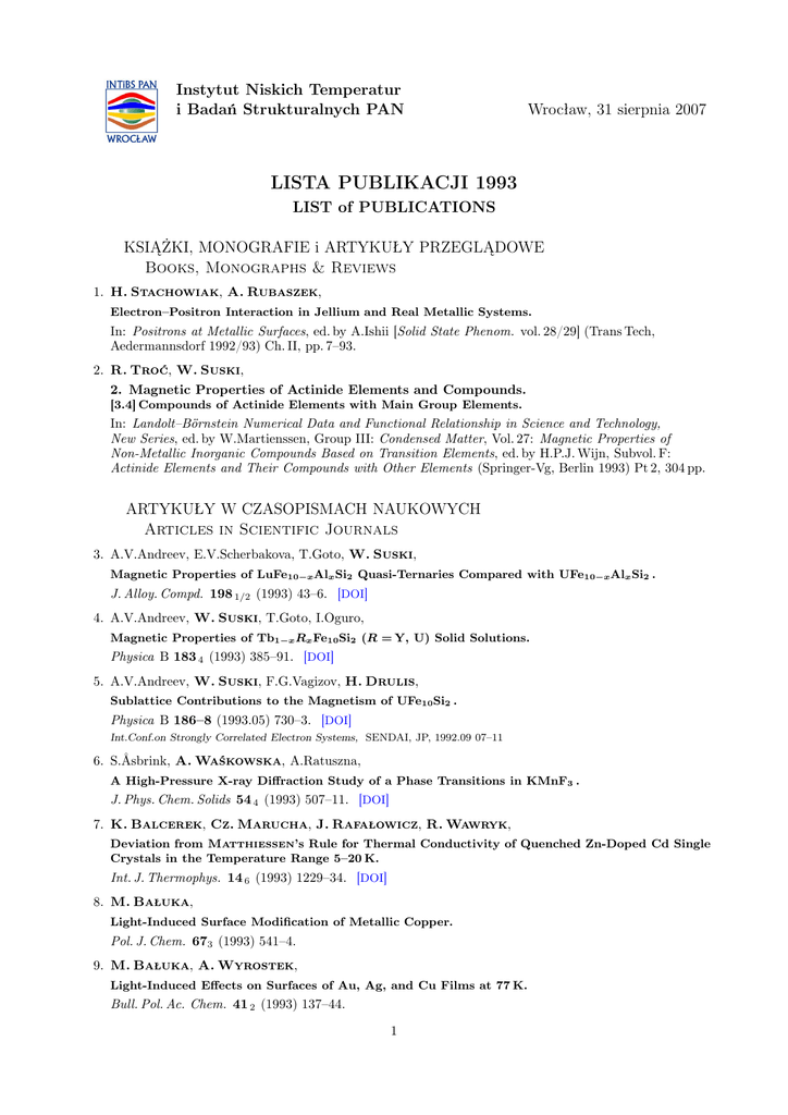 lista publikacji 1993 - Instytut Niskich Temperatur i Badań