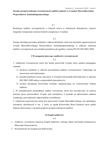 Załącznik nr 3 Księgi Jakości UMWZ – wydanie 5 Zasady przeprowadzania wewnętrznych auditów jakości w Urzędzie Marszałkowskim Województwa Zachodniopomorskiego §1 Realizacja auditów wewnętrznych, o których mowa w niniejszym dokumencie, stanowi integralny komponent systemu kontroli zarządczej w Urzędzie. §2 Zasady określają procedurę działania i odpowiedzialność osób oraz komórek organizacyjnych Urzędu Marszałkowskiego Województwa Zachodniopomorskiego w zakresie realizacji auditów wewnętrznych oraz działań poauditowych zgodnie z normą PN-EN ISO 9001:2009. I Wymagania dotyczące auditorów wewnętrznych §3 1. Auditorem wewnętrznym może być każdy pracownik Urzędu, który spełnia następujące warunki: 1) ukończył szkolenie w zakresie prowadzenia auditów wewnętrznych i legitymuje się stosownym zaświadczeniem, 2) posiada minimum roczny staż pracy w Urzędzie lub posiada doświadczenie w zakresie ISO 9001:2009 nabyte u poprzednich pracodawców, 3) uzyskał akceptację kierownika komórki organizacyjnej na wykonywanie funkcji auditora. 2. W uzasadnionych przypadkach auditor wewnętrzny może być powoływany na umowę zlecenie spoza pracowników Urzędu, pod warunkiem, iż posiada on uprawnienia auditora wiodącego, poświadczone odpowiednim certyfikatem. 3. Auditorem pomocniczym może być pracownik Urzędu Marszałkowskiego, nie spełniający warunków określonych w ust. 1, który za zgodą Kierownika Biura Kontroli może pełnić funkcje obserwatora i asystenta podczas przeprowadzanych auditów. II Zespół auditorów §4 1. Auditorzy wewnętrzni stanowią Zespół auditorów, którego skład zatwierdza każdorazowo Marszałek Województwa. 2. Przynależność do Zespołu jest dobrowolna. 3. W skład Zespołu auditorów wchodzi minimum jeden auditor posiadający uprawnienia, o których mowa w § 3 ust.2. 4. Zespół zobowiązany jest do realizacji planu auditów rzetelnie i terminowo oraz w miarę potrzeb do czynnego udziału w działaniach i inicjatywach projakościowych. §5 1. Auditorzy samodzielnie pogłębiają swoją wiedzę na temat stosowania normy ISO 9000. 2. Auditorzy mają obowiązek czynnego udziału w spotkaniach Zespołu, o którym mowa w § 4. 3. Przynajmniej raz w roku oraz zawsze przy zmianie wymagań auditorzy wewnętrzni przechodzą gruntowne przeszkolenie w ramach szkolenia dla auditorów wewnętrznych przeprowadzanego przez niezależne podmioty szkoleniowe. 4. Za rzetelność wykonywanych działań w ramach Zespołu auditorzy odpowiadają przed Marszałkiem Województwa. III Zasady planowania auditów §6 1. Planowanie auditów wewnętrznych dokonuje się w systemie półrocznym. 2. Sporządzony plan auditów każdorazowo zatwierdza Marszałek. Marszałek zatwierdza również istotne zmiany w planie auditów dotyczące przedmiotu, zakresu i obszaru przeprowadzania auditu. 3. Plan auditów sporządza się według następującego schematu: 1) 2) 3) Nr auditu Przedmiot, zakres auditu Obszar auditu 4) 5) Imię i nazwisko Termin auditora (miesiąc, rok) §7 1. Szczegółowe zasady przeprowadzenia auditu w zakresie list kontrolnych oraz doboru próbki auditowej określane są przez pracownika Biura Kontroli Wewnętrznej każdorazowo indywidualnie dla każdego auditu. 2. Pracownik Biura Kontroli Wewnętrznej w planie auditów wyznacza auditorów wiodących, którzy ponoszą odpowiedzialność za terminowe i rzetelne przeprowadzenie auditu przez zespół auditowy. 3. Auditorzy każdorazowo ustalają z odpowiednimi kierownikami komórek organizacyjnych szczegółowe terminy przeprowadzenia auditów. IV Tryb przeprowadzania auditów §8 1. Audit rozpoczyna się spotkaniem z kadrą kierowniczą auditowanej komórki organizacyjnej. 2. Podczas spotkania omawiane są zasady prowadzenia auditu. §9 1. Audit w komórce organizacyjnej kończy się spotkaniem auditorów wewnętrznych lub auditora wiodącego z kadrą kierowniczą auditowanej komórki. 2. Podczas spotkania końcowego omawiane są wyniki z przeprowadzonego auditu oraz ustalane propozycje podjęcia działań korygujących. § 10 1.Wszelkie zidentyfikowane niezgodności omawiane są na bieżąco w trakcie auditu w celu dokonania identyfikacji przyczyny stwierdzonych nieprawidłowości. 2. Ewentualne niezgodności lub obserwacje zauważone w toku działań auditowych formułuje się odpowiednio na karcie niezgodności lub na karcie obserwacji, których wzory stanowią odpowiednio załącznik nr 1 i załącznik nr 2 do niniejszych zasad. 3. W przypadku sformułowania karty niezgodności auditor wraz z kierownikiem komórki organizacyjnej ustalają sposób realizacji działania korygującego wraz z terminem jego wykonania. 4. W przypadku sformułowania karty obserwacji auditor wraz z kierownikiem komórki organizacyjnej omawiają temat obserwacji, ewentualnie formułują propozycje działań doskonalących. 5. Karty sporządza się w dwóch jednakowo brzmiących egzemplarzach. 6. Karty zawierające opis niezgodności lub obserwacji (identyfikację przyczyny jej powstania i propozycję podjęcia działań korygujących), wypełnioną podczas spotkania zamykającego, auditor przekazuje do Biura Kontroli Wewnętrznej, gdzie zostaje zarejestrowana. 7. Po upłynięciu terminu, o którym mowa w ust. 3 auditor jest zobowiązany do dokonania reauditu w celu weryfikacji skuteczności działania korygującego. § 11 1. Po zakończonej serii auditów auditor sporządza raport zawierający: 1) daty auditów, 2) nazwy komórek organizacyjnych, 3) cel i zakres auditów, 4) przywołanie przedstawicieli strony auditowanej, 5) opis dokonanych obserwacji (mocnych i słabych stron, niezgodności, okazanych dokumentów, zidentyfikowanych dowodów), 6) określenie liczby sformułowanych kart, 7) wnioski, propozycje działań, 8) datę i podpis auditora. 2. Auditor przekazuje raport do Biura Kontroli Wewnętrznej, gdzie poddawany jest analizie. § 12 W przypadku powtarzalnych niezgodności Kierownik Biu