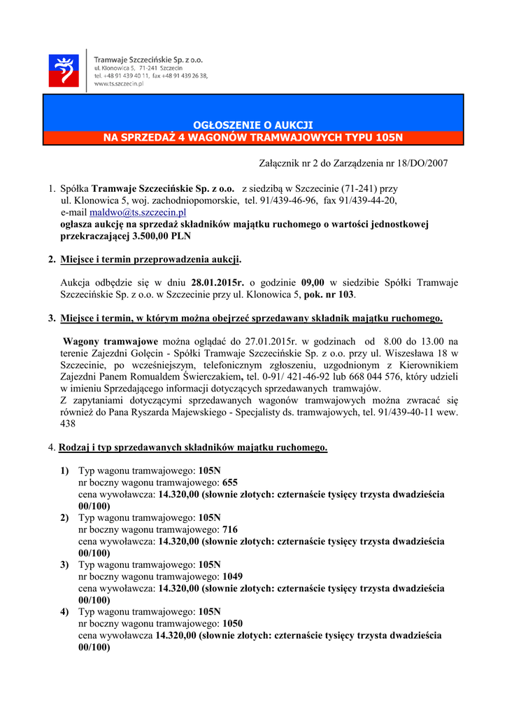 OGŁOSZENIE O AUKCJI NA SPRZEDAŻ 4 WAGONÓW TRAMWAJOWYCH TYPU 105N Załącznik nr 2 do Zarządzenia nr 18/DO/2007 1. Spółka Tramwaje Szczecińskie Sp. z o.o. z siedzibą w Szczecinie (71-241) przy ul. Klonowica 5, woj. zachodniopomorskie, tel. 91/439-46-96, fax 91/439-44-20, e-mail [email protected] ogłasza aukcję na sprzedaż składników majątku ruchomego o wartości jednostkowej przekraczającej 3.500,00 PLN 2. Miejsce i termin przeprowadzenia aukcji. Aukcja odbędzie się w dniu 28.01.2015r. o godzinie 09,00 w siedzibie Spółki Tramwaje Szczecińskie Sp. z o.o. w Szczecinie przy ul. Klonowica 5, pok. nr 103. 3. Miejsce i termin, w którym można obejrzeć sprzedawany składnik majątku ruchomego. Wagony tramwajowe można oglądać do 27.01.2015r. w godzinach od 8.00 do 13.00 na terenie Zajezdni Golęcin - Spółki Tramwaje Szczecińskie Sp. z o.o. przy ul. Wiszesława 18 w Szczecinie, po wcześniejszym, telefonicznym zgłoszeniu, uzgodnionym z Kierownikiem Zajezdni Panem Romualdem Świerczakiem, tel. 0-91/ 421-46-92 lub 668 044 576, który udzieli w imieniu Sprzedającego informacji dotyczących sprzedawanych tramwajów. Z zapytaniami dotyczącymi sprzedawanych wagonów tramwajowych można zwracać się również do Pana Ryszarda Majewskiego - Specjalisty ds. tramwajowych, tel. 91/439-40-11 wew. 438 4. Rodzaj i typ sprzedawanych składników majątku ruchomego. 1) Typ wagonu tramwajowego: 105N nr boczny wagonu tramwajowego: 655 cena wywoławcza: 14.320,00 (słownie złotych: czternaście tysięcy trzysta dwadzieścia 00/100) 2) Typ wagonu tramwajowego: 105N nr boczny wagonu tramwajowego: 716 cena wywoławcza: 14.320,00 (słownie złotych: czternaście tysięcy trzysta dwadzieścia 00/100) 3) Typ wagonu tramwajowego: 105N nr boczny wagonu tramwajowego: 1049 cena wywoławcza: 14.320,00 (słownie złotych: czternaście tysięcy trzysta dwadzieścia 00/100) 4) Typ wagonu tramwajowego: 105N nr boczny wagonu tramwajowego: 1050 cena wywoławcza 14.320,00 (słownie złotych: czternaście tysięcy trzysta dwadzieścia 00/100) 5. WARUNKI UCZESTNICTWA W AUKCJI ( wysokość wadium oraz termin i miejsce wniesienia ). Warunkiem przystąpienia do aukcji jest wniesienie wadium, w wysokości 10 % ceny wywoławczej za wagon tramwajowy typu 105N, tj. 1.432,00 zł (słownie: jeden tysiąc czterysta trzydzieści dwa złote 00/100). W przypadku zamiaru zakupu więcej niż jednego wagonu tramwajowego tytułem wadium należy wpłacić taką kwotę, która stanowić będzie krotność wielkości wadium wyliczonego za jeden wagon tramwajowy. Np. w przypadku zamiaru zakupu 4 wagonów tramwajowych wysokość wadium wyniesie 4 x 1.432.00 zł = 5.728,00 zł (słownie: pięć tysięcy siedemset dwadzieścia osiem złotych 00/100) Wadium należy wnieść w terminie do dnia 28.01.2015r. do godziny 8.30 w Kasie Spółki Tramwaje Szczecińskie Sp. z o.o. w Szczecinie przy ul. Klonowica 5 - pok. nr 213 ( II piętro) Wadium wnosi się wyłącznie w pieniądzu. Wadium zwraca się niezwłocznie po odwołaniu lub zamknięciu aukcji, w tym także aukcji, która nie została rozstrzygnięta z zastrzeżeniem, że wadium wniesione przez uczestnika aukcji, który wygrał aukcję zalicza się na poczet ceny nabycia pojazdu. Wadium nie podlega zwrotowi w przypadku gdy: – uczestnik aukcji, któremu udzielono przybicia nie uiścił ceny nabycia w wymaganym terminie 21 dni od dnia przybicia, tracąc prawo zakupu tramwajów, – umowa nie została zawarta z przyczyn Kupującego, w wymaganym terminie 31 dni od dnia przybicia na aukcji. 6. WARUNEK PRZEPROWADZENIA AUKCJI Warunkiem przeprowadzenia aukcji będzie stawienie się co najmniej jednego potencjalnego nabywcy, który spełni również warunek wymieniony w pkt 5 niniejszego ogłoszenia. Aukcja nie zostanie przeprowadzona jeżeli żaden z uczestników aukcji nie zaoferuje co najmniej ceny wywoławczej. 7. Podczas aukcji obowiązywać będzie minimalna wysokość postąpienia, która wynosi 100,00 zł za jeden wagon tramwajowy. W przypadku jeżeli licytacja prowadzona będzie równocześnie na wszystkie wystawione na aukcję wagony tramwajowe w ilości 4 sztuk, wówczas wysokość postąpienia wynosić będzie 400,00 zł Po ustaniu postąpień prowadzący aukcję, uprzedzając obecnych, po trzecim ogłoszeniu zamknie aukcję i udzieli przybicia licytantowi, który zaoferował najwyższą cenę. 8. Wpłacenie ceny nabycia i podpisanie umowy sprzedaży Cena nabycia pozostała do zapłaty przez Nabywcę pomniejszona jest o kwotę wadium, którą Nabywca wpłacił na poczet tej ceny przed aukcją. Nabywca zobowiązany jest zapłacić cenę nabycia przed podpisaniem umowy, w terminie do 21 dni od udzielenia Nabywcy przybicia. Cenę nabycia należy wpłacić przelewem na konto Spółki Tramwaje Szczecińskie Sp. z o.o.. Warunek wpłaty ceny nabycia na konto Spółki Tramwaje Szczecińskie Spółka z o.o. w terminie 21 dni od dnia przybicia, dotrzymany będzie jedynie w sytuacji gdy środki pieniężne znajdą się na koncie Spółki. Nie będzie brana pod uwagę data stempla pocztowego/bankowego. Po zapłaceniu przez Kupującego ceny nabycia, nastąpi zawarcie umowy sprzedaży przedmiotu aukcji. Termin zawarcia umowy ustalony będzie w drodze odrębnych uzgodnień po rozstrzygnięciu aukcji, z zastrzeżeniem, że nie będzie dłuższy niż 31 dni od dnia przybicia. Informacje i dokumenty, które nabywca zobowiązany jest przedstawić/złożyć przed podpisaniem lub wraz z podpisaną umową sprzedaży do Działu Zamówień Publicznych i Marketingu Spółki Tramwaje Szczecińskie Sp. z o.o.: 1. jeżeli Nabywcą jest firma ( również osoba fizyczna prowadząca zarejestrowana działalność gospodarczą ), wówczas złożyć należy kserokopie następujących dokumentów, potwierdzone za zgodność z oryginałem: - Aktualny odpis z właściwego rejestru albo aktualne zaświadczenie o wpisie do ewidencji działalności gospodarczej, - NIP, - REGON, - oraz w formie kserokopii dowód 