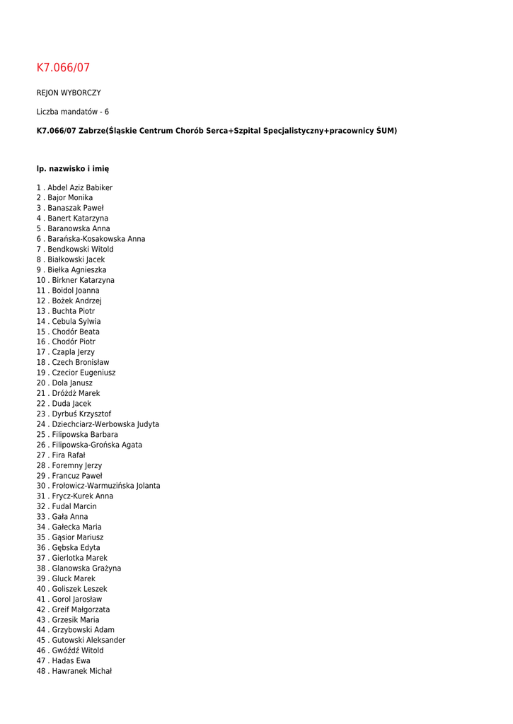 K7.066/07 REJON WYBORCZY Liczba mandatów - 6 K7.066/07 Zabrze(Śląskie Centrum Chorób Serca+Szpital Specjalistyczny+pracownicy ŚUM) lp. nazwisko i imię 1 . Abdel Aziz Babiker 2 . Bajor Monika 3 . Banaszak Paweł 4 . Banert Katarzyna 5 . Baranowska Anna 6 . Barańska-Kosakowska Anna 7 . Bendkowski Witold 8 . Białkowski Jacek 9 . Biełka Agnieszka 10 . Birkner Katarzyna 11 . Boidol Joanna 12 . Bożek Andrzej 13 . Buchta Piotr 14 . Cebula Sylwia 15 . Chodór Beata 16 . Chodór Piotr 17 . Czapla Jerzy 18 . Czech Bronisław 19 . Czecior Eugeniusz 20 . Dola Janusz 21 . Dróżdż Marek 22 . Duda Jacek 23 . Dyrbuś Krzysztof 24 . Dziechciarz-Werbowska Judyta 25 . Filipowska Barbara 26 . Filipowska-Grońska Agata 27 . Fira Rafał 28 . Foremny Jerzy 29 . Francuz Paweł 30 . Frołowicz-Warmuzińska Jolanta 31 . Frycz-Kurek Anna 32 . Fudal Marcin 33 . Gała Anna 34 . Gałecka Maria 35 . Gąsior Mariusz 36 . Gębska Edyta 37 . Gierlotka Marek 38 . Glanowska Grażyna 39 . Gluck Marek 40 . Goliszek Leszek 41 . Gorol Jarosław 42 . Greif Małgorzata 43 . Grzesik Maria 44 . Grzybowski Adam 45 . Gutowski Aleksander 46 . Gwóźdź Witold 47 . Hadas Ewa 48 . Hawranek Michał 49 . Herdyńska-Wąs Mirosława 50 . Hrapkowicz Tomasz 51 . Hudzik Bartosz 52 . Irlik Grzegorz 53 . Jacheć Wojciech 54 . Jachym Dorota 55 . Jarski Piotr 56 . Jarząb Jerzy 57 . Jasińska Małgorzata 58 . Jasińska Tatiana 59 . Jędrzejczyk-Patej Ewa 60 . Jumanazarova Chynara 61 . Kaczmarczyk Marcin 62 . Kalarus Zbigniew 63 . Kalinowski Mariusz 64 . Kaliś Robert 65 . Kamieńska Natalia 66 . Karwot Blandyna 67 . Kawecka Edyta 68 . Kawecka Izabela 69 . Kawecki Damian 70 . Kazik Anna 71 . Kaźmierczak Barbara 72 . Kłyś Jan 73 . Knap Izabella 74 . Knapik Małgorzata 75 . Knapik Piotr 76 . Koba Rafał 77 . Kobielski Andrzej 78 . Kocher Alfred 79 . Kociszewska Sabina 80 . Kolaszko Agnieszka 81 . Kolka Przemysław 82 . Komar Anna 83 . Kopera Joanna 84 . Kowalczyk Stanisław 85 . Kowalik Violetta 86 . Kowalski Oskar 87 . Kozieł Monika 88 . Krajewska Anna 89 . Krajewski Adam 90 . Krasoń Marcin 91 . Krupa Hubert 92 . Krzemień-Wolska Krystyna 93 . Kubacki Krzysztof 94 . Kubiak Grzegorz 95 . Kuczaj Agnieszka 96 . Kukulski Tomasz 97 . Kurdziel Marta 98 . Kurek Anna 99 . Kurek Tomasz 100 . Kusa Jacek 101 . Kycia-Marków Magdalena 102 . Lekston Andrzej 103 . Lenarczyk Anna 104 . Leopold-Jadczyk Anna 105 . Leśniak Konrad 106 . Liberska Agnieszka 107 . Lisowska Grażyna 108 . Lizak Maria 109 . Łapa Piotr 110 . Łowicka Małgorzata 111 . Majsnerowska Aleksandra 112 . Marcinkowski Adrian 113 . Maruszewski Marcin 114 . Matuszewska Gabriela 115 . Mazurek Michał 116 . Mencel Grzegorz 117 . Michalewski Wojciech 118 . Migdalska Grażyna 119 . Misiołek Maciej 120 . Miszkiewicz Jerzy 121 . Miśkiewicz-Orczyk Katarzyna 122 . Mitręga Katarzyna 123 . Morawiec Beata 124 . Mrówka Andrzej 125 . Mrówka-Kata Katarzyna 126 . Namysłowski Grzegorz 127 . Niedziela Jacek 128 . Niklewski Tomasz 129 . Nowak Jolanta 130 . Nowak Katarzyna 131 . Nowalany-Kozielska Ewa 132 . Nowińska Ewa 133 . Nowowiejska-Wiewióra Alicja 134 . Obersztyn Anna 135 . Obrębska Jadwiga 136 . Olszowski Dawid 137 . Orecka Bogusława 138 . Osadnik Tadeusz 139 . Ostręga Mateusz 140 . Pacholewicz Jerzy 141 . Pasek Piotr 142 . Piecuch Jerzy 143 . Piegza Jacek 144 . Pilarz Łukasz 145 . Pindycka-Piaszczyńska Małgorzata 146 . Pluta Sławomir 147 . Podolecki Tomasz 148 . Polok-Niewiadomska Aleksandra 149 . Poloński Lech 150 . Pres Damian 151 . Prokopczuk Janusz 152 . Pruszkowska-Skrzep Patrycja 153 . Przybylski Jan 154 . Przybylski Roman 155 . Przywara-Chowaniec Brygida 156 . Pyka Łukasz 157 . Rachowska Regina 158 . Ratman Katarzyna 159 . Regiec Stanisław 160 . Rokicki Wojciech 161 . Rowiński Andrzej 162 . Rybczyk Renata 163 . Ryfiński Bogusław 164 . Saucha Wojciech 165 . Sędkowska Agnieszka 166 . Sikora Jacek 167 . Sikora-Żydek Agnieszka 168 . Skoczylas Ilona 169 . Skuza Katarzyna 170 . Słonka Grzegorz 171 . Smyk Jolanta 172 . Soboniak-Sosada Grażyna 173 . Sokal Adam 174 . Sopotnicka-Gumienny Katarzyna 175 . Sosada Krystyn 176 . Sowa Paweł 177 . Stabryła-Deska Joanna 178 . Starosta Piotr 179 . Steter Daniel 180 . Streb Witold 181 . Styn Tomasz 182 . Szafron Bartłomiej 183 . Szatkowski Krzysztof 184 . Szkodziński Janusz 185 . Szkutnik Małgorzata 186 . Szrot Monika 187 . Szulik Mariola 188 . Szyguła Ewa 189 . Szyguła-Jurkiewicz Bożena 190 . Szymała Magdalena 191 . Ścierski Wojciech 192 . Śliwińska Anna 193 . Śliwka Joanna 194 . Średniawa Beata 195 . Świetlińska Małgorzata 196 . Tajstra Mateusz 197 . Tomasik Andrzej 198 . Trela Błażej 199 . Trzeciak Przemysław 200 . Turecka Lucyna 201 . Urban Tadeusz 202 . Urbaniec-Domżalska Natalia 203 . Uszok-Stenzel Ewa 204 . Vanaga-Besser Santa 205 . Vrabetz Ewa 206 . Wasiak Michał 207 . Wasilewski Jarosław 208 . Wąs Tomasz 209 . Weryńska-Kalemba Maria 210 . Wierzyk Arkadiusz 211 . Wiewióra Maciej 212 . Wilczek Krzysztof 213 . Wilczewski Przemysław 214 . Wnęk Andrzej 215 . Wojarski Jacek 216 . Wojnar Rafał 217 . Wojnicz Romuald 218 . Wolny Tomasz 219 . Woźniak Aleksandra 220 . Wróbel Michał 221 . Zawadzińska Kamila 222 . Zdrzałek-Skiba Alina 223 . Zembala Marian 224 . Zembala Michał 225 . Zębik Tadeusz 226 . Zielińska Teresa 227 . Zych Bartłomiej 228 . Żerdzińska Aleksandra 229 . Żurawiński Wojciech 230 . Żyła-Frycz Maria Podmiot udostępniający informację Okregowa Rada Lekarska Autor/Data powstania Jacek Kozakiewicz 2012-12-12 Wprowadził/Data wprowadzenia Tomasz Gawlik 2012-12-23 Ostatnia zmiana/ data zmiany Tomasz Gawlik 2013-02-28 Ilość odsłon artykułu 5568