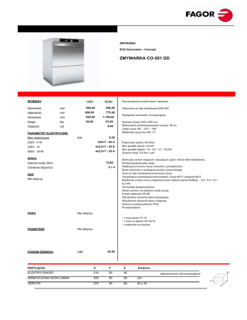 ZMYWARKI EVO Generation - Concept ZMYWARKA CO-501 DD netto WYMIARY brutto Szerokość mm 600,00 690,00 Głębokość mm 600,00 775,00 Wysokość mm 830,00 1.105,00 Waga Kg 60,00 Objętość m3 67,00 0,46 PARAMETRY ELEKTRYCZNE Moc elektryczna Wykonana ze stali nierdzewnej AISI-304 Wydajność nominalna: 40 koszy/godz. Wymiary kosza: 500 x 500 mm Maksymalna średnica/wysokość naczyń: 38 cm Cykle mycia: 90” , 120’’ i 180” Możliwość mycia tac GN- 1/1 6,20 KW 2x6+T - 40 A 230V -1+N 230V - III 3x2,5+T - 25 A 400V - III+N 4x2,5+T - 20 A WODA 72,00 Zużycie wody (lit/h) Ciśnienie (Kg/cm2) 2÷4 GAZ Nie dotyczy PARA Dwuwarstwowe ścianki drzwi i obudowy. Pojemność wanny: 20 litrów. Moc grzałek wanny: 2,8 kW. Moc grzałek bojlera: 1,8 - 2,8 - 3,7 - 5,6 kW Zużycie wody: 2,4 litra / cykl Dwie pary ramion myjących i płuczących, góra i dół ze stali nierdzewnej. Pompa spustowa jako opcja Wytłaczana komora mycia zmywarki z prowadnicami Drzwi wykonane z podwójnej ścianki z przeciwwagą Tace ze stali nierdzewnej w komorze mycia Temperatura kontrolowana termostatem: mycie 60°C i płukanie 85°C Możliwość zmiany mocy urządzenia przez zastoso-wanie Multibox : 2,4 / 3,4 / 4,3 / 6,2 kW. Termostaty bezpieczeństwa. Zawór zwrotny na zasilaniu wodą czystą. Poziom głośności 65 dB Wbudowany dozownik płynu płuczącego Wbudowany dozownik płynu myjącego Ochrona wodoszczelności IPX4 W wyposażeniu: Nie dotyczy - 1 kosz płaski CT-10 - 1 kosz na talerze CP-16/18 - 4 pojemniki na sztućce POWIETRZE Nie dotyczy POZIOM DŹWIĘKU (dB) 63,00 PRZYŁĄCZA X Y Z ELEKTRYCZNOŚĆ 210 50 65 Średnica ZMIĘKOCZONA WODA ZIMNA 305 50 65 3/4" ODPŁYW 370 50 65 30 x 25 zabezpieczenie różnicowoprądowe Modelos "B" con bomba de vaciado "B" models with drain pump Modèles "B" avec pompe de vidange Together we evolve