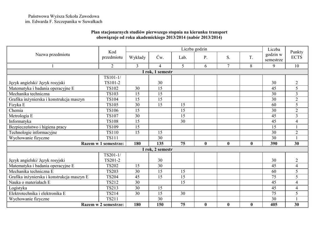 Państwowa Wyższa Szkoła Zawodowa im. Edwarda F. Szczepanika w Suwałkach Plan stacjonarnych studiów pierwszego stopnia na kierunku transport obowiązuje od roku akademickiego 2013/2014 (nabór 2013/2014) Liczba godzin Nazwa przedmiotu Kod przedmiotu Wykłady 1 2 3 TS101-1/ Język angielski/ Język rosyjski TS101-2 Matematyka i badania operacyjne E TS102 Mechanika techniczna TS103 Grafika inżynierska i konstrukcja maszyn TS104 Fizyka E TS105 Chemia TS106 Metrologia E TS107 Informatyka TS108 Bezpieczeństwo i higiena pracy TS109 Technologie informacyjne TS110 Wychowanie fizyczne TS111 Razem w 1 semestrze: TS201-1/ Język angielski/ Język rosyjski TS201-2 Matematyka i badania operacyjne E TS202 Mechanika techniczna E TS203 Grafika inżynierska i konstrukcja maszyn E TS204 Nauka o materiałach E TS212 Logistyka TS213 Elektrotechnika i elektronika E TS214 Wychowanie fizyczne TS211 Razem w 2 semestrze: 30 15 15 30 15 30 15 15 15 Ćw. 4 I rok, 1 semestr 30 15 15 15 15 15 30 180 135 I rok, 2 semestr 15 30 45 30 30 30 180 30 30 15 15 15 15 30 150 Lab. P. S. T. 5 6 7 8 Liczba godzin w semestrze 9 0 30 45 30 30 60 30 45 45 15 30 30 390 2 5 3 2 5 2 3 4 1 2 1 30 0 30 45 60 75 45 45 75 30 405 2 4 5 5 4 4 5 1 30 15 15 15 30 75 0 0 15 15 15 30 75 0 0 Punkty ECTS 10 II rok, 3 semestr TS301-1/ Język angielski/ Język rosyjski TS301-2 Matematyka i badania operacyjne E TS302 Automatyka E TS315 Grafika inżynierska i konstrukcja maszyn TS304 Eksploatacja techniczna E TS316 Infrastruktura transportu E TS317 Organizacja i zarządzanie TS318 Ekonomia TS319 TS320-1/ Etyka/Socjologia TS320-2 TS321-1/ Psychologia/Komunikacja interpersonalna TS321-2 Razem w 3 semestrze: Język angielski E/ Język rosyjski E Inżynieria ruchu E Systemy transportowe E Prawo transportowe Techniki wytwarzania Ergonomia Ekonomika transportu Środki transportu E Praktyka TS401-1/ TS401-2 TS422 TS423 TS424 TS425 TS426 TS427 TS428 TS429 Razem w 4 semestrze: 30 30 60 30 45 45 45 30 2 3 5 2 4 4 3 3 30 30 2 30 225 30 375 2 30 30 30 2 15 30 15 45 60 30 45 30 45 75 360 4 5 2 4 2 3 6 2 30 90 6 60 4 30 180 2 12 60 4 15 30 30 15 15 15 30 30 30 30 30 30 30 15 30 30 30 30 15 15 15 90 II rok, 4 semestr 30 30 0 0 15 15 30 195 135 III rok, 5 semestr 45 15 15 15 15 0 0 Budowa pojazdów E TS530 30 Napędy i sterowanie pojazdów i maszyn TS531 30 30 transportowych Ochrona własności intelektualnej TS532 15 15 Razem w 5 semestrze, przedmioty wspólne: 90 60 30 0 0 0 grupa przedmiotów dyplomowania, ścieżka dyplomowania - Eksploatacja pojazdów i urządzeń transportowych Silniki spalinowe E TS501A 30 15 15 Teoria ruchu pojazdów E TS502A 30 30 Zarządzanie projektem TS503A 30 15 Materiały konstrukcyjne TS504A 15 15 Modelowanie i badania symulacyjne TS505A 30 30 Razem ścieżka dyplomowania: 135 90 30 0 0 Razem w 5 semestrze: 225 150 60 0 0 grupa przedmiotów dyplomowania, ścieżka dyplomowania – Logistyka w transporcie Towaroznawstwo E TS501B 15 15 Transport wewnątrzzakładowy I E TS502B 30 30 15 Opakowania i przechowalnictwo E TS503B 30 15 15 Aparatura i inżynieria produkcji E TS504B 30 15 30 Przepływ ładunków w systemach logistycznych TS505B 15 15 Razem ścieżka dyplomowania: 120 90 60 0 0 Razem w 5 semestrze: 210 150 90 0 0 0 0 60 45 30 60 255 435 4 3 3 4 18 30 0 0 30 75 60 75 30 270 450 2 5 4 5 2 18 30 45 45 4 2 6 60 60 5 5 60 5 60 45 285 330 5 4 24 30 75 75 30 30 30 240 285 7 7 3 4 3 24 30 III rok, 6 semestr Praca przejściowa TS632 45 Praktyka TS633 Razem w 6 semestrze, przedmioty wspólne: 0 0 0 45 0 0 grupa przedmiotów dyplomowania, ścieżka dyplomowania - Eksploatacja pojazdów i urządzeń transportowych Pojazdy specjalne E TS606A 30 30 Badania pojazdów i środków transportowych E TS607A 30 30 Eksploatacja pojazdów i środków TS608A 30 30 transportowych E Technologie napraw środków transportowych E TS609A 30 15 15 Elektrotechnika samochodowa TS610A 15 15 15 Razem ścieżka dyplomowania: 135 60 90 0 0 0 Razem w 6 semestrze: 135 60 90 45 0 0 grupa przedmiotów dyplomowania, ścieżka dyplomowania – Logistyka w transporcie Transport wewnątrzzakładowy II E TS606B 30 30 15 Technologie materiałowe E TS607B 30 15 30 Napędy suwnic i przenośników TS608B 15 15 TS609B 15 15 Projektowanie systemów logistycznych Eksploatacja dźwignic i przenośników E TS610B 15 15 Razem ścieżka dyplomowania: 105 75 30 30 0 0 Razem w 6 semestrze: 105 75 30 75 0 0 IV rok, 7 semestr Seminarium dyplomowe TS734 45 Ochrona środowiska w transporcie TS735 30 Projektowanie dyplomowe TS736 30 Praca dyplomowa TS737 Razem w 7 semestrze, przedmioty wspólne: 30 0 0 30 45 0 grupa przedmiotów dyplomowania, ścieżka dyplomowania - Eksploatacja pojazdów i urządzeń transportowych Diagnostyka pojazdów E TS711A 15 15 Razem ścieżka dyplomowania: 15 0 15 0 0 0 Razem w 7 semestrze: 45 0 15 30 45 0 grupa przedmiotów dyplomowania, ścieżka dyplomowania – Logistyka w transporcie Telematyka transportu E TS711B 30 15 15 Razem ścieżka dyplomowania: 30 15 15 0 0 0 Razem w 7 semestrze: 60 15 15 30 45 0 ścieżka dyplomowania - Eksploatacja pojazdów i urządzeń transportowych Razem w toku studiów: 1185 720 360 120 45 ścieżka dyplomowania – Logistyka w transporcie Razem w toku studiów: 1155 750 330 150 45 45 30 30 105 4 3 4 15 26 30 30 135 4 4 30 60 60 165 4 4 30 0 2430 210 0 2430 210