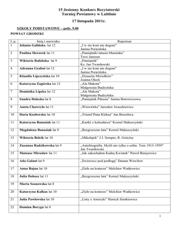 15 Jesienny Konkurs Recytatorski Turniej Powiatowy w Lublinie 17 listopada 2011r. SZKOŁY PODSTAWOWE – godz. 9.00 POWIAT GRODZKI L.p. Imię i nazwisko 1 Jolanta Galińska lat 12 Repertuar 2 Paulina Skwarek lat 11 3 Wiktoria Rabińska lat 9 4 Adranna Graboś lat 12 5 Klaudia Lipczyńska lat 10 6 Katarzyna Zagórska lat 12 7 Dominika Lipska lat 12 8 Sandra Dolecka lat 8 „I w sto koni nie dogoni” Janina Porazińska „Pamiętniki tatusia Muminka” Tove Jansson „Pamiętnik” Ks. Jan Twardowski „I w sto koni nie dogoni” Janina Porazińska „Dynastia Miziołków” Joanna Olech „Ala Makota” Małgorzata Budzyńska „Ala Makota” Małgorzata Budzyńska „Pamiętnik Pikusia” Janina Borowiczowa 9 Aneta Chawryło lat 11 „Wiewiórka” Jarosław Iwaszkiewicz 10 Daria Kozłowska lat 10 „Triumf Pana Kleksa” Jan Brzechwa 11 Katarzyna Banasiak lat 11 „Kartki z kalendarza” Kornel Makuszyński 12 Magdalena Banasiak lat 9 „Bezgrzeszne lata” Kornel Makuszyński 13 Wiktoria Bełcik lat 10 „Mikołajek” J.J. Sempre, R. Gościny 14 Zuzanna Radzikowska lat 9 15 Mateusz Mirosław lat 11 „Autobiografia. Myśli nie tylko o sobie. Tom 1915-1959” Jan Twardowski „Jak zakochałem Kaśkę Kwiatek” Paweł Beręsewicz 16 Ada Galant lat 9 „Świerszcz pod podłogą” Danuta Wawiłow 17 Anna Bajun lat 10 „Ziele na kraterze” Melchior Wańkowicz 18 Julia Dobosz lat 11 „Bezgrzeszne lata” Kornel Makuszyński 19 Marta Sosnowska lat 8 20 Katarzyna Kałkus lat 10 „Ziele na kraterze” Melchior Wańkowicz 21 Julia Pawłowska lat 10 „Listy z Ameryki” Henryk Sienkiewicz 22 Damian Boryga lat 8 1 15 Jesienny Konkurs Recytatorski Turniej Powiatowy w Lublinie 17 listopada 2011r. 23 Kacper Gołofit lat 7 "Listy Wicka ,List drugi"- Barbara Wiza 24 Stanisław Niewiński lat 11 „Bezgrzeszne lata” Kornel Makuszyński 25 Katarzyna Biszkont lat 11 26 Jakub Michna lat 11 "Ala Makota. Notatnik sfrustrowanej nastolatki" -Małgorzata Budzyńska "Dziennik cwaniaczka" - Jeff Kinney POWIAT ZIEMSKI – godz. 10.15 1 Izabela Koperska lat 10 2 Martyna Dolińska lat 9 3 Maria Trzcińska lat 9 4 Dominika Kulawczyk lat 12 5 Oliwia Matuszczyk lat 10 6 Alicja Ścibura lat 10 7 Jakub Koneczny lat 11 8 Amelia Góra lat 12 9 Kamil Parakowski lat 10 10 Zuzanna Grochowska lat 8 11 Paweł Bulik lat 11 12 Natalia Mierzyńska la 10 13 Katarzyna Grabowska lat 11 14 Julia Nakonieczna lat 8 15 Natalia Hacia lat 12 16 Izabela Hałata lat 11 17 Małgorzata Stec lat 11 18 Piotr Paduch lat 8 „Dynastia Miziołków’ Joanna olech „Dom w dom” Anna Kamieńska” „Moja babcia gra na trąbie” Wanda Chotomska „Oskar i pani RóŜa” Eric Emmanuel „Znowu kręcisz Zuźka” Dorota Suwalska „Ziele na kraterze” Melchior Wańkowicz „Bezgrzeszne lata” Kornel Makuszyński „Pamiętnik Lottie” Jacqueline Wilson „Nowe patyki i patyczki” Ks. Jan Twardowski „Plastusiowy pamiętnik” Maria Kownacka „Jak zakochałem Kaśkę Kwiatek” Paweł Beręsowicz „Autobiografia” Joanna Chmielewska „Opowieść o naszym domu” Zofia Szymanowska „Pan StrzyŜyk” Judy Blume „Pamiętnik Lottie” Jacqueline Wilson „Taśma” Irena Landau „Nowe przygody Mikołaja” Sempe i Gościnny „”Zrób zasadzkę” Rafał Witek 2 15 Jesienny Konkurs Recytatorski Turniej Powiatowy w Lublinie 17 listopada 2011r. 19 Karolina Frączek lat 9 20 Małgorzata Sawczyk lat 12 21 Aleksandra Kośka lat 9 22 Oskar Mituła lat 10 23 Zofia Pietrzak lat 10 24 Miłosz Widerlik lat 8 25 Natalia Turowska lat 9 26 Paweł Kowalczyk lat 10 27 Kacper Madejek lat 13 „Jeden plus Jedna” ElŜbieta Bartosik Trebnicka „Pamiętniki Adama i Ewy” Mark Twain „”Oto moja Kasia” Mira Jaworczakowa „Ze wspomnień samowara” Benedykt Hertz „Dziennik pierwszoklasisty” Viveca Sundvall „Patrz mama patrz tato” Willy Breinholst „Godzina” Ks. Jan Twardowski „Magda Paweł i Ty’ Krystyna Kleniewska Kowaliszyn „Dynastia Miziołków” – Joanna Olech 28 Julia Nakonieczna lat 8 "Pan StrzyŜyk" - Judy Blume 29 Weronika Szewczyk lat 10 30 Julia Kluch lat 11 „Dziennik pierwszoklasisty” Viveca Sundvall „Awantury na tle powszechnego ciąŜenia” – Tomasz Lem 31 Natalia Szymuś lat 8 32 Wioletta Psujek lat 10 33 Piotr Paduch lat 8 "Pollyanna" fr. "A właściwie list od Pollyanny" - Eleanor H. Porter „Dziennik pierwszoklasisty” Viveca Sundvall "Zrób zasadzkę" - Rafał Witek 34 Dorota Dudkiewicz lat 12 "Uszy do góry" - Irena Landau 35 Marlena Czuryszkiewicz lat 11 "Kwiat kalafiora" - Małgorzata Musierowicz 36 Izabela Chatała lat 11 "Taśma" - Irena Landau 37 Adrian Nakonieczny lat 11 "Jestem Super Mateuszek" - Elvira Lindo 38 Wojciech Kołodziej lat 12 "Dynastia Miziołków" fr. "Listy z wakacji" - Joanna Olech 39 Michał Perdun lat 9 40 Dominika Winiarska lat 11 "Nieznane przygody Mikołajka" - Rena Gościnny, Jeane Jacques Sempe "Dziki koń spod kaflowego pieca" - Christoph Hein 41 Natalia Hacia lat 12 "Pamietniki Lottie" - Jacqueline Wilson 42 Szymon Paluch lat 12 "Sekret Mateuszka" - Elvira Lindo 3