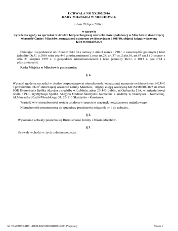 UCHWAŁA NR XX/302/2016 RADY MIEJSKIEJ W MIECHOWIE z dnia 20 lipca 2016 r. w sprawie wyrażenia zgody na sprzedaż w drodze bezprzetargowej nieruchomości położonej w Miechowie stanowiącej własność Gminy Miechów, oznaczonej numerem ewidencyjnym 1405/40, objętej księgą wieczystą KR1M/00040746/5 Działając na podstawie art.18 ust.2 pkt.9 lit.a ustawy z dnia 8 marca 1990 r. o samorządzie gminnym ( tekst jednolity Dz.U. z 2016 roku poz.446 z późn.zmianami ), oraz art.28, art.37 ust.2 pkt.16, art.67 ust.1 i 3 ustawy z dnia 21 sierpnia 1997 r. o gospodarce nieruchomościami ( tekst jednolity Dz.U. z 2015 r. poz.1774 z późn.zmianami). Rada Miejska w Miechowie postanawia: § 1. Wyrazić zgodę na sprzedaż w drodze bezprzetargowej nieruchomości oznaczonej numerem ewidencyjnym 1405/40 o powierzchni 56 m2 stanowiącej własność Gminy Miechów, objętej księgą wieczystą KR1M/00040746/5 na rzecz PGE Dystrybucja Spółka Akcyjna z siedzibą w Lublinie, adres 20-340 Lublin, ul.Garbarska 21A, w imieniu której działa : PGE Dystrybucja Spółka Akcyjna Oddział Skarżysko Kamienna z siedzibą w Skarżysku - Kamiennej, Al.Marszałka Józefa Piłsudskiego 51, 26-110 Skarżysko - Kamienna. Wartość w/w nieruchomości została ustalona w oparciu o szacunek rzeczoznawcy majątkowego. Nieruchomość przeznaczoną do sprzedaży przedstawia załącznik nr 1 do uchwały. § 2. Wykonanie uchwały powierza się Burmistrzowi Gminy i Miasta Miechów. § 3. Uchwała wchodzi w życie z dniem podjęcia. Id: 7EA1BD93-4B31-4D0B-B249-BD084BDEC67C. Podpisany Strona 1 Załącznik do Uchwały Nr XX/302/2016 Rady Miejskiej w Miechowie z dnia 20 lipca 2016 r. Szkic lokalizacji Id: 7EA1BD93-4B31-4D0B-B249-BD084BDEC67C. Podpisany Strona 1 UZASADNIENIE Do wyłącznej właściwości rady gminy zgodnie z art.18 ust.2 pkt.9 lit. a ustawy z dnia 8 marca 1990 roku o samorządzie gminnym (Dz.U. z 2016 roku poz.446) należy podejmowanie uchwał w sprawach majątkowych gminy dotyczących nabycia, zbycia i obciążania nieruchomości (...). Uchwała dotyczy terenu komunalnego położonego w Miechowie, stanowiącego działkę oznaczoną numerem ewidencyjnym 1405/40 o powierzchni 56 m2, na której zlokalizowana jest wnętrzowa stacja transformatorowa, stanowiąca własność spółki PGE Dystrybucja S.A. Nieruchomość posiada uregulowany stan prawny w księdze wieczystej KR1M/00040746/5. Z wnioskiem o nabycie przedmiotowych nieruchomości zwróciła się PGE Dystrybucja Spółka Akcyjna z siedzibą w Lublinie, adres 20-340 Lublin, ul.Garbarska 21A, w imieniu której działa : PGE Dystrybucja Spółka Akcyjna Oddział Skarżysko Kamienna z siedzibą w Skarżysku - Kamiennej, Al.Marszałka Józefa Piłsudskiego 51, 26-110 Skarżysko - Kamienna. Złożony wniosek zasługuje na uwzględnienie gdyż w ocenie organu możliwe jest zbycie nieruchomości w drodze bezprzetargowej. Sprzedaż nieruchomości stanowiących własność gminy następuje z zachowaniem przepisów ustawy o gospodarce nieruchomościami, z których wynika, iż zbycie nieruchomości generalnie następuje w drodze przetargu. Odstąpienie od przetargu jest konsekwencją zbycia w drodze bezprzetargowej i ma odniesienie do przypadków ustawowej rezygnacji z przetargów wymienionych w art.37 ust.2 tej ustawy. W tym stanie faktycznym i prawnym podjęcie niniejszej uchwały jest zasadne. Przedmiotowa uchwała stanowić będzie podstawę dalszych procedur przygotowania mienia gminy do sprzedaży. Id: 7EA1BD93-4B31-4D0B-B249-BD084BDEC67C. Podpisany Strona 1