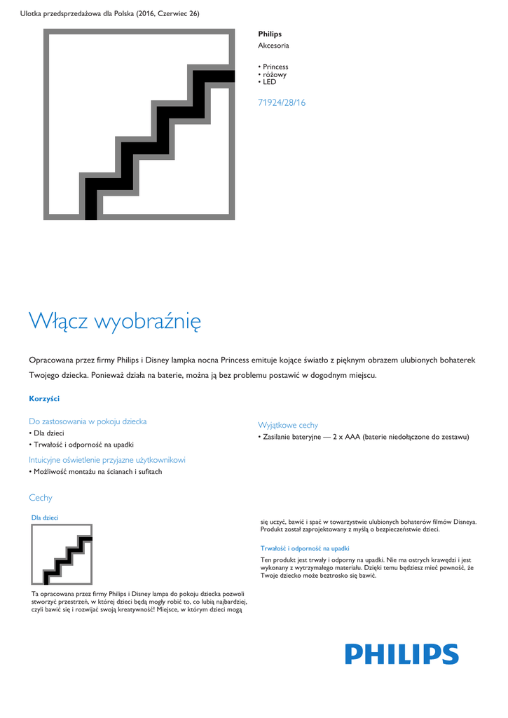 Ulotka przedsprzedażowa dla Polska (2016, Czerwiec 26) Philips Akcesoria • Princess • różowy • LED 71924/28/16 Włącz wyobraźnię Opracowana przez firmy Philips i Disney lampka nocna Princess emituje kojące światło z pięknym obrazem ulubionych bohaterek Twojego dziecka. Ponieważ działa na baterie, można ją bez problemu postawić w dogodnym miejscu. Korzyści Do zastosowania w pokoju dziecka • Dla dzieci • Trwałość i odporność na upadki Wyjątkowe cechy • Zasilanie bateryjne — 2 x AAA (baterie niedołączone do zestawu) Intuicyjne oświetlenie przyjazne użytkownikowi • Możliwość montażu na ścianach i sufitach Cechy Dla dzieci się uczyć, bawić i spać w towarzystwie ulubionych bohaterów filmów Disneya. Produkt został zaprojektowany z myślą o bezpieczeństwie dzieci. Trwałość i odporność na upadki Ten produkt jest trwały i odporny na upadki. Nie ma ostrych krawędzi i jest wykonany z wytrzymałego materiału. Dzięki temu będziesz mieć pewność, że Twoje dziecko może beztrosko się bawić. Ta opracowana przez firmy Philips i Disney lampa do pokoju dziecka pozwoli stworzyć przestrzeń, w której dzieci będą mogły robić to, co lubią najbardziej, czyli bawić się i rozwijać swoją kreatywność! Miejsce, w którym dzieci mogą Zasilanie bateryjne — 2 x AAA Montaż na ścianie i suficie Ta lampa jest zasilana 2 bateriami AAA. Odpowiednie są wszystkie baterie w tym rozmiarze, jednak nie należy używać jednocześnie różnych typów baterii. Baterie nie są dołączone do zestawu. Tę lampę można zamontować na ścianie lub na suficie — w zależności od potrzeb. Specyfikacje Prosimy pamiętać, że jest to ulotka przedsprzedażowa. Treść ulotki jest zgodna z naszą najlepszą wiedzą w momencie publikacji i w odniesieniu do danego kraju (podane powyżej). Treść ulotki może ulec zmianie bez powiadomienia. Firma Philips nie ponosi odpowiedzialności za treść ulotki. Stylistyka i wykończenie Materiał Kolor LED Żywotność do Współczynnik IP syntetyk różowy Dodatkowe funkcje/akcesoria w zestawie Wbudowane diody LED Doskonale sprawdza się jako oświetlenie orientacyjne TAK Klasa ochronności TAK Serwis Gwarancja Wymiary i waga produktu Wysokość Długość Szerokość Waga netto 2 lata Wymiary i waga opakowania 3,6 cm 11,1 cm 11,1 cm 0,043 kg Wysokość Długość Szerokość Waga Dane techniczne Zasilanie sieciowe Liczba źródeł światła Moc źródła światła w zestawie Łączna moc strumienia świetlnego oprawy w lumenach Oprawa z możliwością przyciemniania Tak 1500 godz. IP20 ochrona przed przedmiotami powyżej 12,5 mm brak ochrony przed wodą III — bezpieczne, bardzo niskie napięcie 4,0 cm 15 cm 18 cm 0,085 kg Różne 3V 1 0,3 W Opracowano z myślą o Styl Typ 5 lm Pokój dziecka Pełen ekspresji Akcesoria Nie Dane wkrótce ulegną zmianie 2016, Czerwiec 26 Version: 1.0.1 EAN: 8718696131916 © 2016 Koninklijke Philips Electronics N.V. Wszelkie prawa zastrzeżone Dane mogą ulec zmianie bez uprzedniego powiadomienia. Znak towarowy jest własnością Koninklijke Philips Electronics N.V. lub odpowiednich podmiotów . www.philips.com