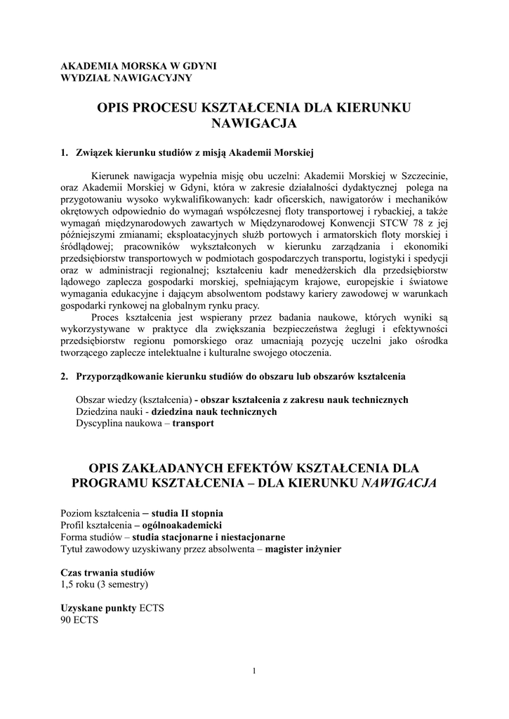 AKADEMIA MORSKA W GDYNI WYDZIAŁ NAWIGACYJNY OPIS PROCESU KSZTAŁCENIA DLA KIERUNKU NAWIGACJA 1. Związek kierunku studiów z misją Akademii Morskiej Kierunek nawigacja wypełnia misję obu uczelni: Akademii Morskiej w Szczecinie, oraz Akademii Morskiej w Gdyni, która w zakresie działalności dydaktycznej polega na przygotowaniu wysoko wykwalifikowanych: kadr oficerskich, nawigatorów i mechaników okrętowych odpowiednio do wymagań współczesnej floty transportowej i rybackiej, a także wymagań międzynarodowych zawartych w Międzynarodowej Konwencji STCW 78 z jej późniejszymi zmianami; eksploatacyjnych służb portowych i armatorskich floty morskiej i śródlądowej; pracowników wykształconych w kierunku zarządzania i ekonomiki przedsiębiorstw transportowych w podmiotach gospodarczych transportu, logistyki i spedycji oraz w administracji regionalnej; kształceniu kadr menedżerskich dla przedsiębiorstw lądowego zaplecza gospodarki morskiej, spełniającym krajowe, europejskie i światowe wymagania edukacyjne i dającym absolwentom podstawy kariery zawodowej w warunkach gospodarki rynkowej na globalnym rynku pracy. Proces kształcenia jest wspierany przez badania naukowe, których wyniki są wykorzystywane w praktyce dla zwiększania bezpieczeństwa żeglugi i efektywności przedsiębiorstw regionu pomorskiego oraz umacniają pozycję uczelni jako ośrodka tworzącego zaplecze intelektualne i kulturalne swojego otoczenia. 2. Przyporządkowanie kierunku studiów do obszaru lub obszarów kształcenia Obszar wiedzy (kształcenia) - obszar kształcenia z zakresu nauk technicznych Dziedzina nauki - dziedzina nauk technicznych Dyscyplina naukowa – transport OPIS ZAKŁADANYCH EFEKTÓW KSZTAŁCENIA DLA PROGRAMU KSZTAŁCENIA – DLA KIERUNKU NAWIGACJA Poziom kształcenia – studia II stopnia Profil kształcenia – ogólnoakademicki Forma studiów – studia stacjonarne i niestacjonarne Tytuł zawodowy uzyskiwany przez absolwenta – magister inżynier Czas trwania studiów 1,5 roku (3 semestry) Uzyskane punkty ECTS 90 ECTS 1 Osoba ubiegająca się o przyjęcie na studia drugiego stopnia na kierunku Nawigacja musi posiadać kwalifikację pierwszego stopnia, tytuł zawodowy inżyniera oraz kompetencje (obszar kształcenia w zakresie nauk technicznych) niezbędne do kontynuowania kształcenia na studiach drugiego stopnia na tym kierunku. Decyzję o dopuszczeniu do postępowania kwalifikacyjnego kandydata z innego kierunku studiów podejmuje dziekan, który określa wymagane efekty kształcenia uzyskane przez kandydata podczas jego dotychczasowych studiów. Dziekan może określić sposób uzyskania brakujących efektów kształcenia niezbędnych kandydatowi do prawidłowej realizacji studiów II stopnia i ustala sposób uzupełnienia różnic programowych. 1. Cel kształcenia Celem studiów drugiego stopnia na kierunku Nawigacja jest przygotowanie magistrów inżynierów, specjalistów w zakresie: - eksploatacji statków specjalistycznych (np. badawczych, sejsmicznych, obsługi platform gazowych i naftowych). - tworzenia i eksploatacji systemów bezpieczeństwa w transporcie - eksploatacji statku w transporcie morskim, ze szczególnym uwzględnieniem specyfiki warunków arktycznych. Absolwenci studiów II stopnia kierunku Nawigacja są dobrze przygotowywani teoretycznie i praktycznie do pracy w charakterze oficerów pokładowych na statkach morskich, w szeroko rozumianym morskim sektorze badawczo-wydobywczym, w jednostkach związanych z administracją morską, w przedsiębiorstwach zajmujących się gospodarką morską, służbach ratowniczych, jednostkach samorządowych, sztabach kryzysowych, organizacjach realizujących szeroko rozumiane zadania związane z bezpieczeństwem Profil kształcenia ukierunkowany jest na elementy związane z bezpieczeństwem transportu, w tym bezpieczeństwem ruchu statków, ratownictwem, a także inżynierią ruchu morskiego. Absolwenci mogą zajmować stanowiska oficerskie na statkach morskiej floty handlowej, a także stanowiska w przedsiębiorstwach sektora żeglugowego i wydobywczego. Kształcenie odbywa się na poziomie znacznie przewyższającym międzynarodowe standardy szkolenia oficerów, zaś absolwenci nabywają wiedzę i umiejętności niezbędne do zajmowania stanowiska starszego oficera i kapitana statku. Studia przygotowują nawigatorów do prowadzenia żeglugi w specyficznych warunkach, na akwenach gdzie bezpieczeństwo nawigacji wymaga specjalistycznego przygotowania. Absolwentów cechuje: dobre przygotowanie zawodowe, nowoczesna wiedza techniczna, dobra znajomość języka angielskiego, umiejętność samokształcenia, umiejętność wdrażania postępu technicznego, duża sprawność fizyczna i manualna, odporność na stresy, umiejętność pracy zespołowej, wysokie poczucie obowiązku i odpowiedzialności. 2 2. Kierunkowe efekty kształcenia KIERUNKOWE EFEKTY KSZTAŁCENIA I ICH ODNIESIENIE DO EFEKTÓW W OBSZARZE KSZTAŁCENIA W ZAKRESIE NAUK TECHNICZNYCH Objaśnienie oznaczeń: N 2 W U K (po podkreślniku) T2A 01, 02, 03 i kolejne Symbol N2_W01 N2_W0 N2_W0 N2_W0 N2_W0 N2_W0 N2_W0 N2_W0 - efekty kształcenia dla kierunku Nawigacja - studia drugiego stopnia - kategoria wiedzy - kategoria umiejętności - kategoria kompetencji społecznych - efekty kształcenia w obszarze kształcenia w zakresie nauk technicznych dla studiów drugiego stopnia - profil ogólnoakademicki - numer efektu kształcenia KIERUNKOWE EFEKTY KSZTAŁCENIA Po ukończeniu studiów II stopnia na kierunku studiów nawigacja absolwent: WIEDZA posiada rozszerzoną i pogłębioną wiedzę z języka angielskiego potocznego jak i również szczegółową wiedzę z języka angielskiego morskiego. Posiada zasób słownictwa technicznego angielskiego z zakresu budowy, cyklu życia i działania urządzeń technicznych funkcjonujących w przemyśle morskim. ma poszerzoną wiedzę o procesach zachodzących w środowiskach atmosferycznym i oceanicznym, ich wzajemnych powiązan