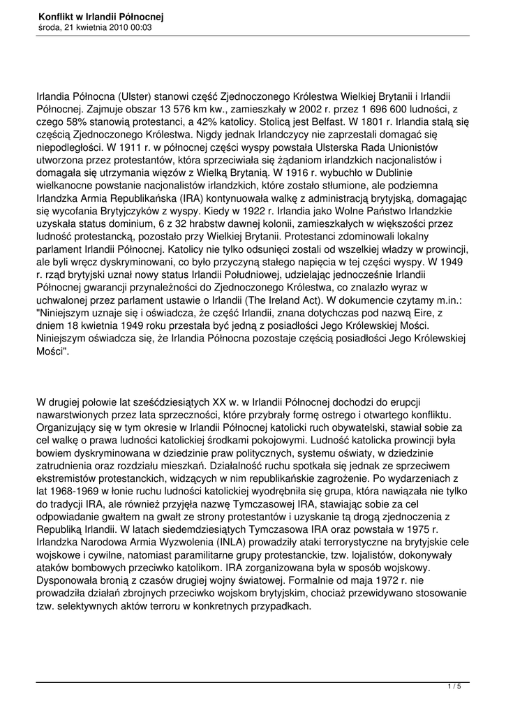 Konflikt w Irlandii Północnej środa, 21 kwietnia 2010 00:03 Irlandia Północna (Ulster) stanowi część Zjednoczonego Królestwa Wielkiej Brytanii i Irlandii Północnej. Zajmuje obszar 13 576 km kw., zamieszkały w 2002 r. przez 1 696 600 ludności, z czego 58% stanowią protestanci, a 42% katolicy. Stolicą jest Belfast. W 1801 r. Irlandia stałą się częścią Zjednoczonego Królestwa. Nigdy jednak Irlandczycy nie zaprzestali domagać się niepodległości. W 1911 r. w północnej części wyspy powstała Ulsterska Rada Unionistów utworzona przez protestantów, która sprzeciwiała się żądaniom irlandzkich nacjonalistów i domagała się utrzymania więzów z Wielką Brytanią. W 1916 r. wybuchło w Dublinie wielkanocne powstanie nacjonalistów irlandzkich, które zostało stłumione, ale podziemna Irlandzka Armia Republikańska (IRA) kontynuowała walkę z administracją brytyjską, domagając się wycofania Brytyjczyków z wyspy. Kiedy w 1922 r. Irlandia jako Wolne Państwo Irlandzkie uzyskała status dominium, 6 z 32 hrabstw dawnej kolonii, zamieszkałych w większości przez ludność protestancką, pozostało przy Wielkiej Brytanii. Protestanci zdominowali lokalny parlament Irlandii Północnej. Katolicy nie tylko odsunięci zostali od wszelkiej władzy w prowincji, ale byli wręcz dyskryminowani, co było przyczyną stałego napięcia w tej części wyspy. W 1949 r. rząd brytyjski uznał nowy status Irlandii Południowej, udzielając jednocześnie Irlandii Północnej gwarancji przynależności do Zjednoczonego Królestwa, co znalazło wyraz w uchwalonej przez parlament ustawie o Irlandii (The Ireland Act). W dokumencie czytamy m.in.: "Niniejszym uznaje się i oświadcza, że część Irlandii, znana dotychczas pod nazwą Eire, z dniem 18 kwietnia 1949 roku przestała być jedną z posiadłości Jego Królewskiej Mości. Niniejszym oświadcza się, że Irlandia Północna pozostaje częścią posiadłości Jego Królewskiej Mości". W drugiej połowie lat sześćdziesiątych XX w. w Irlandii Północnej dochodzi do erupcji nawarstwionych przez lata sprzeczności, które przybrały formę ostrego i otwartego konfliktu. Organizujący się w tym okresie w Irlandii Północnej katolicki ruch obywatelski, stawiał sobie za cel walkę o prawa ludności katolickiej środkami pokojowymi. Ludność katolicka prowincji była bowiem dyskryminowana w dziedzinie praw politycznych, systemu oświaty, w dziedzinie zatrudnienia oraz rozdziału mieszkań. Działalność ruchu spotkała się jednak ze sprzeciwem ekstremistów protestanckich, widzących w nim republikańskie zagrożenie. Po wydarzeniach z lat 1968-1969 w łonie ruchu ludności katolickiej wyodrębniła się grupa, która nawiązała nie tylko do tradycji IRA, ale również przyjęła nazwę Tymczasowej IRA, stawiając sobie za cel odpowiadanie gwałtem na gwałt ze strony protestantów i uzyskanie tą drogą zjednoczenia z Republiką Irlandii. W latach siedemdziesiątych Tymczasowa IRA oraz powstała w 1975 r. Irlandzka Narodowa Armia Wyzwolenia (INLA) prowadziły ataki terrorystyczne na brytyjskie cele wojskowe i cywilne, natomiast paramilitarne grupy protestanckie, tzw. lojalistów, dokonywały ataków bombowych przeciwko katolikom. IRA zorganizowana była w sposób wojskowy. Dysponowała bronią z czasów drugiej wojny światowej. Formalnie od maja 1972 r. nie prowadziła działań zbrojnych przeciwko wojskom brytyjskim, chociaż przewidywano stosowanie tzw. selektywnych aktów terroru w konkretnych przypadkach. 1/5 Konflikt w Irlandii Północnej środa, 21 kwietnia 2010 00:03 W związku z sytuacją w Irlandii Północnej, Republika Irlandii złożyła w grudniu 1971 r. skargę do Europejskiej Komisji Praw Człowieka w Strasburgu na Wielką Brytanię, w której stwierdzano, że w Irlandii Północnej obowiązują ustawy o specjalnych pełnomocnictwach, stanowiące naruszenie europejskiej Konwencji o ochronie praw człowieka i podstawowych wolności w częściach dotyczących ochrony życia, zakazu tortur, nieludzkiego traktowania oraz gwarantującej prawo do wolności i bezpieczeństwa osobistego oraz do sprawiedliwego procesu przed niezależnym i bezstronnym sądem. Na wiosnę 1972 r. Wielka Brytania postanowiła zmodyfikować swoją dotychczasową politykę w Irlandii Północnej, biorąc pod uwagę utrzymujące się od 1969 r. napięcie między rządzącymi ugrupowaniami protestanckimi i ugrupowaniami katolickimi. Przewidywano przejęcie przez rząd brytyjski całkowitej odpowiedzialności za sprawy bezpieczeństwa w Irlandii Północnej, pozbawienie lokalnego rządu złożonego z unionistów wpływu na działalność sił porządkowych, organizowanie okresowo plebiscytów w Irlandii Północnej w sprawie zjednoczenia z Irlandią oraz ograniczenie, aż do całkowitego zaniechania polityki internowania. Od momentu wejścia z dniem 1 stycznia 1973 r. Wielkiej Brytanii i Irlandii do Wspólnot Europejskich oba kraje postanowiły podjąć współpracę w dziedzinie zwalczania terroryzmu, co dotyczyło przede wszystkim działalności IRA. W wyniku trójstronnej konferencji, która odbyła się w dniach od 6 do 9 grudnia 1973 r. w Sunmngdale z udziałem przedstawicieli rządów Wielkiej Brytanii, Irlandii oraz lokalnego rządu Ulsteru, rząd Irlandii oświadczył, że "w pełni akceptuje i uroczyście deklaruje, że status Irlandii Północnej nie może ulec zmianie dopóty, dopóki większość ludności Irlandii Północnej nie zażąda zmiany tego statusu". W ten sposób rząd Irlandii uznał po raz pierwszy od 1921 r. przynależność Irlandii Północnej do Zjednoczonego Królestwa, co spotkało się ze sprzeciwem w irlandzkim społeczeństwie. Z dniem 1 stycznia 1974 r. rząd brytyjski ponownie przekazał bezpośrednie administrowanie sprawami Irlandii Północnej nowo utworzonemu rządowi lokalnemu. Równocześnie w 1974 r. zniesiono liczne regulacje prawne o charakterze dyskryminacyjnym wobec mniejszości katoli
