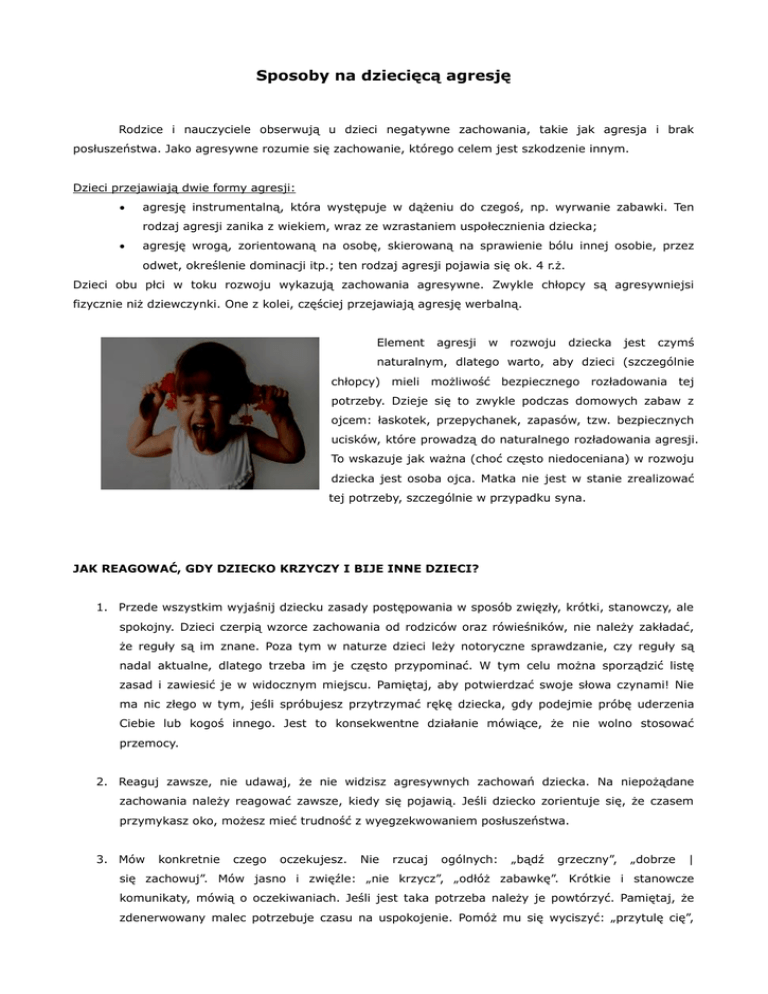 Sposoby na dziecięcą agresję Rodzice i nauczyciele obserwują u dzieci negatywne zachowania, takie jak agresja i brak posłuszeństwa. Jako agresywne rozumie się zachowanie, którego celem jest szkodzenie innym. Dzieci przejawiają dwie formy agresji: agresję instrumentalną, która występuje w dążeniu do czegoś, np. wyrwanie zabawki. Ten rodzaj agresji zanika z wiekiem, wraz ze wzrastaniem uspołecznienia dziecka; agresję wrogą, zorientowaną na osobę, skierowaną na sprawienie bólu innej osobie, przez odwet, określenie dominacji itp.; ten rodzaj agresji pojawia się ok. 4 r.ż. Dzieci obu płci w toku rozwoju wykazują zachowania agresywne. Zwykle chłopcy są agresywniejsi fizycznie niż dziewczynki. One z kolei, częściej przejawiają agresję werbalną. Element agresji w rozwoju dziecka jest czymś naturalnym, dlatego warto, aby dzieci (szczególnie chłopcy) mieli możliwość bezpiecznego rozładowania tej potrzeby. Dzieje się to zwykle podczas domowych zabaw z ojcem: łaskotek, przepychanek, zapasów, tzw. bezpiecznych ucisków, które prowadzą do naturalnego rozładowania agresji. To wskazuje jak ważna (choć często niedoceniana) w rozwoju dziecka jest osoba ojca. Matka nie jest w stanie zrealizować tej potrzeby, szczególnie w przypadku syna. JAK REAGOWAĆ, GDY DZIECKO KRZYCZY I BIJE INNE DZIECI? 1. Przede wszystkim wyjaśnij dziecku zasady postępowania w sposób zwięzły, krótki, stanowczy, ale spokojny. Dzieci czerpią wzorce zachowania od rodziców oraz rówieśników, nie należy zakładać, że reguły są im znane. Poza tym w naturze dzieci leży notoryczne sprawdzanie, czy reguły są nadal aktualne, dlatego trzeba im je często przypominać. W tym celu można sporządzić listę zasad i zawiesić je w widocznym miejscu. Pamiętaj, aby potwierdzać swoje słowa czynami! Nie ma nic złego w tym, jeśli spróbujesz przytrzymać rękę dziecka, gdy podejmie próbę uderzenia Ciebie lub kogoś innego. Jest to konsekwentne działanie mówiące, że nie wolno stosować przemocy. 2. Reaguj zawsze, nie udawaj, że nie widzisz agresywnych zachowań dziecka. Na niepożądane zachowania należy reagować zawsze, kiedy się pojawią. Jeśli dziecko zorientuje się, że czasem przymykasz oko, możesz mieć trudność z wyegzekwowaniem posłuszeństwa. 3. Mów konkretnie czego oczekujesz. Nie rzucaj ogólnych: „bądź grzeczny”, „dobrze | się zachowuj”. Mów jasno i zwięźle: „nie krzycz”, „odłóż zabawkę”. Krótkie i stanowcze komunikaty, mówią o oczekiwaniach. Jeśli jest taka potrzeba należy je powtórzyć. Pamiętaj, że zdenerwowany malec potrzebuje czasu na uspokojenie. Pomóż mu się wyciszyć: „przytulę cię”, „oddychaj ze mną”. Następnie spokojnie wytłumacz, dlaczego jego zachowanie nie było właściwe. 4. Nie ucz dziecka agresywnego myślenia! Nie wypowiadaj w jego obecności kąśliwych uwag na nauczyciela, sąsiada, członków rodziny. Postępując w taki sposób uczysz dziecko, że złość można wyładowywać na innych osobach, które nie mogą się obronić, bo nie słyszą, co mówisz. Nie pochwalaj też agresywnych działań tłumacząc je tym, że dziecko musi umieć się obronić. Ucz je asertywnych zachowań. 5. Spójrz krytycznie na siebie. Dzieci są uważnymi obserwatorami i po prostu naśladują dorosłych. Jeśli krzyczysz na malca, stosujesz wobec niego kary cielesne, słownie atakujesz innych, uczysz go, że tak należy. Postępuj z dzieckiem tak, jak chciałbyś, by ono postępowało z innymi. 6. Poszukuj przyczyny, nie oceniaj dziecka pochopnie. Pamiętaj, że dziecko mogło zostać sprowokowane do przemocy ze strony innej osoby, także słownie. Zawsze wysłuchaj relacji obojga stron i spróbuj ustalić co się wydarzyło. Następnie zastanów się jak właściwie postąpić. Nie działaj pochopnie. 7. Ustal za to konsekwencje. konsekwencje. Jeśli Nie dziecko mogą one łamie jednak ustalone być zbyt zasady surowe. powinno Muszą być ponosić adekwatne do przewinienia. Pamiętaj, że masz prawo odmówić dziecku, np. przytulenia, gdy podniosło na Ciebie rękę. Pokaż mu, jaki skutek miało jego działanie. 8. Nie wzmacniaj agresywnych zachowań. Jeśli rodzic nie wyciąga konsekwencji, a nawet pochwala niepożądane działanie, wzmacnia je. Malec nie zasługuje na pochwałę lub nagrodę, gdy jedyne strategie, jakie wykorzystuje do rozwiązywania konfliktów opierają się na agresji. Wyraź swoje niezadowolenie, które poprzesz odpowiednim zachowaniem. 9. Ustal jednakowe prawa dla wszystkich. Starsze rodzeństwo nie może bić młodszego, ale odwrotnie również obowiązuje taka zasada. Nie bagatelizuj sprawy. Takie postępowanie uczy dzieci podwójnej moralności, a w pokrzywdzonym rodzi poczucie niesprawiedliwości i złość. 10. Naucz dziecko rozładowywać negatywne emocje. Złość to naturalne uczucie, które jest nam niezbędne. Sęk, aby nauczyć się radzenia sobie z nim, czyli rozładowywania w taki sposób, by nikogo nie krzywdzić. Ustal więc z dzieckiem, co można robić, gdy się jest złym. Gdy napięcie wzrasta można np.: uderzyć w poduszkę narysować obrazek złości policzyć do 10 tupnąć nogą uderzyć w worek treningowy pójść na spacer Warto zapewnić dziecku ruch. W tym celu można go np. sportowe, taneczne, aby miało szansę się wyszaleć. zapisać na dodatkowe zajęcia, Co zrobić z dzieckiem, które jest poszturchiwane przez kolegę? Przede wszystkim nie ucz go agresywnego myślenia ani zachowania. Wyjaśnij mu, że należy się bronić. Wytłumacz dziecku, aby reagowało na zaczepki możliwie najmniej agresywnie. Na przykład, szarpnięte przez kolegę może powiedzieć: „Słuchaj, nie chcę się bić, ale jeśli mnie zmusisz, to cię uderzę.” Z reguły w takiej sytuacji napastnik się wycofuje. Jeśli dziecko ma obawy, że zostanie pobite natychmiast powinno uciekać, krzyczeć i poinformować o sytuacji kogoś dorosłego. Na zaczepki słowne naj