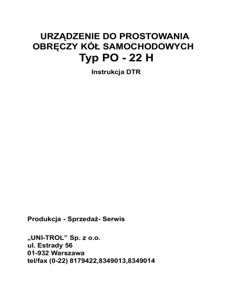 URZ¥DZENIE DO PROSTOWANIA OBRÊCZY KÓ£ SAMOCHODOWYCH Typ PO - 22 H Instrukcja DTR Produkcja - Sprzeda¿- Serwis „UNI-TROL” Sp. z o.o. ul. Estrady 56 01-932 Warszawa tel/fax (0-22) 8179422,8349013,8349014 Instrukcja obs³ugi URZ¥DZENIE DO PROSTOWANIA OBRÊCZY KÓ£ SAMOCHODOWYCH Typ PO - 22 H Numer seryjny Rok produkcji PRODUCENT: „UNI-TROL” Sp. z o.o. ul. Estrady 56 01-932 Warszawa tel/fax (22) 8179422, 8349013, 8349014 2 SPIS TREŒCI 1.0 2.0 3.0 4.0 4.1 4.2 5.0 WSTÊP SZKOLENIE OPERATORÓW TRANSPORT I OPAKOWANIE WYMAGANIA DOTYCZ¥CE MONTA¯U MIEJSCE USTAWIENIA URZ¥DZENIA PRZY£¥CZA ELEKTRYCZNE BEZPIECZEÑSTWO PRACY 5.1. ZASADY, KTÓRYCH MUSI PRZESTRZEGAÆ OPERATOR 5.2. SERWIS TECHNICZNY, NAPRAWY I WYMIANA CZÊŒCI 6. PRZECHOWYWANIE 7. Z£OMOWANIE 8. ZALECENIA I OSTRZE¯ENIA DOTYCZ¥CE OLEJU 9. ZALECANY SPRZÊT OCHRONY PRZECIWPO¯AROWEJ 10.0 OPIS TECHNICZNY 10.1INFORMACJE OGÓLNE 10.2DANE TECHNICZNE 10.3SYSTEM ELEKTRYCZNY 10.4SYSTEM HYDRAULICZNY 11.0 U¯YTKOWANIE URZ¥DZENIA DO PROSTOWANIA OBRÊCZY 11.1 OGÓLNE ZABEZPIECZENIA 11.2 OBS£UGA UK£ADU MOCOWANIA I LUZOWANIA OBRÊCZY 11.3 CZUJNIK 11.4 KOREKTA 12.0 PRZYRZ¥D DO ROZCI¥GANIA OBRÊCZY 13.0 WYPOSA¯ENIE URZ¥DZENIA DO PROSTOWANIA OBRÊCZY 14.0 INSTRUKCJA BHP 15.0 SCHEMAT ELEKTRYCZNY 16.0 SCHEMAT HYDRAULICZNY 17.0 RYSUNKOWY KATALOG CZÊŒCI ZAMIENNYCH 18.0 DEKLARACJA ZGODNOŒCI 3 1. WSTÊP Niniejsza instrukcja obs³ugi stanowi nieod³¹czn¹ czêœæ maszyny do prostowania obrêczy kó³ samochodowych 10”-22” z tokark¹. Uwagi i zalecenia w niej zawarte winny byæ przeczytane bardzo uwa¿nie ze wzglêdu na wa¿ne treœci zwi¹zane z u¿ytkowaniem i konserwacj¹. Instrukcjê nale¿y przechowywaæ w miejscu ³atwo dostêpnym i bezpiecznym. Za szkody wynik³e z niestosowania siê do informacji zawartych w instrukcji obs³ugi, producent i dystrybutor nie ponosz¹ odpowiedzialnoœci. Maszyna winna byæ u¿ytkowana zgodnie z przeznaczeniem. Jakiekolwiek inne u¿ytkowanie nale¿y uwa¿aæ za b³êdne i nieprawid³owe. Producent i dystrybutor nie ponosz¹ odpowiedzialnoœci za straty wynik³e z niew³aœciwego, b³êdnego i nielogicznego u¿ytkowania. 2. SZKOLENIE OPERATORÓW MASZYNY Maszyna mo¿e byæ u¿ytkowana tylko przez uprawnione i specjalistycznie przeszkolone osoby. Szkolenie personelu obs³uguj¹cego powinno nast¹piæ w sposób zgodny z instrukcjami producenta. Dziêki temu zostanie zapewniony wysoki poziom pracy i bezpieczeñstwa maszyny. 3. TRANSPORT I OPAKOWANIE W celu transportu opakowanej maszyny nale¿y przeczytaæ instrukcje zawarte na opakowaniu. Transportu nale¿y dokonaæ podnoœnikiem wid³owym. Nale¿y zwróciæ uwagê na uprawnienia operatora podnoœnika wid³owego. Po rozpakowaniu nale¿y zwróciæ uwagê na to, czy wewn¹trz znajduje siê instrukcja obs³ugi, czy podzespo³y maszyny s¹ w ca³oœci i czy nie uleg³y widocznemu uszkodzeniu. Po rozpakowaniu nale¿y opakowanie umieœciæ w miejscu niedostêpnym dla dzieci i zwierz¹t. Maszyna pakowana jest na palecie i os³oniêta foli¹ lub pud³em kartonowym. 4. WYMAGANIA DOTYCZ¥CE MONTA¯U 4.1 Miejsce ustawienia urz¹dzenia - prosta, twarda powierzchnia, najlepiej betonowa - wystarczaj¹ce oœwietlenie ( oœwietlenie, które nie jest zmienne i mêcz¹ce dla wzroku) - powierzchnia kryta, chroni¹ca przed zewnêtrznymi warunkami atmosferycznymi - stanowisko pracy o ni¿szym od przewidzianych warunków natê¿eniu ha³asu - stanowisko pracy w czystym otoczeniu - stanowisko pracy winno byæ oddalone od innych maszyn - materia³y wybuchowe, truj¹ce i koroduj¹ce nie powinny byæ przechowywane w tym samym miejscu - operator podczas pracy musi widzieæ ca³¹ maszynê i jej otoczenie. Nale¿y zapobiec przebywaniu przy stanowisku pracy osób postronnych oraz przedmiotów zbêdnych - g³ówny monta¿ po³¹czeñ do Ÿróde³ energii winien byæ wykonany przez osoby uprawnione maszyna musi byæ ustawiona tak, aby zapewniæ operatorowi dostêp do niej z przodu i ty³u, bez ograniczania ruchów jego r¹k, daleko od œciany oraz od innych maszyn. 4 4.2 PRZY£¥CZA ELEKTRYCZNE Pod³¹czenie urz¹dzenia do sieci elektrycznej musi byæ wykonane przez osoby uprawnione. Przy³¹cze elektryczne musi byæ przystosowane do mocy pobiernej przez urz¹dzenie,podanej na jego tabliczce znamionowej. Przy³¹cze elektryczne musi byæ wyposa¿one w nastêpuj¹ce elementy: -wydzielone pod³¹czenie elektryczne;spe³niaj¹ce wymagania bezpieczeñstwa; -odpowiednio dobrany wy³¹cznik nadmiarowopr¹dowy; -obwód uziemiaj¹cy, którego skutecznoœæ zosta³a wczeœniej sprawdzona. NIE WOLNO pod³¹czaæ przewodu uziemiaj¹cego do rur gazowych,wodoci¹gowych, linii telefonicznych lub innych instalacji. 5 5. BEZPIECZEÑSTWO PRACY Producent nie ponosi odpowiedzialnoœci za straty wynik³e z dokonywania zmian w maszynie nie zatwierdzonych wczeœniej.Usuwanie urz¹dzeñ zabepieczaj¹cych lub dokonywanie w nich zmian jest niezgodne z normami europejskimi. 5.1. - - ZASADY, KTÓRYCH MUSI PRZESTRZEGAÆ OPERATOR Operator podczas pracy musi unikaæ sytuacji niebezpiecznych W przypadku niew³aœciwej pracy nale¿y maszynê zatrzymaæ i skontaktowaæ siê z serwisem obs³ugi klienta Z otoczenia maszyny usun¹æ obiekty, mog¹ce stanowiæ zagro¿enie podczas pracy. Nale¿y upewniæ siê, czy na pod³odze nie znajduje siê olej, mog¹cy stanowiæ zagro¿enie dla operatora. W celu ochrony przed py³em i innymi czynnikami operator winien u¿ywaæ w³aœciwej odzie¿y, okularów i rêkawic ochronnych Podczas pracy nale¿y zdj¹æ bransolety, pierœcionki, zegarki oraz inne wisz¹ce ozdoby. Operatorzy o d³ugich w³osach podczas pracy winni je wi¹zaæ w sposób nie utrudniaj¹cy pracy; operator winien posiadaæ w³aœciwe obuwie. 5.2. SERWIS TECHNICZNY, NAPRAWY I WYMIANA CZÊŒCI - Prace serwisowe, konserwacje i wymiany czêœci mog¹ byæ dokonywane przez uprawnionych specjalistów. - przed dokonaniem jakiejkolwiek pracy serwisowej nale¿y od³¹czyæ maszynê od Ÿród³a energii itp. - nie w
