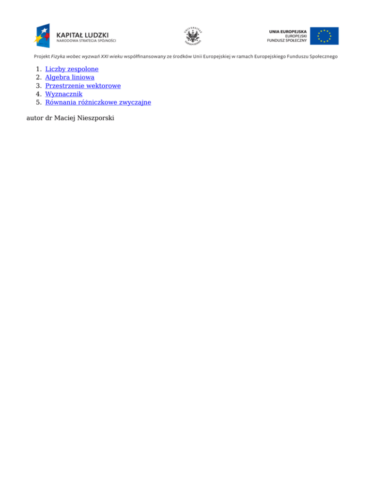 1. 2. 3. 4. 5. Liczby zespolone Algebra liniowa Przestrzenie wektorowe Wyznacznik Równania różniczkowe zwyczajne autor dr Maciej Nieszporski