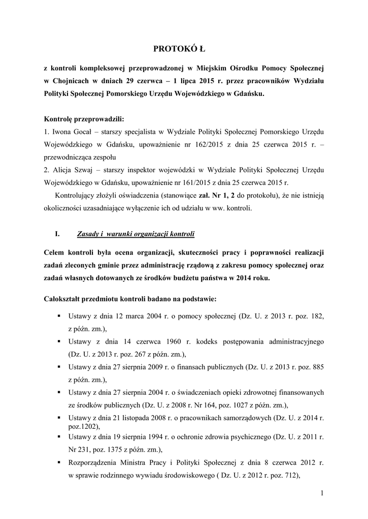 PROTOKÓ Ł z kontroli kompleksowej przeprowadzonej w Miejskim Ośrodku Pomocy Społecznej w Chojnicach w dniach 29 czerwca – 1 lipca 2015 r. przez pracowników Wydziału Polityki Społecznej Pomorskiego Urzędu Wojewódzkiego w Gdańsku. Kontrolę przeprowadzili: 1. Iwona Gocał – starszy specjalista w Wydziale Polityki Społecznej Pomorskiego Urzędu Wojewódzkiego w Gdańsku, upoważnienie nr 162/2015 z dnia 25 czerwca 2015 r. – przewodnicząca zespołu 2. Alicja Szwaj – starszy inspektor wojewódzki w Wydziale Polityki Społecznej Urzędu Wojewódzkiego w Gdańsku, upoważnienie nr 161/2015 z dnia 25 czerwca 2015 r. Kontrolujący złożyli oświadczenia (stanowiące zał. Nr 1, 2 do protokołu), że nie istnieją okoliczności uzasadniające wyłączenie ich od udziału w ww. kontroli. I. Zasady i warunki organizacji kontroli Celem kontroli była ocena organizacji, skuteczności pracy i poprawności realizacji zadań zleconych gminie przez administrację rządową z zakresu pomocy społecznej oraz zadań własnych dotowanych ze środków budżetu państwa w 2014 roku. Całokształt przedmiotu kontroli badano na podstawie: Ustawy z dnia 12 marca 2004 r. o pomocy społecznej (Dz. U. z 2013 r. poz. 182, z późn. zm.), Ustawy z dnia 14 czerwca 1960 r. kodeks postępowania administracyjnego (Dz. U. z 2013 r. poz. 267 z późn. zm.), Ustawy z dnia 27 sierpnia 2009 r. o finansach publicznych (Dz. U. z 2013 r. poz. 885 z późn. zm.), Ustawy z dnia 27 sierpnia 2004 r. o świadczeniach opieki zdrowotnej finansowanych ze środków publicznych (Dz. U. z 2008 r. Nr 164, poz. 1027 z późn. zm.), Ustawy z dnia 21 listopada 2008 r. o pracownikach samorządowych (Dz. U. z 2014 r. poz.1202), Ustawy z dnia 19 sierpnia 1994 r. o ochronie zdrowia psychicznego (Dz. U. z 2011 r. Nr 231, poz. 1375 z późn. zm.), Rozporządzenia Ministra Pracy i Polityki Społecznej z dnia 8 czerwca 2012 r. w sprawie rodzinnego wywiadu środowiskowego ( Dz. U. z 2012 r. poz. 712), 1 Rozporządzenia Ministra Polityki Społecznej z dnia 22 września 2005 r. w sprawie specjalistycznych usług opiekuńczych (Dz. U. Nr 189, poz. 1598 z późn. zm.). Rozporządzenia Ministra Pracy i Polityki Społecznej z dnia 8 listopada 2010 r. w sprawie wzoru kontraktu socjalnego (Dz. U. Nr 218, poz. 1439). Informacja o przeprowadzeniu przedmiotowej kontroli: Jednostka kontrolowana została powiadomiona o przeprowadzeniu przedmiotowej kontroli pismem z dnia 1 czerwca 2015 r., znak: PS-II.431.1.16.2015 IG (zał. nr 3). Podstawa przeprowadzenia kontroli: Upoważnienia nr 161/2015, 162/2015, 25 z dnia czerwca 2015 r., (zał. nr 4, 5). Ustalenia ogólne: Ilekroć w protokole jest mowa o: - Ośrodku – należy przez to rozumieć: Miejski Ośrodek Pomocy Społecznej w Chojnicach, - Dyrektorze – należy przez to rozumieć Dyrektora Miejskiego Ośrodka Pomocy Społecznej w Chojnicach. - ustawie o pomocy społecznej – należy przez to rozumieć: ustawę z dnia 12 marca 2004 r. o pomocy społecznej (Dz. U. z 2013 r. poz. 182 z późn. zm.), - Kpa – należy rozumieć: ustawę z dnia 14 czerwca 1960 r. Kodeks postepowania administracyjnego (Dz. U. z 2013 poz. 267 z późn. zm.). Badaniem kontrolnym objęto następujące zagadnienia: 1) ogólne ustalenia organizacyjne dotyczące Miejskiego Ośrodka Pomocy Społecznej w Chojnicach, 2) zgodność zatrudnienia pracowników z wymaganymi kwalifikacjami zgodnie z art. 116 ustawy o pomocy społecznej, 3) wydatki na pomoc społeczną w 2014 r., 4) zasadność przyznawania świadczeń w ramach zadań zleconych i zadań własnych dotowanych z budżetu państwa, 5) prawidłowość stosowania kontraktów socjalnych 6) prawidłowość i terminowość przeprowadzania rodzinnych wywiadów środowiskowych i rozpatrywania wniosków, 7) współpracę z podmiotami uczestniczącymi w rozwiązywaniu problemów społecznych. 2 W toku kontroli wyjaśnień udzielała: - Elżbieta Szczepańska – Dyrektor Miejskiego Ośrodka Pomocy Społecznej w Chojnicach. II. Ustalenia kontrolne Ad.1 Miejski Ośrodek Pomocy Społecznej w Chojnicach został powołany na mocy Zarządzenia Nr 4/90 Naczelnika Miasta Chojnic z dnia 30 kwietnia 1990 r. w sprawie utworzenia Miejskiego Ośrodka Pomocy Społecznej w Chojnicach (zał. nr 6). Statut Ośrodka Pomocy Społecznej w Chojnicach został wprowadzony Uchwałą Rady Miejskiej Nr XII/132/95 z dnia 28 września 1995 r. w sprawie nadania statutu Miejskiemu Ośrodkowi Pomocy Społecznej w Chojnicach. Określał zadania, cele i organizację wewnętrzną Ośrodka. (zał. nr 7). W związku ze zmianami zachodzącymi w pomocy społecznej statut był kilka razy zmieniany w celu dostosowania do aktualnie obowiązującego stanu prawnego. Na dzień kontroli obowiązywał statut nadany Uchwałą Nr XXI/229/12 Rady Miejskiej w Chojnicach z dnia 2 lipca 2012 r., (zał. nr 8). Ośrodek posiada Regulamin organizacyjny, który został wprowadzony w dniu 1 lutego 2002 r. na podstawie uchwały Nr XLII/464/02 z dnia 28 stycznia 2002 r. w sprawie uchwalenia statutu Miejskiego Ośrodka Pomocy Społecznej w Chojnicach. (zał. nr 9). W wyniku zmian w organizacji Ośrodka regulamin był aktualizowany. Ostatnie zmiany do Regulaminu organizacyjnego zostały wprowadzone Zarządzeniem Nr 17/2014 Dyrektora Miejskiego Ośrodka Pomocy Społecznej w Chojnicach z dnia 27 października 2014 r. (zał. nr 10). W oparciu o art. 110 ust. 7 ustawy o pomocy społecznej Burmistrz Miasta Chojnice od dnia 1 marca 2011 r. upoważnił Dyrektora Miejskiego Ośrodka Pomocy Społecznej w Chojnicach do wydawania decyzji administracyjnych w indywidualnych sprawach z zakresu pomocy społecznej należących do właściwości gminy (zał. nr 11). W 2011 roku na wniosek Dyrektora Ośrodka, Burmistrz Miasta Chojnice udzielił upoważnienia: p.o. Kierownikowi Działu Pomocy Środowiskowej Miejskiego Ośrodka Pomocy Społecznej w Chojnicach od dnia 1 marca 2011 r. do wydawania decyzji administracyjnych w indywidualnych sprawach z zakresu 