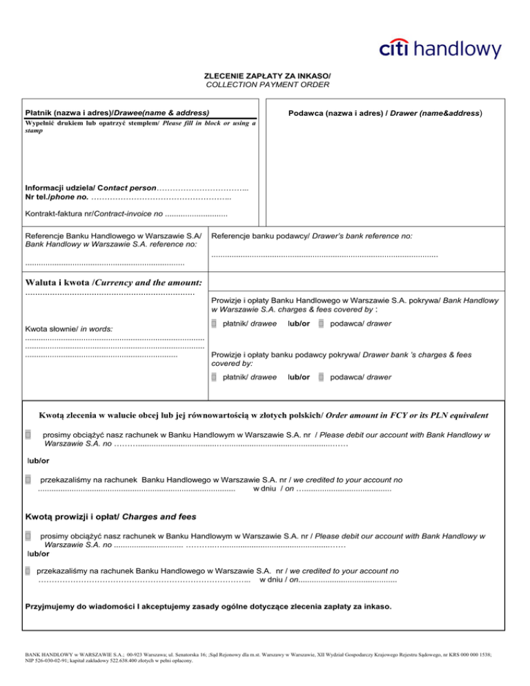 ZLECENIE ZAPŁATY ZA INKASO/ COLLECTION PAYMENT ORDER Podawca (nazwa i adres) / Drawer (name&address) Płatnik (nazwa i adres)/Drawee(name & address) Wypełnić drukiem lub opatrzyć stemplem/ Please fill in block or using a stamp Informacji udziela/ Contact person…………………………….. Nr tel./phone no. …………………………………………….. Kontrakt-faktura nr/Contract-invoice no ............................ Referencje Banku Handlowego w Warszawie S.A/ Bank Handlowy w Warszawie S.A. reference no: Referencje banku podawcy/ Drawer’s bank reference no: ..................................................................................................... ....................................................................... Waluta i kwota /Currency and the amount: ..................................................................... Prowizje i opłaty Banku Handlowego w Warszawie S.A. pokrywa/ Bank Handlowy w Warszawie S.A. charges & fees covered by : płatnik/ drawee lub/or podawca/ drawer Kwota słownie/ in words: ................................................................................ ................................................................................ .................................................................... Prowizje i opłaty banku podawcy pokrywa/ Drawer bank ’s charges & fees covered by: płatnik/ drawee lub/or podawca/ drawer Kwotą zlecenia w walucie obcej lub jej równowartością w złotych polskich/ Order amount in FCY or its PLN equivalent prosimy obciążyć nasz rachunek w Banku Handlowym w Warszawie S.A. nr / Please debit our account with Bank Handlowy w Warszawie S.A. no ………...................................…................................................…… lub/or przekazaliśmy na rachunek Banku Handlowego w Warszawie S.A. nr / we credited to your account no ........................................................................................ w dniu / on …....................................... Kwotą prowizji i opłat/ Charges and fees prosimy obciążyć nasz rachunek w Banku Handlowym w Warszawie S.A. nr / Please debit our account with Bank Handlowy w Warszawie S.A. no ............................... ………..…................................................…… lub/or przekazaliśmy na rachunek Banku Handlowego w Warszawie S.A. nr / we credited to your account no …………………………………………………………………….. w dniu / on............................................ Przyjmujemy do wiadomości I akceptujemy zasady ogólne dotyczące zlecenia zapłaty za inkaso. BANK HANDLOWY w WARSZAWIE S.A.; 00-923 Warszawa; ul. Senatorska 16; ;Sąd Rejonowy dla m.st. Warszawy w Warszawie, XII Wydział Gospodarczy Krajowego Rejestru Sądowego, nr KRS 000 000 1538; NIP 526-030-02-91; kapitał zakładowy 522.638.400 złotych w pełni opłacony. ZASADY OGÓLNE DOTYCZĄCE WYKONANIA ZLECENIA ZAPŁATY ZA INKASO/ GENERAL TERMS RELATED TO THE EXECUTION OF COLLECTION PAYMENT ORDER 1. Bank dokonuje zapłaty za inkaso według dyspozycji płatnika zgodnie z instrukcją banku podawcy./ The Bank executes the collection payment order according to the drawee’s directions and instructions of the drawer’s bank. 2. Bank nie ponosi odpowiedzialności za skutki powstałe w wyniku przerwy w działalności spowodowanej siłą wyższą, rozruchami, zamieszkami wewnętrznymi, powstaniami, wojnami, strajkami, lokautami lub innymi przyczynami, na które banki nie mają wpływu./ The Bank assumes no liability or responsibility for consequences arising out of interruption in its business by Acts of God, riots, civil commotions, insurrections, wars, strikes or lockouts or any other causes beyond its control. 3. Bank nie wyda dokumentów i nie będzie odpowiedzialny za jakiekolwiek skutki powstałe w wyniku opóźnień w wydaniu dokumentów, jeżeli płatnik odmawia zapłaty kosztów, prowizji, lub odsetek, które nie mogą być uchylone./ The Bank will not release documents and will not be liable for any consequences arising out of delays in releasing the documents, if the drawee refuses to cover costs, commissions, and/or interest, which it is not authorized to waive. 4. Płatnik przyjmuje na siebie wszelkie zobowiązania i konsekwencje wynikające z praw i zwyczajów obowiązujących za granicą./ The drawee accepts any obligations and consequences arising out of the rights and conventions in operation in other jurisdictions. 5. Przedkładane zlecenie musi być zgodne z obowiązującymi w kraju przepisami dewizowymi./ All requests must be in accordance with the Polish foreign exchange regulations. 6. Niniejszym oświadczam(y), że Bank Handlowy w Warszawie S.A. będzie zwolniony z jakiejkolwiek odpowiedzialności za szkody poniesione przeze mnie(nas) na skutek prawidłowego wykonania niniejszego Zlecenia, chyba że szkoda ta powstała z winy umyślnej Banku/ I/We hereby declare, that Bank Handlowy w Warszawie S.A. will bear no responsibility for damages which I/we may suffer as a result of proper execution of this Order, unless such damage has occurred due to an intentional fault of Bank Handlowy w Warszawie S.A. Wypełnia Bank / for Bank use only Miejscowość /Place.....................dnia/ date.................... Pieczęć firmowa, imię i nazwisko osób/osoby podpisującej w imieniu Płatnika i jej podpis /Stamp, name and surname of authorized person in the name od Drawee, signature Podpisy osób upoważnionych zgodnie z KRS, o ile nie złożono odrębnego pełnomocnictwa / Signature(s) of authorized representatives - as per the National Court Register, unless a separate Power of Attorney has been provided Podpisy zgodne / Signatures verified BANK HANDLOWY w WARSZAWIE S.A.; 00-923 Warszawa; ul. Senatorska 16; Sąd Rejonowy dla m.st. Warszawy w Warszawie, XII Wydział Gospodarczy Krajowego Rejestru Sądowego, nr KRS 000 000 1538; NIP 526-030-02-91; kapitał zakładowy 522.638.400 złot