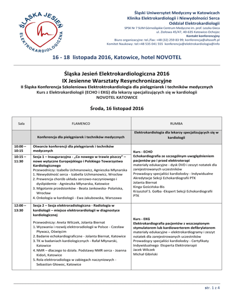 Śląski Uniwersytet Medyczny w Katowicach Klinika Elektrokardiologii i Niewydolności Serca Oddział Elektrokardiologii SPSK Nr 7 SUM Górnośląskie Centrum Medyczne im. prof. Leszka Gieca ul. Ziołowa 45/47, 40-635 Katowice-Ochojec Kontakt konferencyjny Biuro organizacyjne: tel./fax: +48 (32) 259 83 99; [email protected] Komitet Naukowy: tel:+48 535 041 555 konferencja@elektrokardiologia@info 16 - 18 listopada 2016, Katowice, hotel NOVOTEL Śląska Jesień Elektrokardiologiczna 2016 IX Jesienne Warsztaty Resynchronizacyjne II Śląska Konferencja Szkoleniowa Elektroktrokardiologia dla pielęgniarek i techników medycznych Kurs z Elektrokardiologii (ECHO i EKG) dla lekarzy specjalizujących się w kardiologii NOVOTEL KATOWICE Środa, 16 listopad 2016 Sala FLAMENCO RUMBA Konferencja dla pielęgniarek i techników medycznych Elektrokardiologia dla lekarzy specjalizujących się w kardiologii 10:00 – 10:15 Otwarcie konferencji dla pielęgniarek i techników medycznych 10:15 – 11:30 Sesja 1 – Inauguracyjna - „Co nowego w trawie piszczy” – nowe wytyczne Europejskiego i Polskiego Towarzystwa Kardiologicznego Przewodniczy: Izabella Uchmanowicz, Agnieszka Młynarska 1. Niewydolność serca - Izabella Uchmanowicz, Wrocław 2. Prewencja chorób układu sercowo-naczyniowego i dyslipidemie - Agnieszka Młynarska, Katowice 3. Migotanie przedsionków - Beata Jankowska- Polańska, Wrocław 4. Onkologia w kardiologii - Ewa Jakubowska, Warszawa 12:00 – 13:30 Sesja 2 – Sesja elektroradiologiczna - Radiologia w kardiologii – miejsce elektrorardiologii w diagnostyce kardiologicznej Przewodniczy: Aneta Wilczek, Jolanta Biernat 1. Wyzwania i rozwój elektroradiologii w Polsce - Czesław Pływacz, Oświęcim 2. Badanie echokardiograficzne - Jolanta Biernat, Katowice 3. TK w badaniach kardiologicznych - Rafał Młynarski, Katowice 4. NMR – dlaczego to działa. Podstawy NMR serca - Joanna Kidoń, Katowice 5. Rola elektroradiologa w zabiegach naczyniowych Sebastian Głowoc, Katowice Kurs - ECHO Echokardiografia ze szczególnym uwzględnieniem pacjentów po i przed elektroterapi materiały edukacyjne - dysk DVD i zeszyt notatek dla zarejestrowanych uczestników Prowadzący specjaliści kardiolodzy - Indywidualne Akredytacje Sekcji Echokardiografii PTK Jolanta Biernat Kinga Gościńska-Bis Krzysztof S. Gołba -Ekspert Sekcji Echokardiografii PTK Kurs - EKG Elektrokardiografia pacjentów z wszczepionym stymulatorem lub kardiowerterem defibrylatorem materiały edukacyjne – elektrokardiogramy i zeszyt notatek dla zarejestrowanych uczestników Prowadzący specjaliści kardiolodzy - Certyfikaty Indywidualnego Eksperta Elektroterapii Jacek Wilczek Michał Gibiński str. 1 z 4 16 - 18 listopada 2016, Katowice, hotel NOVOTEL 14:00 – 15:30 Sesja elektrokardiologiczna - Zaburzenia rytmu serca – zintegrowana opieka zespołu terapeutycznego Przewodniczy: Dorota Krówczyńska, Katarzyna Łagoda 1. Opieka nad pacjentem kwalifikowanym do implantacji urządzeń antyarytmicznych – od przyjęcia do wypisu Katarzyna Łagoda, Białystok 2. Diagnostyka, leczenie i monitorowanie zaburzeń rytmu serca - Karolina Waga, Katowice 3. Ablacje – rola pielęgniarki w opiece przed i po - Eliza Szklarz, Zabrze 4. Intensywna opieka kardiologiczna nad pacjentem z zaburzeniami rytmu serca – OIOM – Maria Walkiewicz, Warszawa 5. Rehabilitacja przed i po implantacji urządzeń antyarytmicznych – czy każdy może ćwiczyć tak samo? Agata Gołba, Katowice Sala 16:00 – 17:30 19:00 FLAMENCO Egzamin próbny z elektrokardiologii dla lekarzy specjalizujących się w kardiologii (EKG, ECHO) Warsztaty Podstawy programowania urządzeń wszczepialnych dla kardiologów 1. Programowanie 2. Elektroterapia serca w pytaniach pacjentów 3. Możliwości terapeutyczne i diagnostyczne współczesnych urządzeń o leczenia zaburzeń rytmu serca - innowacje 4. Urządzenia wszcepialne środowisku rezonansu magnetycznego SALSA Warsztaty dla pielęgniarek i techników medycznych Nowe wytyczne resuscytacji krążeniowo-oddechowej (RKO) RUMBA Warsztaty programowania urządzeń wszczepialnych dla pielęgniarek i techników medycznych Podstawy programowania urządzeń wszczepialnych Get together str. 2 z 4 16 - 18 listopada 2016, Katowice, hotel NOVOTEL Czwartek, 17 listopad 2016 Sala FLAMENCO/RUMBA 8:15 – 8:30 8:30 – 10:00 Otwarcie Konferencji 10:30 – 12:30 Sesja 2 – Resynchronizacja - nowe wyzwania (wykład 20’ + dyskusja 10’) 1. Stymulacja wielopunktowa prawej i lewej komory - „multisite & multipoint”, Przemysław Mitkowski, Poznań 2. Resynchronizacja a prawa komora, Oskar Kowalski, Zabrze 3. Bezpośrednia stymulacja lewej komory - „endocardial pacing”, blaski i cienie – Maciej Sterliński, Warszawa 4. Pęczek Hisa jako miejsce stymulacji – Paweł Dąbrowski, Zamość Sesja 3 – Echocardiography for electrocardiologists (EPs) – Echokardiografia dla elektrokardiologów (lecture 20’ + with the audience 10’) język sesji angielski, przeźrocza po angielsku i po polsku 1. Novel Echocardiographic Techniques for Assessment of Right Ventricular Geometry and Function – Luigi Badano, Padua, IT 2. Long-term Right Ventricle Pacing - Detrimental Effects on Cardiac Structure and Function – Tomasz Kukulski, Zabrze 3. Echocardiography and CRT, friends or foes – Krzysztof S. Gołba, Katowice 4. Troubleshooting Cases – Echocardiography in Solving Clinical Problems with Electrotherapy (case 7’+with the audience 3’) a) Tricuspid Valve and Lead Interference – Kinga Goscińska-Bis, Katowice b) HIS-Bundle Pacing – Solution for Deterioration of RV after Long-term Apical Stimulation – Karolina Waga, Katowice c) TBA, Mariola Szulik, Zabrze Sesja 4 – Co nowego w standardach ESC 2015/2016 dla elektrokardiologów i nie tylko – autorskie refleksje (wykład 20’ + dyskusja 10’) 1. Komorowe zaburzenia rytmu i nagły zgon sercowy – Krzysztof J. Wranicz, Łódź 2. Niewydolność serca – Ewa Straburzyńska-Mig