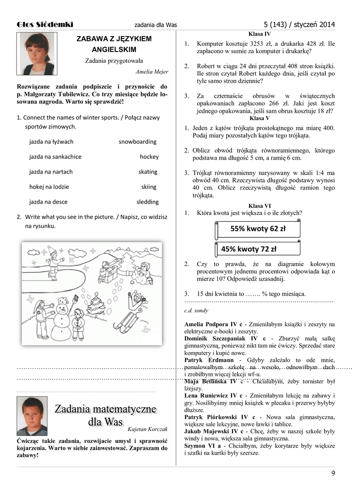 Głos Siódemki 5 (143) / styczeń 2014 zadania dla Was ________________________________________________________________________________________________________________________________________________________________________________________________________________________________________________________________________________________________________________________________________________________________________________________________________________________________________________________________ ZABAWA Z JĘZYKIEM ANGIELSKIM Zadania przygotowała Amelia Mejer Rozwiązane zadania podpiszcie i przynoście do p. Małgorzaty Tubilewicz. Co trzy miesiące będzie losowana nagroda. Warto się sprawdzić! 1. Connect the names of winter sports. / Połącz nazwy sportów zimowych. jazda na łyżwach Klasa IV 1. Komputer kosztuje 3253 zł, a drukarka 428 zł. Ile zapłacono w sumie za komputer i drukarkę? 2. Robert w ciągu 24 dni przeczytał 408 stron książki. Ile stron czytał Robert każdego dnia, jeśli czytał po tyle samo stron dziennie? 3. Za czternaście obrusów w świątecznych opakowaniach zapłacono 266 zł. Jaki jest koszt jednego opakowania, jeśli sam obrus kosztuje 18 zł? Klasa V 1. Jeden z kątów trójkąta prostokątnego ma miarę 400. Podaj miary pozostałych kątów tego trójkąta. snowboarding jazda na sankach ice hockey jazda na nartach skating hokej na lodzie skiing jazda na desce sledding 2. Write what you see in the picture. / Napisz, co widzisz na rysunku. 2. Oblicz obwód trójkąta równoramiennego, którego podstawa ma długość 5 cm, a ramię 6 cm. 3. Trójkąt równoramienny narysowany w skali 1:4 ma obwód 40 cm. Rzeczywista długość podstawy wynosi 40 cm. Oblicz rzeczywistą długość ramion tego trójkąta. Klasa VI 1. Która kwota jest większa i o ile złotych? 55% kwoty 62 zł 45% kwoty 72 zł 2. Czy to prawda, że na diagramie kołowym procentowym jednemu procentowi odpowiada kąt o mierze 10? Odpowiedź uzasadnij. 3. 15 dni kwietnia to ……. % tego miesiąca. ```````````````````````````````````````````````````````````````````````````` c.d. sondy Amelia Podpora IV c - Zmieniłabym książki i zeszyty na elektryczne e-booki i zeszyty. Dominik Szczepaniak IV c - Zburzyć małą salkę gimnastyczną, ponieważ nikt tam nie ćwiczy. Sprzedać stare komputery i kupić nowe. Patryk Erdmann - Gdyby zależało to ode mnie, ………………………………………………………………………………………………………………………………………… pomalowałbym szkołę na wesoło, odnowiłbym dach i zrobiłbym więcej lekcji wf-u. …………………………………………………………………………………………………………… Maja Betlińska IV c - Chciałabym, żeby tornister był lżejszy. Lena Runiewicz IV c - Zmieniłabym lekcję na zabawy i gry. Nosilibyśmy mniej książek w plecaku i przerwy byłyby dłuższe. Patryk Piórkowski IV c - Nowa sala gimnastyczna, większe sale lekcyjne, nowe ławki i tablice. Kajetan Korczak Jakub Majewski IV c - Chcę, żeby w naszej szkole były windy i nowa, większa sala gimnastyczna. Ćwicząc takie zadania, rozwijacie umysł i sprawność Szymon VI a - Chciałbym, żeby korytarze były większe kojarzenia. Warto w siebie zainwestować. Zapraszam do i szafki na kurtki były szersze. zabawy! 1----------------------------------------------------------------------------------------------------------------------------- ----------------------------------------------------------------------------------------------------------------------------------------------------------------------------------------- ---------------------------------------- ________________________________________________________________________________________________________________________________________________________________________________________________________________________________________________________________________________________________________________________________________________________________________________________________________________________________________________________________________________________________________________________________________________________________________________ 9