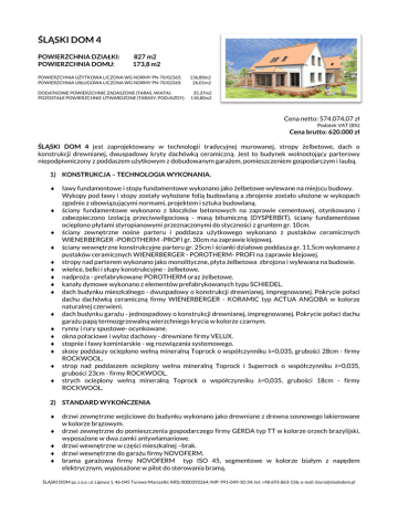 ŚLĄSKI DOM D 4 POWIERZC CHNIA DZIAŁ ŁKI: POWIERZC CHNIA DOMU: 827 7 m2 173 3,8 m2 POWIERZCHNIA A UŻYTKOWA LIC CZONA WG NORMY PN-70/02365 5: POWIERZCHNIA A USŁUGOWA LIC CZONA WG NORMY PN-70/02365 5: 136,80m2 26,01m2 DODATKOWE POWIERZCHNIE P Z ZADASZONE (TAR RAS, WIATA): POZOSTAŁE PO OWIERZCHNIE UT TWARDZONE (TA ARASY, PODJAZDY): 35,37m2 118,80m2 C Cena netto: 574.074,07 złł Po odatek VAT (8%)) Cena brutto o: 620.000 złł ŚLĄSKI DO OM 4 jest zaprojektow z wany w tech hnologii trad dycyjnej murrowanej, strropy żelbeto owe, dach o konstrukcji drewnianej, dwuspadow wy kryty dach hówką ceram miczną. Jest to budynek wolnostojący parterowy y niepodpiwniczony z poddaszem użyttkowym z dob budowanym garażem, pom mieszczeniem m gospodarczym i laubą. 1) KONSTRUKCJA A – TECHNO OLOGIA WYK KONANIA. ♦ ♦ ♦ ♦ ♦ ♦ ♦ ♦ ♦ ♦ ♦ ♦ ♦ ♦ ♦ ♦ ław wy fundamenttowe i stopy fundamentow f we wykonano jako żelbettowe wylewa ane na miejscu budowy. Wy ykopy pod ław wy i stopy zo ostały wyłożo one folią bud dowlaną a zb brojenie zosta ało ułożone w wykopach h zgo odnie z obowiiązującymi no ormami, projektem i sztuk ka budowlaną. ścia any fundame entowe wyko onano z blocczków beton nowych na zaprawie z cem mentowej, ottynkowano i zab bezpieczono izolacją prze eciwwilgocio ową - masą bitumiczną (DYSPERBIT ( T), ściany fun ndamentowe e ocie eplono płytam mi styropiano owymi przezznaczonymi do d styczności z gruntem gr. 10cm. ścia any zewnętrrzne nośne parteru i po oddasza uży ytkowego wykonano z pustaków ce eramicznych h WIE ENERBERGE ER -POROTH HERM -PROF FI gr. 30cm na a zaprawie klejowej. ścia any wewnętrzne konstruk kcyjne parterru gr. 25cm i ścianki działo owe poddaszza gr. 11,5cm m wykonano z pusstaków ceram micznych WIE ENERBERGE ER - POROTH HERM- PROF FI na zaprawiie klejowej. stro opy nad parte erem wykona ano jako mon nolityczne, płłyta żelbetow wa zbrojona i wylewana na n budowie. wie eńce, belki i słłupy konstrukcyjne - żelbetowe. nad dproża - prefa abrykowane POROTHER RM oraz żelbe etowe. kan nały dymowe wykonano z elementów prefabrykow p wanych typu SCHIEDEL. S dacch budynku mieszkalnego m o - dwuspado owy o konstru ukcji drewnia anej, impregn nowanej. Pok krycie połacii dacchu dachówk ką ceramiczn ną firmy WIE ENERBERGER - KORAM MIC typ ACTUA ANGOBA A w kolorze e naturalnej czerw wieni. dacch budynku garażu - jedno ospadowy o konstrukcji k drewnianej, im mpregnowan nej. Pokrycie połaci dachu u gara ażu papą term mozgrzewaln ną wierzchnie ego krycia w kolorze czarrnym. rynny i rury spusstowe- ocynk kowane. okn na połaciowe i wyłaz dach howy - drewn niane firmy VELUX. stop pnie i ławy ko ominiarskie - wg rozwiąza ania systemo owego. sko osy poddaszy y ocieplono wełną w minera alną Toprock o współczyn nniku λ=0,03 35, grubości 28cm 2 - firmy y ROCKWOOL. stro op nad podd daszem ociep plony wełna a mineralną Toprock i Superrock o współczynniku λ=0,035,, grubości 23cm - firmy ROCK KWOOL. stry ych ocieplon ny wełną mineralną m To oprock o współczynniku u λ=0,035, grubości 18 8cm - firmy y ROCKWOOL. 2) STA ANDARD WY YKOŃCZENIA ♦ ♦ ♦ ♦ ♦ drzw wi zewnętrzn ne wejściowe e do budynku u wykonano jako j drewnia ane z drewna a sosnowego lakierowane e w kolorze brązo owym. drzw wi zewnętrzn ne do pomiesszczenia gospodarczego firmy f GERDA A typ TT w kolorze orzecch brazylijski,, wyp posażone w dwa d zamki an ntywłamaniowe. drzw wi wewnętrzzne w części mieszkalnej m – –brak. drzw wi wewnętrzzne do garażu u firmy NOVO OFERM. brama garażow wa firmy NO OVOFERM typ ISO 45, 4 segmento owe w kolo orze białym z napędem m elek ktrycznym, wyposażone w w pilot do ste erowania bramą. ŚLĄSKI DOM sp. s z o.o. ul. Lipowa a 1, 46-045 Turaw wa-Marszałki; KRS:: 0000392264; NIP: 991-049-10-34 4; tel: +48 693-863 3-136; e-mail: [email protected] ♦ ♦ ♦ ♦ ♦ ♦ ♦ ♦ ♦ okna i drzwi tarasowe wykonane z PCV firmy MS , profil typu A, szer. 73 mm, wkład trzyszybowy Ug=0,5 w okleinie dwustronnej kolor macore. rolety nadstawne z napędem elektrycznym, model PORTOS TERMOLUX z pancerzem aluminiowym w kolorze bieli kremowej. witryny szklane w laubie wykonane z PCV, profil typu A, szer. 73 mm, wkład dwuszybowy Ug=1,0 w okleinie kolor macore. parapety zewnętrzne wykonane z cegły klinkierowej pełnej RÖBEN typ DARWIN z fugą w kolorze szarym. parapety wewnętrzne wykonane z marmuru BRECCIA o grubości 2cm. posadzki: parteru: dwie warstwy folii budowlanej na chudym betonie, styropian FS 100 gr.10cm, folia refleksyjna pod ogrzewanie podłogowe, jastrych cementowy gr. ok. 7cm. poddasza: styropian FS 100 gr. 5cm, ułożony na płycie żelbetowej, folia refleksyjna pod ogrzewanie podłogowe, jastrych cementowy, ok. 7cm. tynki: na ścianach w salonie, kuchni, łazienkach oraz w garażu i pomieszczeniu technicznym - tynk cementowo-wapienny III kategorii. na ścianach i sufitach w pozostałych pomieszczeniach mieszkalnych-tynki gipsowe. kratki wentylacyjne i drzwiczki rewizyjne - wg rozwiązań systemowych. schody wewnętrzne drewniane –brak. 3) ELEWACJE ♦ ♦ ♦ ♦ ♦ ♦ elewację budynku ocieplono styropianem EPS 70 - gr. 15cm. elewację budynku mieszkalnego wykonano z akrylowego cienkowarstwowego tynku strukturalnego w kolorze białym na siatce zatopionej w kleju do systemu ociepleń. elewację lauby obłożono płytką klinkierową firmy RÖBEN typ DARWIN z fugą w kolorze szarym. elewację tarasu zadaszonego obłożono płytką klinkierową firmy RÖBEN typ DARWIN z fugą w kolorze szarym. elewację garażu wykonano z akrylowego cienkowarstwowego tynku strukturalnego w kolorze białym na siatce zatopionej w kleju do systemu ociepleń. gzymsy na elewacjach budynku zostały wykonane z kształtek styropianowych pokrytych klejem z siatką, pomalowane w kolorze elewacji głównej budynku mieszkalnego. 4) INSTALACJE SANITARNE Ilość i lokalizacja elementów grzewczych oraz podejś