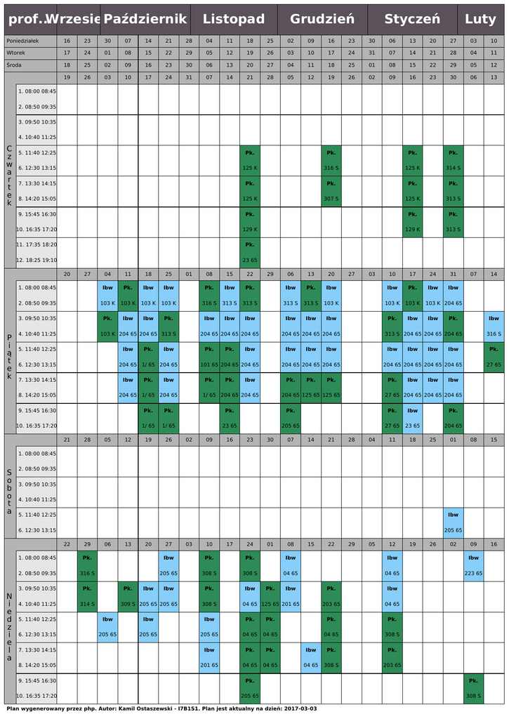 prof... Wrzesień Październik Listopad Grudzień Styczeń Luty Poniedziałek 16 23 30 07 14 21 28 04 11 18 25 02 09 16 23 30 06 13 20 27 03 10 Wtorek 17 24 01 08 15 22 29 05 12 19 26 03 10 17 24 31 07 14 21 28 04 11 Środa 18 25 02 09 16 23 30 06 13 20 27 04 11 18 25 01 08 15 22 29 05 12 19 26 03 10 17 24 31 07 14 21 28 05 12 19 26 02 09 16 23 30 06 13 07 14 1. 08:00 08:45 2. 08:50 09:35 3. 09:50 10:35 4. 10:40 11:25 C z w a r t e k 5. 11:40 12:25 Pk. Pk. Pk. Pk. 6. 12:30 13:15 125 K 316 S 125 K 314 S 7. 13:30 14:15 Pk. Pk. Pk. Pk. 8. 14:20 15:05 125 K 307 S 125 K 313 S 9. 15:45 16:30 Pk. Pk. Pk. 10. 16:35 17:20 129 K 129 K 313 S 11. 17:35 18:20 Pk. 12. 18:25 19:10 23 65 20 P i ą t e k 27 04 11 18 25 1. 08:00 08:45 Ibw Pk. Ibw 2. 08:50 09:35 103 K 103 K 3. 09:50 10:35 Pk. Ibw 4. 10:40 11:25 01 08 15 22 Ibw Pk. Ibw 103 K 103 K 316 S Ibw Pk. Ibw 103 K 204 65 204 65 313 S 5. 11:40 12:25 Ibw 6. 12:30 13:15 Pk. Ibw Pk. 06 13 20 Pk. Ibw Pk. 313 S 313 S 313 S Ibw Ibw Ibw 204 65 204 65 204 65 Ibw Pk. 204 65 1/ 65 204 65 7. 13:30 14:15 29 Pk. Pk. Pk. 03 10 17 24 31 Ibw Ibw Pk. Ibw Ibw 313 S 103 K 103 K 103 K Ibw Ibw Pk. Ibw 204 65 204 65 204 65 Ibw Ibw 101 65 204 65 204 65 Ibw 27 Ibw Pk. Pk. Ibw Pk. Ibw Ibw Ibw Ibw Pk. Pk. Ibw Pk. Pk. Pk. Pk. Pk. Ibw Pk. 10. 16:35 17:20 1/ 65 1/ 65 23 65 205 65 27 65 23 65 204 65 19 26 11 18 02 09 16 23 30 07 14 21 27 65 Ibw 9. 15:45 16:30 12 204 65 125 65 125 65 Ibw 1/ 65 204 65 204 65 05 Pk. 204 65 204 65 204 65 204 65 204 65 1/ 65 204 65 28 316 S Ibw 8. 14:20 15:05 21 Ibw 313 S 204 65 204 65 204 65 204 65 204 65 204 65 Ibw 103 K 204 65 27 65 204 65 204 65 204 65 28 04 25 01 08 15 09 16 1. 08:00 08:45 S o b o t a 2. 08:50 09:35 3. 09:50 10:35 4. 10:40 11:25 5. 11:40 12:25 Ibw 6. 12:30 13:15 205 65 22 N i e d z i e l a 29 06 13 20 27 03 10 17 24 01 08 15 22 29 05 12 19 26 02 1. 08:00 08:45 Pk. Ibw Pk. Pk. Ibw Ibw Ibw 2. 08:50 09:35 316 S 205 65 308 S 308 S 04 65 04 65 223 65 3. 09:50 10:35 Pk. Ibw Pk. Ibw 4. 10:40 11:25 314 S Pk. Ibw 309 S 205 65 205 65 308 S Pk. Ibw 04 65 125 65 201 65 Pk. Ibw 203 65 04 65 5. 11:40 12:25 Ibw Ibw Ibw Pk. Pk. Pk. Pk. 6. 12:30 13:15 205 65 205 65 205 65 04 65 04 65 04 65 308 S 7. 13:30 14:15 Ibw Pk. Pk. Ibw Pk. Pk. 8. 14:20 15:05 201 65 04 65 04 65 04 65 308 S 203 65 9. 15:45 16:30 Pk. Pk. 10. 16:35 17:20 205 65 308 S Plan wygenerowany przez php. Autor: Kamil Ostaszewski - I7B1S1. Plan jest aktualny na dzień: 2017-03-03