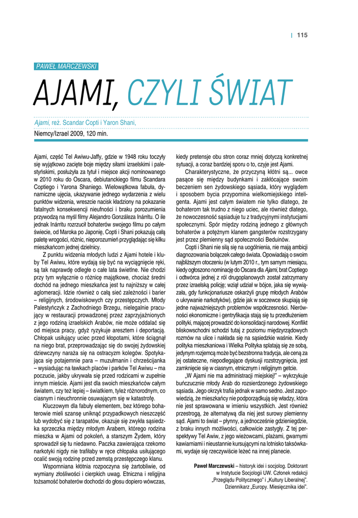 115 PAWEŁ MARCZEWSKI AJAMI, CZYLI ŚWIAT Ajami, reż. Scandar Copti i Yaron Shani, Niemcy/Izrael 2009, 120 min. Ajami, część Tel Awiwu-Jaffy, gdzie w 1948 roku toczyły się wyjątkowo zacięte boje między siłami izraelskimi i palestyńskimi, posłużyła za tytuł i miejsce akcji nominowanego w 2010 roku do Oscara, debiutanckiego filmu Scandara Coptiego i Yarona Shaniego. Wielowątkowa fabuła, dynamiczne ujęcia, ukazywanie jednego wydarzenia z wielu punktów widzenia, wreszcie nacisk kładziony na pokazanie fatalnych konsekwencji nieufności i braku porozumienia przywodzą na myśl filmy Alejandro Gonzáleza Inárritu. O ile jednak Inárritu rozrzucił bohaterów swojego filmu po całym świecie, od Maroka po Japonię, Copti i Shani pokazują całą paletę wrogości, różnic, nieporozumień przyglądając się kilku mieszkańcom jednej dzielnicy. Z punktu widzenia młodych ludzi z Ajami hotele i kluby Tel Awiwu, które wydają się być na wyciągnięcie ręki, są tak naprawdę odległe o całe lata świetlne. Nie chodzi przy tym wyłącznie o różnicę majątkowe, chociaż średni dochód na jednego mieszkańca jest tu najniższy w całej aglomeracji. Idzie również o całą sieć zależności i barier – religijnych, środowiskowych czy przestępczych. Młody Palestyńczyk z Zachodniego Brzegu, nielegalnie pracujący w restauracji prowadzonej przez zaprzyjaźnionych z jego rodziną izraelskich Arabów, nie może oddalać się od miejsca pracy, gdyż ryzykuje aresztem i deportacją. Chłopak usiłujący uciec przed kłopotami, które ściągnął na niego brat, przeprowadzając się do swojej żydowskiej dziewczyny naraża się na ostracyzm kolegów. Spotykająca się potajemnie para – muzułmanin i chrześcijanka – wysiadując na ławkach placów i parków Tel Awiwu – ma poczucie, jakby ukrywała się przed rodzicami w zupełnie innym mieście. Ajami jest dla swoich mieszkańców całym światem, czy też lepiej – światkiem, tyleż różnorodnym, co ciasnym i nieuchronnie osuwającym się w katastrofę. Kluczowym dla fabuły elementem, bez którego bohaterowie mieli szansę uniknąć przypadkowych nieszczęść lub wydobyć się z tarapatów, okazuje się zwykła sąsiedzka sprzeczka między młodym Arabem, którego rodzina mieszka w Ajami od pokoleń, a starszym Żydem, który sprowadził się tu niedawno. Paczka zawierająca rzekomo narkotyki nigdy nie trafiłaby w ręce chłopaka usiłującego ocalić swoją rodzinę przed zemstą przestępczego klanu. Wspomniana kłótnia rozpoczyna się żartobliwie, od wymiany złośliwości i cierpkich uwag. Etniczna i religijna tożsamość bohaterów dochodzi do głosu dopiero wówczas, kiedy pretensje obu stron coraz mniej dotyczą konkretnej sytuacji, a coraz bardziej sporu o to, czyje jest Ajami. Charakterystyczne, że przyczyną kłótni są... owce pasące się między budynkami i zakłócające swoim beczeniem sen żydowskiego sąsiada, który wyglądem i sposobem bycia przypomina wielkomiejskiego inteligenta. Ajami jest całym światem nie tylko dlatego, że bohaterom tak trudno z niego uciec, ale również dlatego, że nowoczesność sąsiaduje tu z tradycyjnymi instytucjami społecznymi. Spór między rodziną jednego z głównych bohaterów a potężnym klanem gangsterów rozstrzygany jest przez plemienny sąd społeczności Beduinów. Copti i Shani nie silą się na uogólnienia, nie mają ambicji diagnozowania bolączek całego świata. Opowiadają o swoim najbliższym otoczeniu (w lutym 2010 r., tym samym miesiącu, kiedy ogłoszono nominację do Oscara dla Ajami, brat Coptiego i odtwórca jednej z ról drugoplanowych został zatrzymany przez izraelską policję; wziął udział w bójce, jaka się wywiązała, gdy funkcjonariusze oskarżyli grupę młodych Arabów o ukrywanie narkotyków), gdzie jak w soczewce skupiają się jedne najważniejszych problemów współczesności. Nierówności ekonomiczne i gentryfikacja stają się tu przedłużeniem polityki, mającej prowadzić do konsolidacji narodowej. Konflikt bliskowschodni schodzi tutaj z poziomu międzyrządowych rozmów na ulice i nakłada się na sąsiedzkie waśnie. Kiedy polityka mieszkaniowa i Wielka Polityka splatają się ze sobą, jedynym rozjemcą może być bezstronna tradycja, ale ceną za jej ostateczne, niepodlegające dyskusji rozstrzygnięcia, jest zamknięcie się w ciasnym, etnicznym i religijnym getcie. „W Ajami nie ma administracji miejskiej!” – wykrzykuje buńczucznie młody Arab do rozsierdzonego żydowskiego sąsiada. Jego okrzyk trafia jednak w samo sedno. Jest zapowiedzią, że mieszkańcy nie podporządkują się władzy, która nie jest sprawowana w imieniu wszystkich. Jest również przestrogą, że alternatywą dla niej jest surowy plemienny sąd. Ajami to świat – płynny, a jednocześnie gdzieniegdzie, z braku innych możliwości, całkowicie zastygły. Z tej perspektywy Tel Awiw, z jego wieżowcami, plażami, gwarnymi kawiarniami i nieustannie kursującymi na lotnisko taksówkami, wydaje się rzeczywiście leżeć na innej planecie. Paweł Marczewski – historyk idei i socjolog. Doktorant w Instytucie Socjologii UW. Członek redakcji „Przeglądu Politycznego” i „Kultury Liberalnej”. Dziennikarz „Europy. Miesięcznika idei”.