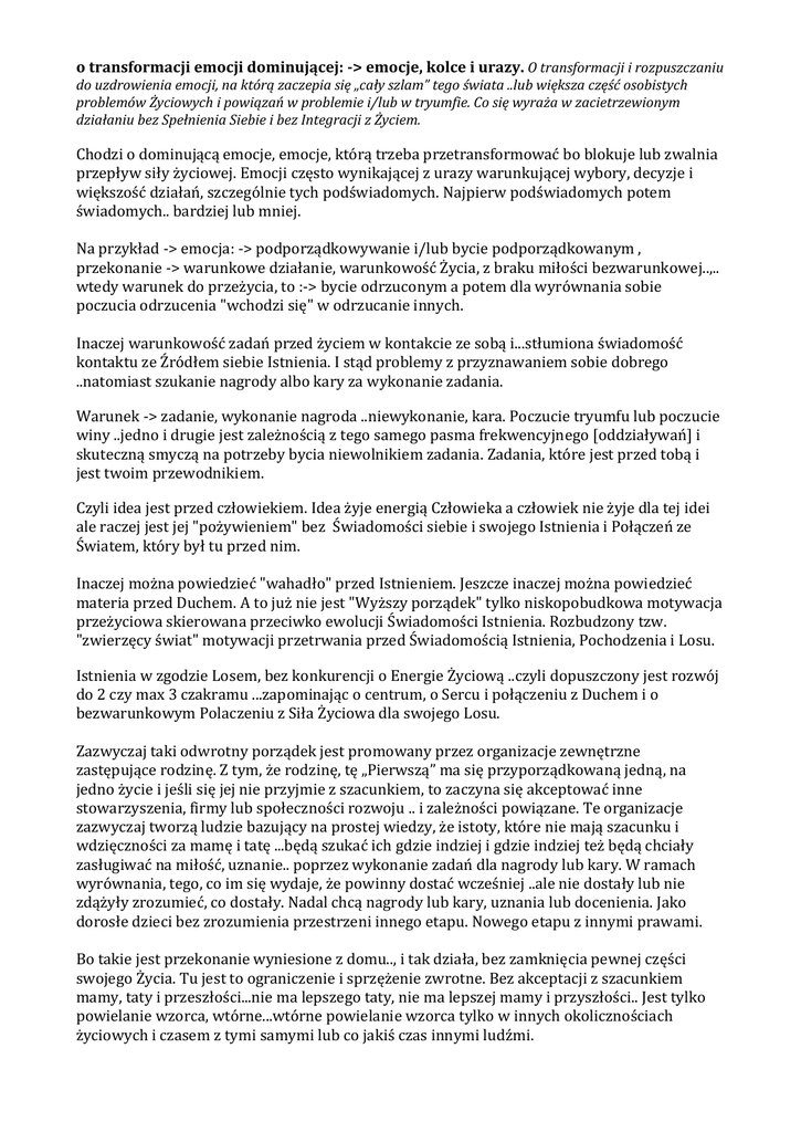 o transformacji emocji dominującej: -> emocje, kolce i urazy. O transformacji i rozpuszczaniu do uzdrowienia emocji, na którą zaczepia się „cały szlam” tego świata ..lub większa część osobistych problemów Życiowych i powiązań w problemie i/lub w tryumfie. Co się wyraża w zacietrzewionym działaniu bez Spełnienia Siebie i bez Integracji z Życiem. Chodzi o dominującą emocje, emocje, którą trzeba przetransformować bo blokuje lub zwalnia przepływ siły życiowej. Emocji często wynikającej z urazy warunkującej wybory, decyzje i większość działań, szczególnie tych podświadomych. Najpierw podświadomych potem świadomych.. bardziej lub mniej. Na przykład -> emocja: -> podporządkowywanie i/lub bycie podporządkowanym , przekonanie -> warunkowe działanie, warunkowość Życia, z braku miłości bezwarunkowej..,.. wtedy warunek do przeżycia, to :-> bycie odrzuconym a potem dla wyrównania sobie poczucia odrzucenia "wchodzi się" w odrzucanie innych. Inaczej warunkowość zadań przed życiem w kontakcie ze sobą i...stłumiona świadomość kontaktu ze Źródłem siebie Istnienia. I stąd problemy z przyznawaniem sobie dobrego ..natomiast szukanie nagrody albo kary za wykonanie zadania. Warunek -> zadanie, wykonanie nagroda ..niewykonanie, kara. Poczucie tryumfu lub poczucie winy ..jedno i drugie jest zależnością z tego samego pasma frekwencyjnego [oddziaływań] i skuteczną smyczą na potrzeby bycia niewolnikiem zadania. Zadania, które jest przed tobą i jest twoim przewodnikiem. Czyli idea jest przed człowiekiem. Idea żyje energią Człowieka a człowiek nie żyje dla tej idei ale raczej jest jej "pożywieniem" bez Świadomości siebie i swojego Istnienia i Połączeń ze Światem, który był tu przed nim. Inaczej można powiedzieć "wahadło" przed Istnieniem. Jeszcze inaczej można powiedzieć materia przed Duchem. A to już nie jest "Wyższy porządek" tylko niskopobudkowa motywacja przeżyciowa skierowana przeciwko ewolucji Świadomości Istnienia. Rozbudzony tzw. "zwierzęcy świat" motywacji przetrwania przed Świadomością Istnienia, Pochodzenia i Losu. Istnienia w zgodzie Losem, bez konkurencji o Energie Życiową ..czyli dopuszczony jest rozwój do 2 czy max 3 czakramu ...zapominając o centrum, o Sercu i połączeniu z Duchem i o bezwarunkowym Polaczeniu z Siła Życiowa dla swojego Losu. Zazwyczaj taki odwrotny porządek jest promowany przez organizacje zewnętrzne zastępujące rodzinę. Z tym, że rodzinę, tę „Pierwszą” ma się przyporządkowaną jedną, na jedno życie i jeśli się jej nie przyjmie z szacunkiem, to zaczyna się akceptować inne stowarzyszenia, firmy lub społeczności rozwoju .. i zależności powiązane. Te organizacje zazwyczaj tworzą ludzie bazujący na prostej wiedzy, że istoty, które nie mają szacunku i wdzięczności za mamę i tatę ...będą szukać ich gdzie indziej i gdzie indziej też będą chciały zasługiwać na miłość, uznanie.. poprzez wykonanie zadań dla nagrody lub kary. W ramach wyrównania, tego, co im się wydaje, że powinny dostać wcześniej ..ale nie dostały lub nie zdążyły zrozumieć, co dostały. Nadal chcą nagrody lub kary, uznania lub docenienia. Jako dorosłe dzieci bez zrozumienia przestrzeni innego etapu. Nowego etapu z innymi prawami. Bo takie jest przekonanie wyniesione z domu.., i tak działa, bez zamknięcia pewnej części swojego Życia. Tu jest to ograniczenie i sprzężenie zwrotne. Bez akceptacji z szacunkiem mamy, taty i przeszłości...nie ma lepszego taty, nie ma lepszej mamy i przyszłości.. Jest tylko powielanie wzorca, wtórne...wtórne powielanie wzorca tylko w innych okolicznościach życiowych i czasem z tymi samymi lub co jakiś czas innymi ludźmi. Bez wyjścia z dzieciństwa nie ma wyjścia z dzieciństwa. Jest się dorosłym dzieckiem szukającym swojej mamy i taty w ludziach, którzy są zewnątrz. Ci natomiast z zewnątrz, wyłapywacze głów są bardzo świadomi, ze takich ludzi z zapisanym cierpieniem podprogowym jest więcej niż można zobaczyć naraz. I jest to piękna dla nich siła robocza, napędowa dla ich organizacji lub wahadła organizacyjnego, stowarzyszenia, firmy czy „sekty* niebanalnej” lub banalnej. Poplecznik za nagrodę docenienia siebie jako dziecko zrobi wszystko co mu się wydaje, że może i co będzie logicznie uzasadnione. A logika uzasadnień ostatnio szczególnie jest baardzo rozprzestrzeniona ..gdzie handel swoim ciałem i zdrowiem ale w słusznej sprawie jest właściwie narmatywnym standardem biznesowym lub targowym.. Nawet robi się warsztaty typu "ciało i seks", jako narzędzia osiągania celu lub "nagrody" itd. Programowanie wzorcami zachowań typu narzędziowego jest promowane, jako skuteczne i inteligentne. !? Tak, czy inaczej nie odbiegając od tematu...,... Świadomość siebie jest wszystkim co mamy...jeśli autorytet świadomości siebie oddajemy ludziom z zewnątrz, nie widząc siebie i swojej rodziny, jako tej właściwej i na pierwszym miejscu, to zaczyna się wtedy proces rozpadu i braku tożsamości. tzw. choroba tożsamości, choroba braku swojej przestrzeni, swojego myślenia i postrzegania. Choroba tożsamości jest wprogramowana w barierę rozwoju jakim jest program Ego i zbiorowej świadomości jakim wydaje się być świat, szczególnie promowany przez media i zewnętrzne autorytety z mapy wyobrażeniowej wstawianej już od przedszkola.....wiec dobrze jest mieć świadomość jego istnienia. Od tego zaczyna się stawianie pierwszego kroku i potem jest zmiana widzenia tego, co jest „oczywistą oczywistością” ..i zaczyna się rozpoznawać to, co jest Prawdą a co jest manipulacją logicznie i skrzętnie wprowadzona dla zewnętrznych celów ..a nie dla osobistego rozwoju Siebie. Natomiast jeśli to się zaczyna rozpoznawać i powoli pragnienie wejścia do swojego świata z powrotem staje się dobrą ideą. Staje się świeżym powiewem wolności, to organizacje czy to korporacyjne