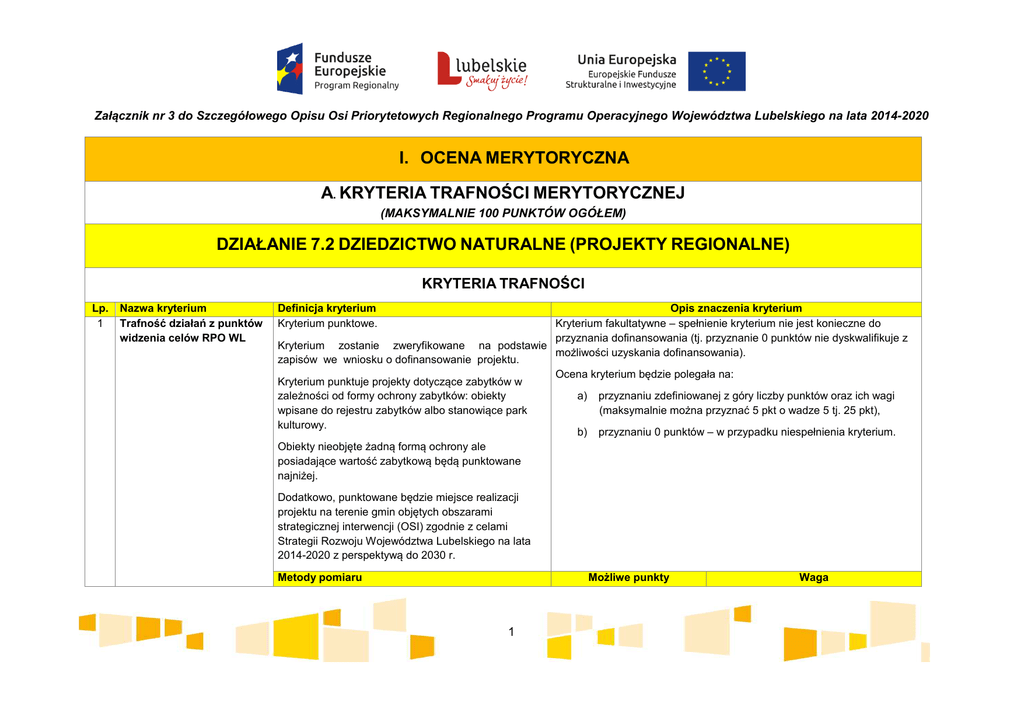Załącznik nr 3 do Szczegółowego Opisu Osi Priorytetowych Regionalnego Programu Operacyjnego Województwa Lubelskiego na lata 2014-2020 I. OCENA MERYTORYCZNA A. KRYTERIA TRAFNOŚCI MERYTORYCZNEJ (MAKSYMALNIE 100 PUNKTÓW OGÓŁEM) DZIAŁANIE 7.2 DZIEDZICTWO NATURALNE (PROJEKTY REGIONALNE) KRYTERIA TRAFNOŚCI Lp. 1 Nazwa kryterium Trafność działań z punktów widzenia celów RPO WL Definicja kryterium Kryterium punktowe. Opis znaczenia kryterium Kryterium fakultatywne – spełnienie kryterium nie jest konieczne do przyznania dofinansowania (tj. przyznanie 0 punktów nie dyskwalifikuje z Kryterium zostanie zweryfikowane na podstawie możliwości uzyskania dofinansowania). zapisów we wniosku o dofinansowanie projektu. Ocena kryterium będzie polegała na: Kryterium punktuje projekty dotyczące zabytków w zależności od formy ochrony zabytków: obiekty a) przyznaniu zdefiniowanej z góry liczby punktów oraz ich wagi wpisane do rejestru zabytków albo stanowiące park (maksymalnie można przyznać 5 pkt o wadze 5 tj. 25 pkt), kulturowy. b) przyznaniu 0 punktów – w przypadku niespełnienia kryterium. Obiekty nieobjęte żadną formą ochrony ale posiadające wartość zabytkową będą punktowane najniżej. Dodatkowo, punktowane będzie miejsce realizacji projektu na terenie gmin objętych obszarami strategicznej interwencji (OSI) zgodnie z celami Strategii Rozwoju Województwa Lubelskiego na lata 2014-2020 z perspektywą do 2030 r. Metody pomiaru Możliwe punkty 1 Waga Lp. 1 Nazwa kryterium Efektywność kosztowa wsparcia 1 obiektu w miejscach dziedzictwa naturalnego Projektem objęte są obiekty wpisane do rejestru 3 5 zabytków albo stanowiące park kulturowy Projekt realizowany na obszarze strategicznej 2 interwencji (OSI) nr 4: gospodarczego wykorzystania walorów przyrodniczych i kulturowych Projekt jest realizowany na terenie zdegradowanym i 2 obejmuje inwestycje niezbędne do kompleksowej rewitalizacji danego obszaru zgodnie z pkt A.1 części IV SzOOP RPO WL Projekt realizowany w miejscowościach na terenach 2 gmin wiejskich i miejsko-wiejskich Projektem objęte są obiekty nie objęte żadną formą 1 ochrony, ale posiadające wartość zabytkową KRYTERIA SKUTECZNOŚCI / EFEKTYWNOŚCI Definicja kryterium Opis znaczenia kryterium Kryterium punktowe. Kryterium fakultatywne – spełnienie kryterium nie jest konieczne do przyznania dofinansowania (tj. przyznanie 0 punktów nie dyskwalifikuje z Kryterium zostanie zweryfikowane na podstawie możliwości uzyskania dofinansowania). zapisów we wniosku o dofinansowanie projektu. Ocena kryterium będzie polegała na: Kryterium ocenia średni umowny koszt jednostkowy uzyskania 1 jednostki wskaźnika produktu w projekcie a) wyliczeniu dla projektu wartości umownego kosztu jednostkowego w porównaniu z analogicznym kosztem jednostkowym dla danego wskaźnika poprzez podzielenie dofinansowania z EFRR zaplanowanym w Programie. Umowny koszt dla projektu przez poziom wskaźnika produktu osiąganego w jednostkowy wykorzystany do wyliczenia wartości projekcie (i zaokrąglenia do pełnych złotych), a następnie wskaźnika w Programie wyniósł 3345338 zł/szt. i sprawdzeniu, w którym przedziale mieści się wyliczony wskaźnik i będzie on stanowił punkt odniesienia podczas oceny przyznaniu odpowiedniej liczby punktów, projektów tym kryterium. b) przemożeniu przyznanej liczby punktów przez wagę, c) Metody pomiaru Efektywność kosztowa na poziomie poniżej 75% średniego kosztu (do 2509003 zł/szt. włącznie) Efektywność kosztowa na poziomie wyższym lub 2 przyznaniu 0 punktów - kiedy projekt nie realizuje danego wskaźnika. Możliwe punkty 5 4 Waga 5 Lp. 1 Nazwa kryterium Wpływ na realizację działań przyczyniających się do trwałego osiągania celów RPO WL równym 75% i niższym niż 100% średniego kosztu (od 2509004 do 3345337 zł/szt. włącznie) Efektywność kosztowa na poziomie wyższym lub 2 równym 100% i niższym niż 125% średniego kosztu (od 3345338 do 4181672 zł/szt. włącznie) Efektywność kosztowa na poziomie wyższym lub 0 równym 125% średniego kosztu (4181673 zł/szt. i więcej) KRYTERIA UŻYTECZNOŚCI Definicja kryterium Opis znaczenia kryterium Kryterium punktowe. Kryterium fakultatywne – spełnienie kryterium nie jest konieczne do przyznania dofinansowania (tj. przyznanie 0 punktów nie dyskwalifikuje z Kryterium zostanie zweryfikowane na podstawie możliwości uzyskania dofinansowania). zapisów we wniosku o dofinansowanie projektu. Ocena kryterium będzie polegała na: Kryterium punktuje projekty realizujące działania kluczowe z punktu widzenia celów RPO WL. a) przyznaniu zdefiniowanej z góry liczby punktów oraz ich wagi za Premiowane są działania dotyczące zachowania każde z zastosowanych w projekcie rozwiązań (przy czym dziedzictwa naturalnego i zrównoważone jego maksymalnie można przyznać 5 pkt o wadze 5 tj. 25 pkt), wykorzystanie, a także dzięki temu zwiększenie b) przyznaniu 0 punktów – w przypadku niespełnienia kryterium. atrakcyjności kulturowej i turystycznej regionu. Metody pomiaru Projekt dotyczy ochrony i zachowania zabytkowych ogrodów i parków Projekt dotyczy tworzenia geoparków, parków krajobrazowych, centrów ochrony bioróżnorodności, parków botanicznych, arboretów, ostoi zwierząt, mini zoo, wolier i innych form prezentacji przyrody także na terenach miejskich i wiejskich Projekt dotyczy infrastruktury ułatwiającej dostęp do miejsc i obszarów atrakcyjnych turystycznie i/lub infrastruktury zlokalizowanej wokół istniejących zbiorników wodnych (kąpieliska, plaże, pomosty, mola, przystanie wodne, bulwary, promenady) itp. Projekt dotyczy zwiększenia zieleni w miastach (w tym 3 Możliwe punkty 3 2 3 2 Waga 5 Lp. 2 parków, zieleńców i terenów zieleni osiedlowej) w ramach rekultywacji terenów zdegradowanych działalnością człowieka Projekt tworzy przynajmniej jedno miejsce pracy netto (ponad istniejący stan przed realizacją proj