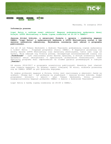 Warszawa, 31 sierpnia 2016 Informacja prasowa Liga+ Extra w