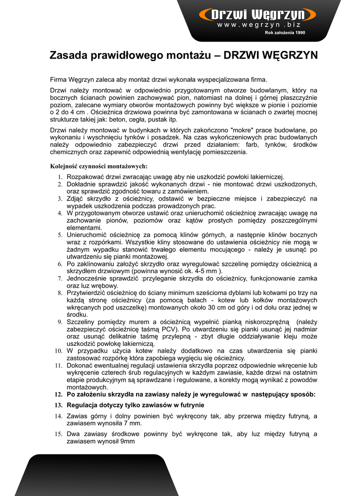 Zasada prawidłowego montażu – DRZWI WĘGRZYN Firma Węgrzyn zaleca aby montaż drzwi wykonała wyspecjalizowana firma. Drzwi należy montować w odpowiednio przygotowanym otworze budowlanym, który na bocznych ścianach powinien zachowywać pion, natomiast na dolnej i górnej płaszczyźnie poziom, zalecane wymiary otworów montażowych powinny być większe w pionie i poziomie o 2 do 4 cm . Ościeżnica drzwiowa powinna być zamontowana w ścianach o zwartej mocnej strukturze takiej jak: beton, cegła, pustak itp. Drzwi należy montować w budynkach w których zakończono "mokre" prace budowlane, po wykonaniu i wyschnięciu tynków i posadzek. Na czas wykończeniowych prac budowlanych należy odpowiednio zabezpieczyć drzwi przed działaniem: farb, tynków, środków chemicznych oraz zapewnić odpowiednią wentylację pomieszczenia. Kolejność czynności montażowych: 1. Rozpakować drzwi zwracając uwagę aby nie uszkodzić powłoki lakierniczej. 2. Dokładnie sprawdzić jakość wykonanych drzwi - nie montować drzwi uszkodzonych, oraz sprawdzić zgodność towaru z zamówieniem. 3. Zdjąć skrzydło z ościeżnicy, odstawić w bezpieczne miejsce i zabezpieczyć na wypadek uszkodzenia podczas prowadzonych prac. 4. W przygotowanym otworze ustawić oraz unieruchomić ościeżnicę zwracając uwagę na zachowanie pionów, poziomów oraz kątów prostych pomiędzy poszczególnymi elementami. 5. Unieruchomić ościeżnicę za pomocą klinów górnych, a następnie klinów bocznych wraz z rozpórkami. Wszystkie kliny stosowane do ustawienia ościeżnicy nie mogą w żadnym wypadku stanowić trwałego elementu mocującego - należy je usunąć po utwardzeniu się pianki montażowej. 6. Po zaklinowaniu założyć skrzydło oraz wyregulować szczelinę pomiędzy ościeżnicą a skrzydłem drzwiowym (powinna wynosić ok. 4-5 mm ). 7. Jednocześnie sprawdzić :przyleganie skrzydła do ościeżnicy, funkcjonowanie zamka oraz luz wrębowy. 8. Przytwierdzić ościeżnicę do ściany minimum sześcioma dyblami lub kotwami po trzy na każdą stronę ościeżnicy (za pomocą balach - kotew lub kołków montażowych wkręcanych pod uszczelkę) montowanych około 30 cm od góry i od dołu oraz jednej w środku. 9. Szczeliny pomiędzy murem a ościeżnicą wypełnić pianką niskorozprężną (należy zabezpieczyć ościeżnicę taśmą PCV). Po utwardzeniu się pianki usunąć jej nadmiar oraz usunąć delikatnie taśmę przylepną - zbyt długie oddziaływanie kleju może uszkodzić powłokę lakierniczą. 10. W przypadku użycia kotew należy dodatkowo na czas utwardzenia się pianki zastosować rozpórkę która zapobiega wygięciu się ościeżnicy. 11. Dokonać ewentualnej regulacji ustawienia skrzydła poprzez odpowiednie wkręcenie lub wykręcenie czterech śrub regulacyjnych w każdym zawiasie, każde drzwi na ostatnim etapie produkcyjnym są sprawdzane i regulowane, a korekty mogą wynikać z powodów montażowych. 12. Po założeniu skrzydła na zawiasy należy je wyregulować w następujący sposób: 13. Regulacja dotyczy tylko zawiasów w futrynie 14. Zawias górny i dolny powinien być wykręcony tak, aby przerwa między futryną, a zawiasem wynosiła 7 mm. 15. Dwa zawiasy środkowe powinny być wykręcone tak, aby luz między futryną a zawiasem wynosił 9mm