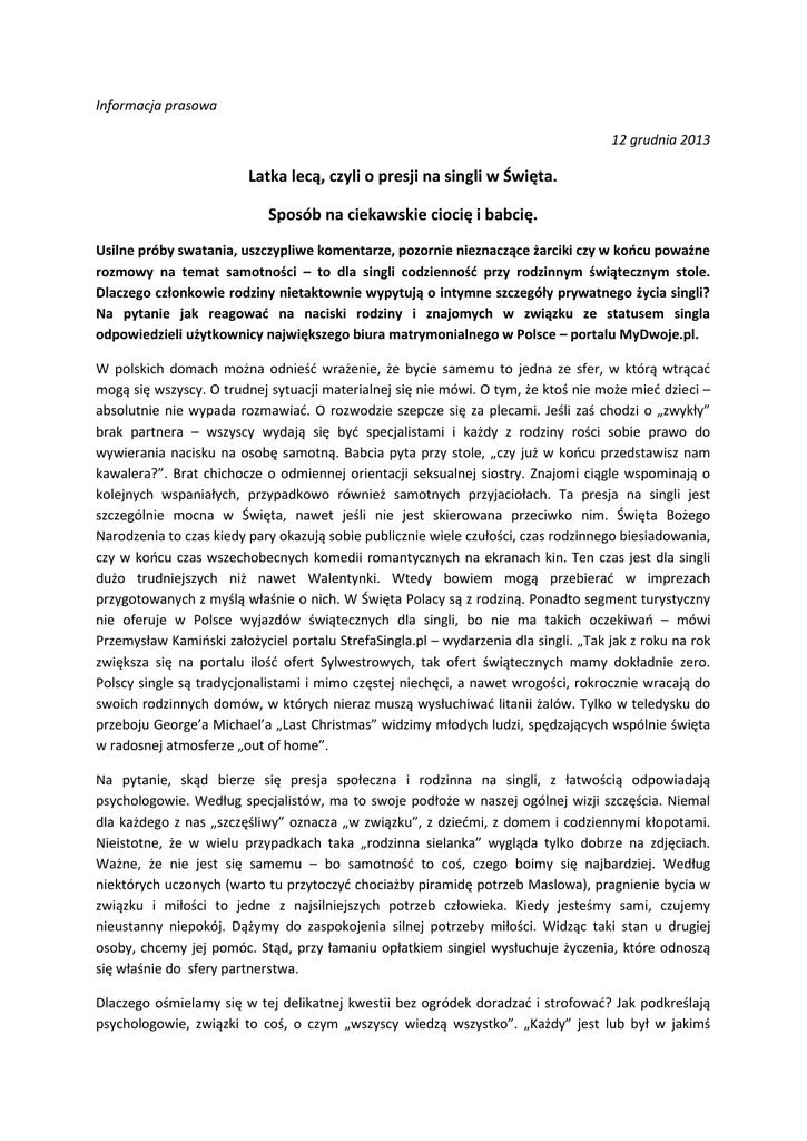 Informacja prasowa 12 grudnia 2013 Latka lecą, czyli o presji na singli w Święta. Sposób na ciekawskie ciocię i babcię. Usilne próby swatania, uszczypliwe komentarze, pozornie nieznaczące żarciki czy w końcu poważne rozmowy na temat samotności – to dla singli codzienność przy rodzinnym świątecznym stole. Dlaczego członkowie rodziny nietaktownie wypytują o intymne szczegóły prywatnego życia singli? Na pytanie jak reagować na naciski rodziny i znajomych w związku ze statusem singla odpowiedzieli użytkownicy największego biura matrymonialnego w Polsce – portalu MyDwoje.pl. W polskich domach można odnieść wrażenie, że bycie samemu to jedna ze sfer, w którą wtrącać mogą się wszyscy. O trudnej sytuacji materialnej się nie mówi. O tym, że ktoś nie może mieć dzieci – absolutnie nie wypada rozmawiać. O rozwodzie szepcze się za plecami. Jeśli zaś chodzi o „zwykły” brak partnera – wszyscy wydają się być specjalistami i każdy z rodziny rości sobie prawo do wywierania nacisku na osobę samotną. Babcia pyta przy stole, „czy już w końcu przedstawisz nam kawalera?”. Brat chichocze o odmiennej orientacji seksualnej siostry. Znajomi ciągle wspominają o kolejnych wspaniałych, przypadkowo również samotnych przyjaciołach. Ta presja na singli jest szczególnie mocna w Święta, nawet jeśli nie jest skierowana przeciwko nim. Święta Bożego Narodzenia to czas kiedy pary okazują sobie publicznie wiele czułości, czas rodzinnego biesiadowania, czy w końcu czas wszechobecnych komedii romantycznych na ekranach kin. Ten czas jest dla singli dużo trudniejszych niż nawet Walentynki. Wtedy bowiem mogą przebierać w imprezach przygotowanych z myślą właśnie o nich. W Święta Polacy są z rodziną. Ponadto segment turystyczny nie oferuje w Polsce wyjazdów świątecznych dla singli, bo nie ma takich oczekiwań – mówi Przemysław Kamiński założyciel portalu StrefaSingla.pl – wydarzenia dla singli. „Tak jak z roku na rok zwiększa się na portalu ilość ofert Sylwestrowych, tak ofert świątecznych mamy dokładnie zero. Polscy single są tradycjonalistami i mimo częstej niechęci, a nawet wrogości, rokrocznie wracają do swoich rodzinnych domów, w których nieraz muszą wysłuchiwać litanii żalów. Tylko w teledysku do przeboju George’a Michael’a „Last Christmas” widzimy młodych ludzi, spędzających wspólnie święta w radosnej atmosferze „out of home”. Na pytanie, skąd bierze się presja społeczna i rodzinna na singli, z łatwością odpowiadają psychologowie. Według specjalistów, ma to swoje podłoże w naszej ogólnej wizji szczęścia. Niemal dla każdego z nas „szczęśliwy” oznacza „w związku”, z dziećmi, z domem i codziennymi kłopotami. Nieistotne, że w wielu przypadkach taka „rodzinna sielanka” wygląda tylko dobrze na zdjęciach. Ważne, że nie jest się samemu – bo samotność to coś, czego boimy się najbardziej. Według niektórych uczonych (warto tu przytoczyć chociażby piramidę potrzeb Maslowa), pragnienie bycia w związku i miłości to jedne z najsilniejszych potrzeb człowieka. Kiedy jesteśmy sami, czujemy nieustanny niepokój. Dążymy do zaspokojenia silnej potrzeby miłości. Widząc taki stan u drugiej osoby, chcemy jej pomóc. Stąd, przy łamaniu opłatkiem singiel wysłuchuje życzenia, które odnoszą się właśnie do sfery partnerstwa. Dlaczego ośmielamy się w tej delikatnej kwestii bez ogródek doradzać i strofować? Jak podkreślają psychologowie, związki to coś, o czym „wszyscy wiedzą wszystko”. „Każdy” jest lub był w jakimś związku, więc zasada zawierania znajomości wydaje się dziecinnie prosta. W przypadku, gdy ktoś zmaga się z dość skomplikowanym problemem np. niepłodności, doradcy cichną. Brak wiedzy na ten temat nie pozwala im na zabieranie głosu. A związki? Banalne, proste związki? Przecież wystarczy tylko kogoś poznać, uśmiechnąć się i… już. Sposób na Babcię i Ciocię, czyli jak radzić sobie z presją rodziny na singli? Zdanie singli i psychologów. Świąteczną presję rodziny i znajomych na znalezienie kogoś odczuwają najmocniej kobiety. Aż 30% kobiet, które wzięły udział w sondzie w biurze matrymonialnym MyDwoje odczuwa tę presję bardzo mocno i jest ona czymś co bardzo im przeszkadza. Może wynikać to z faktu, że właśnie wobec samotnych kobiet ta presja jest wyjątkowo silna. Obecnie tylko 24% panów boleśnie odczuwa świąteczną presję rodziny. Co prawda określenie „stara panna” praktycznie już wyszło z języka, ale sądząc po wynikach sondy MyDwoje.pl to właśnie paniom bardziej daje się odczuć, że bycie samotną nie jest czymś pozytywnym wg otoczenia. 25% pań i 29% panów presja przeszkadza tylko trochę, ale stykają się z tym zjawiskiem. Na szczęście, prawie połowa bo 45% samotnych jest w temacie związków zostawiona w spokoju i problemu nie odczuwa w ogóle. MyDwoje.pl zapytało także singli o skuteczne sposoby radzenia sobie z naciskami. Panowie wydają się tu bardziej cierpliwi, a panie bardziej zdystansowane. Na spokojnie sytuację wytłumaczy tylko 14% pań lecz aż 21% panów. Żartem odpowie 42% pań i 34% panów. Pozostałe sposoby radzenia sobie z presją bliskich mają wyrównane proporcje – 27% zarówno pań i panów uważa, że najlepiej docinki, komentarze i swatanie po prostu ignorować. Mocno i stanowczo przeciwko poruszaniu tego tematu protestuje 13% pań i panów. Tylko 2% panów uważa, że warto w takiej sytuacji zacząć spotykać się z kimkolwiek. Ani jednej kobiecie w badaniu nie odpowiada taki życiowy „kompromis”. Za to aż 3% pań i panów dla świętego spokoju skłamie, że z kimś się spotyka. Psychologowie także radzą obrócić sprawę w żart lub na spokojnie wytłumaczyć dlaczego jesteśmy sami. Najgorszym możliwym rozwiązaniem jest spotykać się z kimkolwiek – byle „nie gadali”. I nawet, jeśli zwi