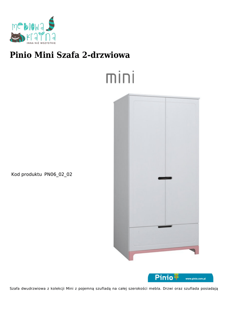 Pinio Mini Szafa 2-drzwiowa Kod produktu PN06_02_02 Szafa dwudrzwiowa z kolekcji Mini z pojemną szufladą na całej szerokości mebla. Drzwi oraz szuflada posiadają wysokiej jakości prowadnice i zawiasy z hamulcami i samodomykiem. Blat i fronty szafy wykonane są z litego drewna sosnowego pochodzącego z polskich lasów. Boki oraz elementy wewnętrzne z płyty laminowanej. Elementy wykończeniowe - uchwyty i nóżki - występują w kolorze szarym i różowym. Wewnątrz znajdują się dwie półki oraz drążek na ubrania. Czas oczekiwania: 4-6 tygodni. Wymiary: 99 cm x 53,3 cm x 184 cm (długość x szerokość x wysokość) Konstrukcja: front i blat-lite drewno sosnowe, boki i elementy wewnętrzne - płyta laminowana. Kolorystyka: biały+szary, biały+różowy. Gwarancja: 24 miesiące. Mebel do samodzielnego montażu.