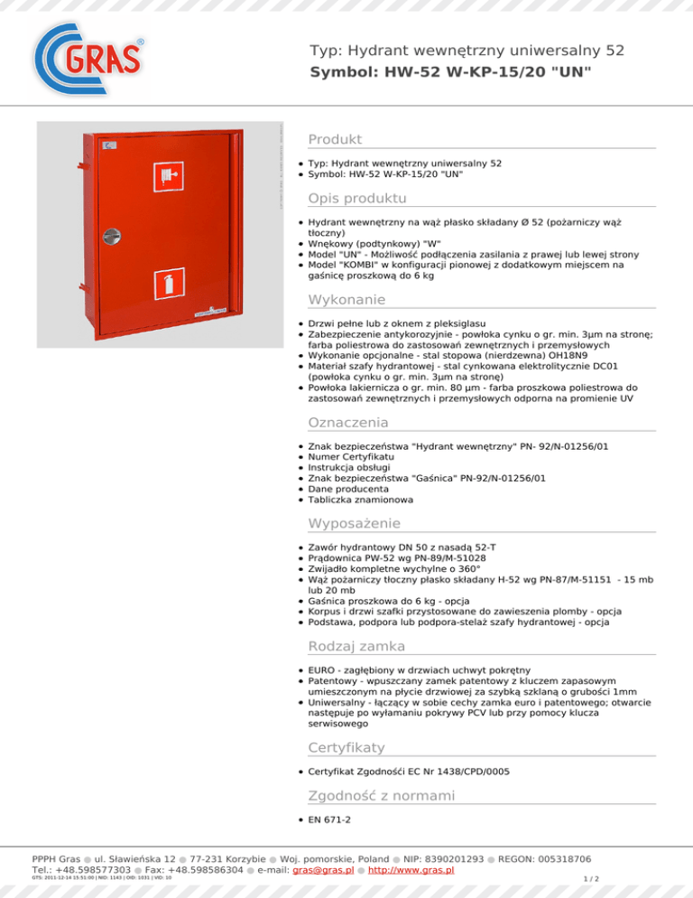Typ: Hydrant wewnętrzny uniwersalny 52 Symbol: HW-52 W-KP-15/20 "UN" Produkt Typ: Hydrant wewnętrzny uniwersalny 52 Symbol: HW-52 W-KP-15/20 "UN" Opis produktu Hydrant wewnętrzny na wąż płasko składany Ø 52 (pożarniczy wąż tłoczny) Wnękowy (podtynkowy) "W" Model "UN" - Możliwość podłączenia zasilania z prawej lub lewej strony Model "KOMBI" w konfiguracji pionowej z dodatkowym miejscem na gaśnicę proszkową do 6 kg Wykonanie Drzwi pełne lub z oknem z pleksiglasu Zabezpieczenie antykorozyjnie - powłoka cynku o gr. min. 3μm na stronę; farba poliestrowa do zastosowań zewnętrznych i przemysłowych Wykonanie opcjonalne - stal stopowa (nierdzewna) OH18N9 Materiał szafy hydrantowej - stal cynkowana elektrolitycznie DC01 (powłoka cynku o gr. min. 3μm na stronę) Powłoka lakiernicza o gr. min. 80 μm - farba proszkowa poliestrowa do zastosowań zewnętrznych i przemysłowych odporna na promienie UV Oznaczenia Znak bezpieczeństwa "Hydrant wewnętrzny" PN- 92/N-01256/01 Numer Certyfikatu Instrukcja obsługi Znak bezpieczeństwa "Gaśnica" PN-92/N-01256/01 Dane producenta Tabliczka znamionowa Wyposażenie Zawór hydrantowy DN 50 z nasadą 52-T Prądownica PW-52 wg PN-89/M-51028 Zwijadło kompletne wychylne o 360° Wąż pożarniczy tłoczny płasko składany H-52 wg PN-87/M-51151 - 15 mb lub 20 mb Gaśnica proszkowa do 6 kg - opcja Korpus i drzwi szafki przystosowane do zawieszenia plomby - opcja Podstawa, podpora lub podpora-stelaż szafy hydrantowej - opcja Rodzaj zamka EURO - zagłębiony w drzwiach uchwyt pokrętny Patentowy - wpuszczany zamek patentowy z kluczem zapasowym umieszczonym na płycie drzwiowej za szybką szklaną o grubości 1mm Uniwersalny - łączący w sobie cechy zamka euro i patentowego; otwarcie następuje po wyłamaniu pokrywy PCV lub przy pomocy klucza serwisowego Certyfikaty Certyfikat Zgodnośći EC Nr 1438/CPD/0005 Zgodność z normami EN 671-2 PPPH Gras ● ul. Sławieńska 12 ● 77-231 Korzybie ● Woj. pomorskie, Poland ● NIP: 8390201293 ● REGON: 005318706 Tel.: +48.598577303 ● Fax: +48.598586304 ● e-mail: [email protected] ● http://www.gras.pl GTS: 2011-12-14 15:51:00 | NID: 1143 | OID: 1031 | VID: 10 1/2 Typ: Hydrant wewnętrzny uniwersalny 52 Symbol: HW-52 W-KP-15/20 "UN" Kolor RAL3000 (czerwony) - farba poliestrowa odporna na promienie UV. standard RAL9010 (biały) - farba poliestrowa odporna na promienie UV. - standard Inny - dostępne wszystkie kolory z palety RAL oraz kolory specjalne. opcja Kolory zwijadła RAL 3000 (czerwony) wg EN 671-2 Gaśnica Gaśnica proszkowa GP-4xABC Gaśnica proszkowa GP-6xABC Wydajność Q Nom = 150l/min przy: P ≥ 0.2 MPa - WSP K = 110 dysza prądownicy Ø13 mm P ≥ 0.4 MPa - WSP K = 83 dysza prądownicy Ø12 mm P ≥ 0.6 MPa - WSP K = 49 dysza prądownicy Ø9 mm Ciśnienie pracy Minimalne: 0.2 MPa Maksymalne: 0.7 MPa Wymiary gabarytowe Szerokość Wysokość Głębokość 560 mm 800 mm 180 mm Informacje dodatkowe Zgodnie z wymogami rynkowymi i prawnymi, producent P.P.P.H. GRAS zastrzega sobie prawo do wprowadzania w dowolnej chwili zmian konstrukcyjnych w oferowanych szafach hydrantowych, nie zmieniając ich ogólnego characteru. Prezentowana w katalogu oferta nie stanowi oferty w rozumieniu Kodeksu Cywilnego. Ze w względu na ograniczenia wynikające z techniki druku, kolory reprodukowane w dokumencie mogą się różnić od rzeczywistych kolorów oferowanych produktów. Źródło: http://www.gras.pl/gpl/pl/Hydranty/Hydranty-DN52/Uniwersalne/Hydrant-wewnetrzny-uniwersalny-52-HW-52-W-KP-15-20-UN Sygnatura: GTS: 2011-12-14 15:51:00 | NID: 1143 | OID: 1031 | VID: 10 PPPH Gras ● ul. Sławieńska 12 ● 77-231 Korzybie ● Woj. pomorskie, Poland ● NIP: 8390201293 ● REGON: 005318706 Tel.: +48.598577303 ● Fax: +48.598586304 ● e-mail: [email protected] ● http://www.gras.pl GTS: 2011-12-14 15:51:00 | NID: 1143 | OID: 1031 | VID: 10 2/2