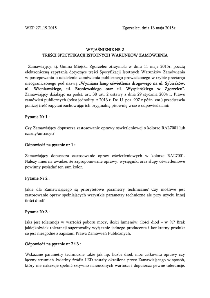 WZP.271.19.2015 Zgorzelec, dnia 13 maja 2015r. WYJAŚNIENIE NR 2 TREŚCI SPECYFIKACJI ISTOTNYCH WARUNKÓW ZAMÓWIENIA Zamawiający, tj. Gmina Miejska Zgorzelec otrzymała w dniu 11 maja 2015r. pocztą elektroniczną zapytania dotyczące treści Specyfikacji Istotnych Warunków Zamówienia w postępowaniu o udzielenie zamówienia publicznego prowadzonego w trybie przetargu nieograniczonego pod nazwą „Wymiana lamp oświetlenia drogowego na ul. Sybiraków, ul. Wieniawskiego, ul. Broniewskiego oraz ul. Wyspiańskiego w Zgorzelcu”. Zamawiający działając na podst. art. 38 ust. 2 ustawy z dnia 29 stycznia 2004 r. Prawo zamówień publicznych (tekst jednolity z 2013 r. Dz. U. poz. 907 z późn. zm.) przedstawia poniżej treść zapytań zachowując ich oryginalną pisownię wraz z odpowiedziami: Pytanie Nr 1 : Czy Zamawiający dopuszcza zastosowanie oprawy oświetleniowej o kolorze RAL7001 lub czarny/antracyt? Odpowiedź na pytanie nr 1 : Zamawiający dopuszcza zastosowanie opraw oświetleniowych w kolorze RAL7001. Należy mieć na uwadze, że zaproponowane oprawy, wysięgniki oraz słupy oświetleniowe powinny posiadać ten sam kolor. Pytanie Nr 2 : Jakie dla Zamawiającego są priorytetowe parametry techniczne? Czy możliwe jest zastosowanie opraw spełniających wszystkie parametry techniczne ale przy użyciu innej ilości diod? Pytanie Nr 3 : Jaka jest tolerancja w wartości poboru mocy, ilości lumenów, ilości diod – w %? Brak jakiejkolwiek tolerancji sugerowałby wyłącznie jednego producenta i konkretny produkt co jest niezgodne z zapisami Prawa Zamówień Publicznych. Odpowiedź na pytanie nr 2 i 3 : Wskazane parametry techniczne takie jak np. liczba diod, moc całkowita oprawy czy łączny strumień świetlny źródła LED zostały określone przez Zamawiającego w sposób, który nie nakazuje spełnić sztywno narzuconych wartości i dopuszcza pewne tolerancje. Określono wartości maksymalne i minimalne, które dany produkt musi spełniać. Jeżeli Wykonawca dysponuje produktem, który przy mniejszej mocy i ilości diod zapewnia określony minimalny strumień świetlny (lub większy) i jednocześnie jego dane fotometryczne odpowiadają określonym przez Zamawiającego, to taki produkt zostanie przyjęty jako zgodny z wymaganiami Inwestora. Pytanie Nr 4 : Czy Zamawiający dopuszcza przedstawienie innego poświadczenia niż Certyfikatu ENEC, potwierdzającego spełnianie przez produkt zapisów norm wymaganych przy znakowaniu CE (LVD, MD) – certyfikat ENEC jest wyłącznie potwierdzeniem zgodności z normami LVD, MD?. Posiadanie Certyfikatu ENEC nie jest obowiązkowe na terenie Unii Europejskiej, jest to wyłącznie dobrowolny i dodatkowy Certyfikat. Zgodnie z zapisami prawa ważne i obowiązujące są również inne potwierdzenia /certyfikaty wydane przez inne Jednostki Badawcze działające na terenie Unii Europejskiej. Rozumiemy, iż Zamawiający zaakceptuje certyfikat jednej z największych i najlepszych Jednostek Certyfikujących w Niemczech TUV Rheinland? Posiadanie ww. Certyfikatu jest jednym z najlepszych potwierdzeń wysokiego standardu oraz jakości oferowanych produktów. Natomiast, akceptacja przez Zamawiającego wyłącznie jednego Certyfikatu (tym bardziej nie obowiązkowego) stanowi zaprzeczenie zapisów PZP dotyczących równego traktowania i zasady zachowania uczciwej konkurencji, a tym samym jest niezgodne z zapisami Prawa Zamówień Publicznych. Odpowiedź na pytanie nr 4 : Zamawiający dopuszcza oprawy oświetleniowe posiadające certyfikat TUV Rheinland. Z up. Burmistrza Miasta Piotr Konwiński /Zastępca Burmistrza/