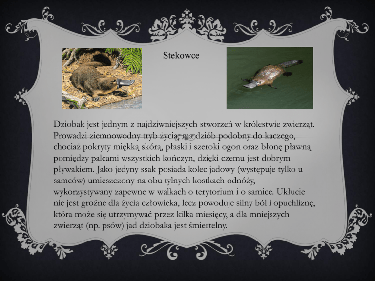 Stekowce Dziobak jest jednym z najdziwniejszych stworzeń w królestwie zwierząt. Prowadzi ziemnowodny tryb życia, ma dziób podobny do kaczego, chociaż pokryty miękką skórą, płaski i szeroki ogon oraz błonę pławną pomiędzy palcami wszystkich kończyn, dzięki czemu jest dobrym pływakiem. Jako jedyny ssak posiada kolec jadowy (występuje tylko u samców) umieszczony na obu tylnych kostkach odnóży, wykorzystywany zapewne w walkach o terytorium i o samice. Ukłucie nie jest groźne dla życia człowieka, lecz powoduje silny ból i opuchliznę, która może się utrzymywać przez kilka miesięcy, a dla mniejszych zwierząt (np. psów) jad dziobaka jest śmiertelny. TORBACZE Do wombatokształtnych należą trzy gatunki wombatowatych (Vombatidae) i koala (Phascolarctos cinereus Na ziemię schodzi tylko po to, by przejść na kolejne drzewo. Musi to czynić nie dlatego, że na danym dr Krokodyle Krokodyl australijski (Crocodylus johnstoni) W Australii występują dwa gatunki krokodyli właściwych: krokodyl różańcowy (Crocodylus porosus) i krok Płazy Gromada płazów (Amphibia) jest w Australii reprezentowana tylko przez rząd płazów bez Pajęczaki W Australii żyje wiele różnych pajęczaków (Arachnida), w tym 135 gatunków pająków COŚ O AUSTRALII Australia (ang. Australia, /ɒˈstreɪliə/), Związek Australijski (ang. Commonwealth of Aust ● Miasta australijskie są w światowej czołówce w dziedzinie życia kulturalnego. DZIĘKUJE ZA OBEJRZENIE TEJ PREZENTACJI :) Żródło https://pl.wikipedia.org/wiki/Fauna_Australii#Stekowce Linki zewnętrzne Gatunki australijskich żab Najbardziej niebezpieczne jadowite węże Australii