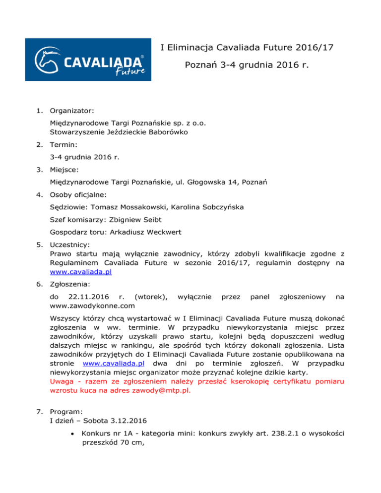 I Eliminacja Cavaliada Future 2016/17 Poznań 3-4 grudnia 2016 r. 1. Organizator: Międzynarodowe Targi Poznańskie sp. z o.o. Stowarzyszenie Jeździeckie Baborówko 2. Termin: 3-4 grudnia 2016 r. 3. Miejsce: Międzynarodowe Targi Poznańskie, ul. Głogowska 14, Poznań 4. Osoby oficjalne: Sędziowie: Tomasz Mossakowski, Karolina Sobczyńska Szef komisarzy: Zbigniew Seibt Gospodarz toru: Arkadiusz Weckwert 5. Uczestnicy: Prawo startu mają wyłącznie zawodnicy, którzy zdobyli kwalifikacje zgodne z Regulaminem Cavaliada Future w sezonie 2016/17, regulamin dostępny na www.cavaliada.pl 6. Zgłoszenia: do 22.11.2016 r. (wtorek), www.zawodykonne.com wyłącznie przez panel zgłoszeniowy na Wszyscy którzy chcą wystartować w I Eliminacji Cavaliada Future muszą dokonać zgłoszenia w ww. terminie. W przypadku niewykorzystania miejsc przez zawodników, którzy uzyskali prawo startu, kolejni będą dopuszczeni według dalszych miejsc w rankingu, ale spośród tych którzy dokonali zgłoszenia. Lista zawodników przyjętych do I Eliminacji Cavaliada Future zostanie opublikowana na stronie www.cavaliada.pl dwa dni po terminie zgłoszeń. W przypadku niewykorzystania miejsc organizator może przyznać kolejne dzikie karty. Uwaga - razem ze zgłoszeniem należy przesłać kserokopię certyfikatu pomiaru wzrostu kuca na adres [email protected]. 7. Program: I dzień – Sobota 3.12.2016 Konkurs nr 1A - kategoria mini: konkurs zwykły art. 238.2.1 o wysokości przeszkód 70 cm, Konkurs nr 1B - kategoria midi: konkurs zwykły art. 238.2.1 o wysokości przeszkód 85 cm. Konkurs nr 2, pokazowy – sztafeta, wysokość przeszkód do 70 cm II dzień – Niedziela 4.12.2016 Konkurs nr 3A - kategoria mini konkurs zwykły z rozgrywką art. 238.2.2 o wysokości 75 cm. Konkurs nr 3B - kategoria midi konkurs zwykły z rozgrywką art. 238.2.2 o wysokości przeszkód 90 cm. Listy startowe oraz godziny rozpoczęcia konkursów zgodnie z programem imprezy będą dostępne na www.cavaliada.pl 8. Warunki: parkur – wymiary: 30x71m, podłoże: piasek kwarcowy, rozprężalnia – wymiary: 24x40 m, podłoże: piasek kwarcowy, boksy – 3x3 m, otwarcie stajni: 2.12.2016 (piątek) godz. 10.00. 9. Nagrody: flots i nagrody rzeczowe 10. Opłaty: Opłata organizacyjna – 370 zł (zawiera opłaty startowe, wpisowe i boks) Opłata za przyłącze prądu – 150 zł za całe zawody Siano, słoma, trociny – ceny zgodne z cennikiem Cavaliada Poznań CSI3*-W Opłata organizacyjna zostanie zapłacona do dnia 24.11.2016 na rachunek: Stowarzyszenie Jeździeckie Baborówko, Baborówko, ul. Parkowa 1, 64-500 Szamotuły, Bank: BGŻ S.A., Numer konta: 14 2030 0045 1110 0000 0209 7090 11. Sprawy organizacyjne: Zawodników obowiązują opiekunów prawnych. aktualne badanie lekarskie oraz zgoda rodziców lub Na terenie zawodów obecne będzie zabezpieczenie medyczne. Organizator nie odpowiada za wypadki, szkody i kradzieże powstałe w trakcie zawodów i transportu. Organizator nie ponosi żadnej odpowiedzialności w razie wypadków i zachorowań trenera, zawodników, luzaków i koni, jak również w przypadku kradzieży, zniszczeń, pożarów i innych wydarzeń. Zawodnicy i właściciele odpowiadają osobiście za szkody w stosunku do osób trzecich, spowodowane przez nich samych, ich pracowników lub ich konie. Dlatego zalecane jest zawarcie stosownego pełnego ubezpieczenia na czas udziału w zawodach. Kodeks Postępowania z Koniem 1. Polski Związek Jeździecki w ślad za Międzynarodową Federacją Jeździecką FEI oczekuje, że wszystkie osoby zaangażowane w jakikolwiek sposób w sporty konne, będą przestrzegać zasad niniejszego Kodeksu Postępowania z Koniem oraz przyjmą do wiadomości, że w każdym przypadku dobro konia musi być sprawą nadrzędną i nigdy nie może być podporządkowane współzawodnictwu sportowemu ani celom komercyjnym. 2. Na wszystkich etapach treningu i przygotowań konia do startu w zawodach, dobro konia musi stać ponad wszelkimi innymi wymaganiami. Dotyczy to stałej opieki, metod treningu, starannego obrządku, kucia i transportu. 3. Konie i jeźdźcy muszą być wytrenowani, kompetentni i zdrowi zanim wezmą udział w zawodach. Odnosi się to także do podawania leków i środków medycznych, zabiegów chirurgicznych zagrażających dobru konia lub ciąży klaczy, oraz do przypadków nadużywania pomocy medycznej. 4. Zawody nie mogą zagrażać dobru konia. Wymaga to zwrócenia szczególnej uwagi na teren zawodów, powierzchnię podłoża, pogodę, warunki stajenne, kondycję koni i ich bezpieczeństwo także podczas podróży powrotnej z zawodów. 5. Należy dołożyć wszelkich starań, aby zapewnić koniom staranną opiekę po zakończeniu zawodów, a także humanitarne traktowanie po zakończeniu kariery sportowej. Dotyczy to właściwej opieki weterynaryjnej obrażeń odniesionych na zawodach, spokojnej starości, ewentualnie eutanazji. PZJ zachęca wszystkie osoby działające w sporcie jeździeckim do stałego podnoszenia swojej wiedzy oraz umiejętności dotyczących wszelkich aspektów współpracy z koniem. Propozycje zatwierdzone przez WZJ w dniu 22.10.2016 – Ryszard Szymoniak