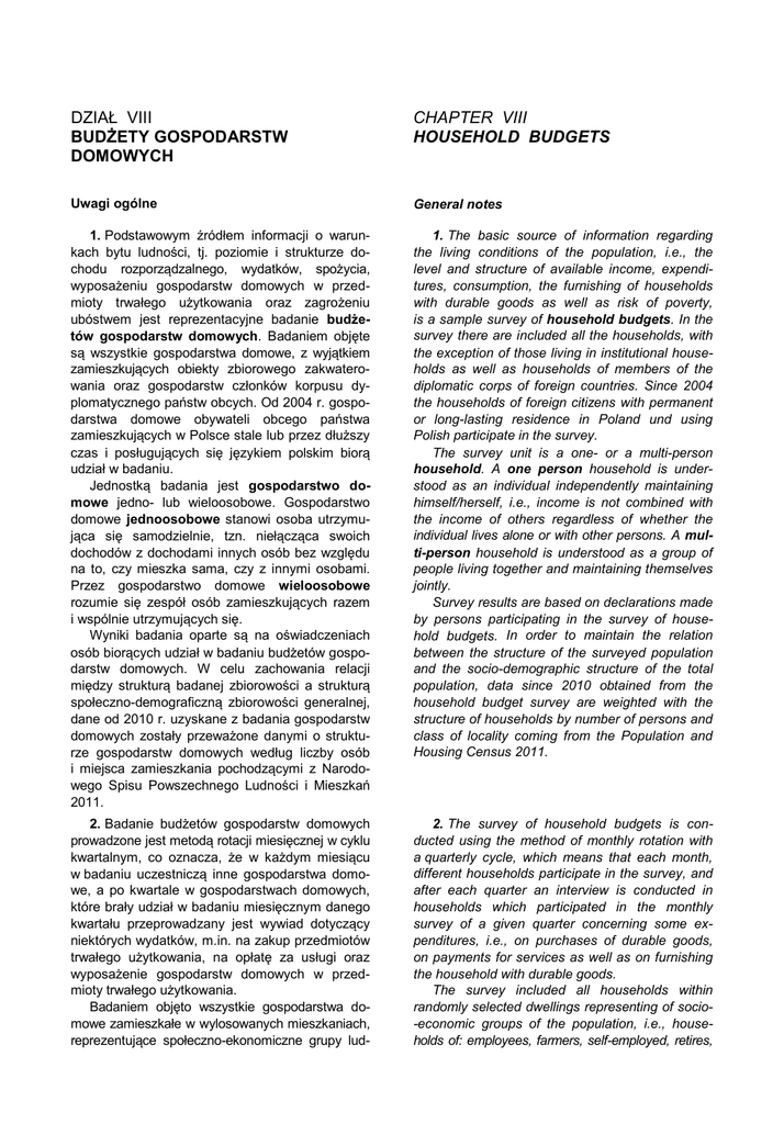 DZIAŁ VIII BUDŻETY GOSPODARSTW DOMOWYCH CHAPTER VIII HOUSEHOLD BUDGETS Uwagi ogólne General notes 1. Podstawowym źródłem informacji o warunkach bytu ludności, tj. poziomie i strukturze dochodu rozporządzalnego, wydatków, spożycia, wyposażeniu gospodarstw domowych w przedmioty trwałego użytkowania oraz zagrożeniu ubóstwem jest reprezentacyjne badanie budżetów gospodarstw domowych. Badaniem objęte są wszystkie gospodarstwa domowe, z wyjątkiem zamieszkujących obiekty zbiorowego zakwaterowania oraz gospodarstw członków korpusu dyplomatycznego państw obcych. Od 2004 r. gospodarstwa domowe obywateli obcego państwa zamieszkujących w Polsce stale lub przez dłuższy czas i posługujących się językiem polskim biorą udział w badaniu. Jednostką badania jest gospodarstwo domowe jedno- lub wieloosobowe. Gospodarstwo domowe jednoosobowe stanowi osoba utrzymująca się samodzielnie, tzn. niełącząca swoich dochodów z dochodami innych osób bez względu na to, czy mieszka sama, czy z innymi osobami. Przez gospodarstwo domowe wieloosobowe rozumie się zespół osób zamieszkujących razem i wspólnie utrzymujących się. Wyniki badania oparte są na oświadczeniach osób biorących udział w badaniu budżetów gospodarstw domowych. W celu zachowania relacji między strukturą badanej zbiorowości a strukturą społeczno-demograficzną zbiorowości generalnej, dane od 2010 r. uzyskane z badania gospodarstw domowych zostały przeważone danymi o strukturze gospodarstw domowych według liczby osób i miejsca zamieszkania pochodzącymi z Narodowego Spisu Powszechnego Ludności i Mieszkań 2011. 1. The basic source of information regarding the living conditions of the population, i.e., the level and structure of available income, expenditures, consumption, the furnishing of households with durable goods as well as risk of poverty, is a sample survey of household budgets. In the survey there are included all the households, with the exception of those living in institutional households as well as households of members of the diplomatic corps of foreign countries. Since 2004 the households of foreign citizens with permanent or long-lasting residence in Poland und using Polish participate in the survey. The survey unit is a one- or a multi-person household. A one person household is understood as an individual independently maintaining himself/herself, i.e., income is not combined with the income of others regardless of whether the individual lives alone or with other persons. A multi-person household is understood as a group of people living together and maintaining themselves jointly. Survey results are based on declarations made by persons participating in the survey of household budgets. In order to maintain the relation between the structure of the surveyed population and the socio-demographic structure of the total population, data since 2010 obtained from the household budget survey are weighted with the structure of households by number of persons and class of locality coming from the Population and Housing Census 2011. 2. Badanie budżetów gospodarstw domowych prowadzone jest metodą rotacji miesięcznej w cyklu kwartalnym, co oznacza, że w każdym miesiącu w badaniu uczestniczą inne gospodarstwa domowe, a po kwartale w gospodarstwach domowych, które brały udział w badaniu miesięcznym danego kwartału przeprowadzany jest wywiad dotyczący niektórych wydatków, m.in. na zakup przedmiotów trwałego użytkowania, na opłatę za usługi oraz wyposażenie gospodarstw domowych w przedmioty trwałego użytkowania. Badaniem objęto wszystkie gospodarstwa domowe zamieszkałe w wylosowanych mieszkaniach, reprezentujące społeczno-ekonomiczne grupy lud- 2. The survey of household budgets is conducted using the method of monthly rotation with a quarterly cycle, which means that each month, different households participate in the survey, and after each quarter an interview is conducted in households which participated in the monthly survey of a given quarter concerning some expenditures, i.e., on purchases of durable goods, on payments for services as well as on furnishing the household with durable goods. The survey included all households within randomly selected dwellings representing of socio-economic groups of the population, i.e., households of: employees, farmers, self-employed, retires, Household budgets 175 ności, tj. gospodarstwa domowe: pracowników, rolników, pracujących na własny rachunek, emerytów, rencistów oraz utrzymujących się z niezarobkowych źródeł (innych niż emerytura i renta). pensioners as well as households maintained from non-earned sources (other than retirement pay and pensions). 3. Kategorie osób występujących w gospodarstwach domowych ustalone zostały na podstawie ich głównego źródła utrzymania, czyli źródła przynoszącego największy dochód: 1) do osób pracujących zalicza się: a) pracujących najemnie, dla których głównym źródłem utrzymania jest dochód z pracy najemnej, niezależnie od rodzaju umowy zawartej z pracodawcą (umowa o pracę na czas nieokreślony lub określony, mianowanie, powołanie, praca sezonowa, praca dorywcza, umowa o wykonanie pracy nakładczej, umowa z agentem, umowa-zlecenie, umowa ustna itd.), b) pracujących w gospodarstwie indywidualnym w rolnictwie (łącznie z pomagającymi członkami ich rodzin), dla których głównym źródłem utrzymania jest dochód z pracy w użytkowanym przez siebie gospodarstwie indywidualnym w rolnictwie, c) pracujących na własny rachunek (łącznie z pomagającymi członkami ich rodzin), dla których głównym źródłem utrzymania jest prowadzenie działalności gospodarczej (poza użytkowaniem gospodarstwa indywidualnego w rolnictwie) w tym wynajem nieruchomości związanych z prowadzoną działalnością gospodarczą oraz wykonywanie wolnego zawodu, a od 2005 r. także członków spółdzielni produkcji rolniczej; 2) osoby pobierające emeryturę 