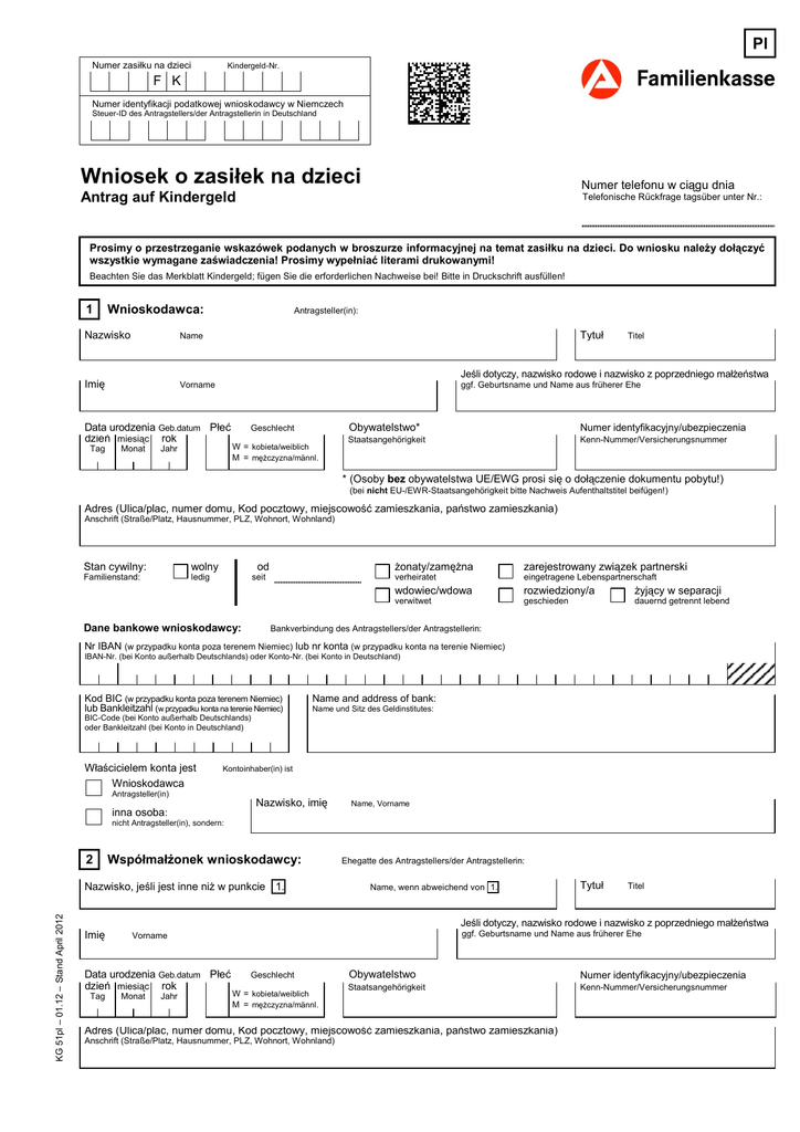 Pl . Numer zasiłku na dzieci Kindergeld-Nr. F K Numer identyfikacji podatkowej wnioskodawcy w Niemczech Steuer-ID des Antragstellers/der Antragstellerin in Deutschland Wniosek o zasiłek na dzieci Numer telefonu w ciągu dnia Antrag auf Kindergeld Telefonische Rückfrage tagsüber unter Nr.: Prosimy o przestrzeganie wskazówek podanych w broszurze informacyjnej na temat zasiłku na dzieci. Do wniosku należy dołączyć wszystkie wymagane zaświadczenia! Prosimy wypełniać literami drukowanymi! Beachten Sie das Merkblatt Kindergeld; fügen Sie die erforderlichen Nachweise bei! Bitte in Druckschrift ausfüllen! 1 Wnioskodawca: Nazwisko Name Imię Vorname Antragsteller(in): Tytuł Jeśli dotyczy, nazwisko rodowe i nazwisko z poprzedniego małżeństwa ggf. Geburtsname und Name aus früherer Ehe Data urodzenia Geb.datum Płeć dzień miesiąc rok Tag Titel Monat Jahr Geschlecht W = kobieta/weiblich M = mężczyzna/männl. Obywatelstwo* Numer identyfikacyjny/ubezpieczenia Staatsangehörigkeit Kenn-Nummer/Versicherungsnummer * (Osoby bez obywatelstwa UE/EWG prosi się o dołączenie dokumentu pobytu!) (bei nicht EU-/EWR-Staatsangehörigkeit bitte Nachweis Aufenthaltstitel beifügen!) Adres (Ulica/plac, numer domu, Kod pocztowy, miejscowość zamieszkania, państwo zamieszkania) Anschrift (Straße/Platz, Hausnummer, PLZ, Wohnort, Wohnland) Stan cywilny: wolny Familienstand: ledig od seit Dane bankowe wnioskodawcy: żonaty/zamężna zarejestrowany związek partnerski verheiratet eingetragene Lebenspartnerschaft wdowiec/wdowa rozwiedziony/a żyjący w separacji verwitwet geschieden dauernd getrennt lebend Bankverbindung des Antragstellers/der Antragstellerin: Nr IBAN (w przypadku konta poza terenem Niemiec) lub nr konta (w przypadku konta na terenie Niemiec) IBAN-Nr. (bei Konto außerhalb Deutschlands) oder Konto-Nr. (bei Konto in Deutschland) Kod BIC (w przypadku konta poza terenem Niemiec) lub Bankleitzahl (w przypadku konta na terenie Niemiec) Name and address of bank: Name und Sitz des Geldinstitutes: BIC-Code (bei Konto außerhalb Deutschlands) oder Bankleitzahl (bei Konto in Deutschland) Właścicielem konta jest Wnioskodawca Kontoinhaber(in) ist Antragsteller(in) inna osoba: Nazwisko, imię Name, Vorname nicht Antragsteller(in), sondern: 2 Współmałżonek wnioskodawcy: KG 51pl – 01.12 – Stand April 2012 Nazwisko, jeśli jest inne niż w punkcie 1. Ehegatte des Antragstellers/der Antragstellerin: Name, wenn abweichend von 1. Tytuł Titel Jeśli dotyczy, nazwisko rodowe i nazwisko z poprzedniego małżeństwa Imię Data urodzenia Geb.datum Płeć dzień miesiąc rok Tag ggf. Geburtsname und Name aus früherer Ehe Vorname Monat Jahr Geschlecht W = kobieta/weiblich M = mężczyzna/männl. Obywatelstwo Numer identyfikacyjny/ubezpieczenia Staatsangehörigkeit Kenn-Nummer/Versicherungsnummer Adres (Ulica/plac, numer domu, Kod pocztowy, miejscowość zamieszkania, państwo zamieszkania) Anschrift (Straße/Platz, Hausnummer, PLZ, Wohnort, Wohnland) 3 Dzieci: Kinder: Poniżej należy wpisać wszystkie żyjące dzieci zgodnie z kolejnością ich dat urodzenia - rozpoczynając od dziecka najstarszego; dzieci, które ukończyły 18 rok życia, wpisywać tylko wtedy, jeśli spełniają one specjalne, podane w broszurze wymagania‘.Jeśli za mało będzie miejsca na wpisy, wówczas należy użyć dodatkowej kartki. Nazwisko i imię Name und Vorname = kobieta/weibl. = mężcz./männl. Tragen Sie bitte hierunter in der Reihenfolge der Geburt - mit dem ältesten Kind beginnend - Ihre lebenden Kinder ein; Kinder, die das 18. Lebensjahr vollendet haben, jedoch nur aufführen, wenn sie eine der im Merkblatt genannten besonderen Voraussetzungen erfüllen. Sollte der Platz für die Eintragungen nicht ausreichen, verwenden Sie bitte ein gesondertes Blatt. Data urodzenia i płeć W przypadku takiego samego nazwiska jak w punkcie 1. wpisywać tylko imiona! Geburtsdatum und Geschlecht Bei gleichen Namen wie unter Nr. 1. nur Vorname eintragen ! Dzień Miesiąc Tag Monat Rok Jahr Stosunek prawny dziecka Kindschaftsverhältnis 1) W M Numer identyfikacji podatkowej w Niemczech Kraj, w którym dziecko przebywa Steuer-Identifikationsnummer in Deutschland Land, in dem sich das Kind aufhält Od kiedy dziecko przebywa w podanym kraju? Seit wann lebt das Kind im angegebenen Land? 1) Stosunek prawny dziecka: A = dziecko małż., B = dziecko uznane za małż., C = dziecko przysposobione , D = dziecko pozamałż. E = dziecko małżonka, który mieszka w gospodarstwie domowym wnioskodawcy, F = wnuki i rodzeństwo, które wnioskodawca przyjął do swojego gospodarstwa domowego, G = inne dzieci, które na stałe mieszkają w gospodarstwie domowym wnioskodawcy (dziecko pozostające pod opieką). Kindschaftsverhältnis: A = ehel. Kind, B = für ehel. erklärtes Kind, C = angenommenes Kind, D = nichtehel. Kind, E = Kind des Ehegatten, das im Haushalt des Antragstellers lebt, F = Enkel und Geschwister, die der Antragsteller in seinen Haushalt aufgenommen hat, G = Sonstige Kinder, die dauernd im Haushalt des Antragstellers leben (Pflegekinder). Jeśli wnioskodawca wpisał dzieci powyżej 18 lat, proszę podać: Wenn Sie über 18 Jahre alte Kinder eingetragen haben, bitte angeben: Imię Vorname Stan cywilny: Familienstand: 2) Uczęszcza do szkoły lub na naukę zawodu In Schul- oder Berufsausbildung od do von bis Czy samo dziecko ma własne (pozamałżeńskie) dzieci poniżej 3 lat? Hat das Kind selbst eigene (nichteheliche) Kinder unter 3 Jahren? tak nie ja nein tak nie ja nein tak nie ja nein tak nie ja nein tak nie ja nein 2) Stan cywilny: A = wolny, B = żonaty/zamężna, C = rozwiedziony/rozwiedziona, D = wdowiec/wdowa, E = zarejestrowany związek partnerski, F = żyjący w separacji. Familienstand: A = ledig, B = verheiratet, C = geschieden, D = verwitwet, E = eingetragene Lebenspartnerschaft, F = dauernd getrennt lebend. 4 Tutaj należy podać dane, jeśli - wpisane zostały własne dzieci, z którego drugim rodzicem wni