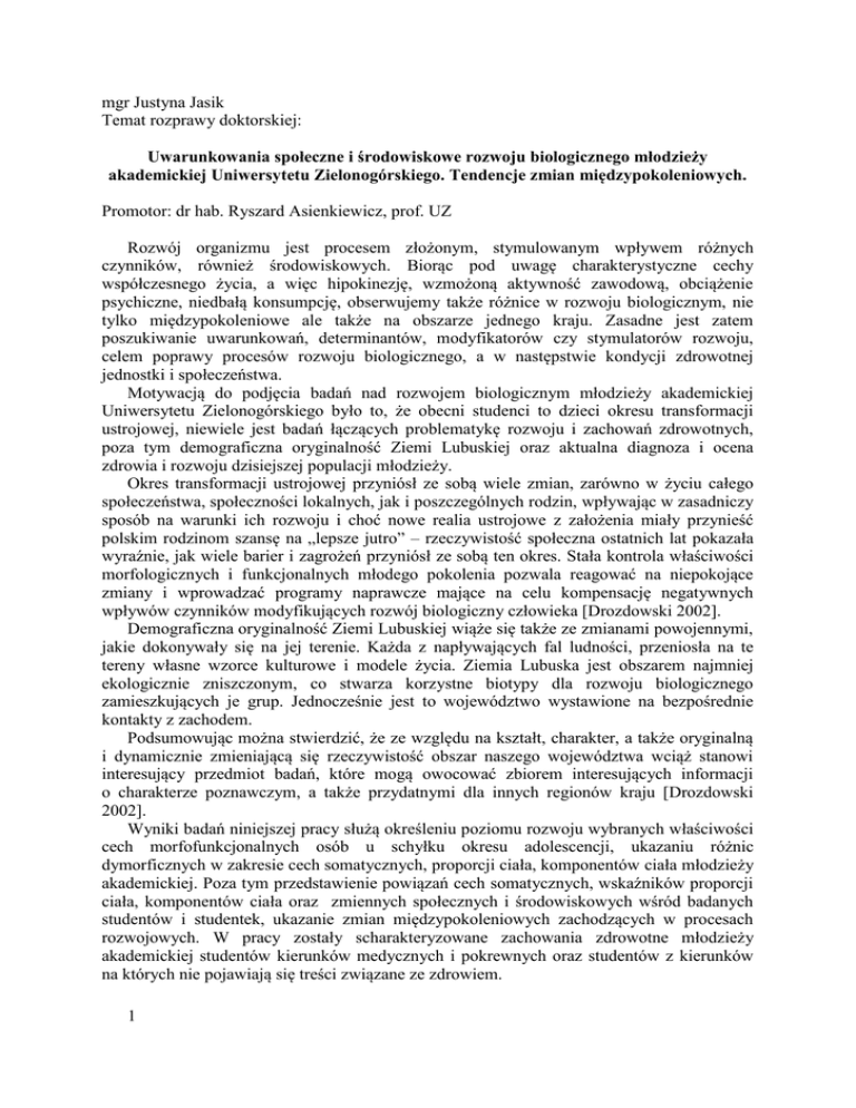 mgr Justyna Jasik Temat rozprawy doktorskiej: Uwarunkowania społeczne i środowiskowe rozwoju biologicznego młodzieży akademickiej Uniwersytetu Zielonogórskiego. Tendencje zmian międzypokoleniowych. Promotor: dr hab. Ryszard Asienkiewicz, prof. UZ Rozwój organizmu jest procesem złożonym, stymulowanym wpływem różnych czynników, również środowiskowych. Biorąc pod uwagę charakterystyczne cechy współczesnego życia, a więc hipokinezję, wzmożoną aktywność zawodową, obciążenie psychiczne, niedbałą konsumpcję, obserwujemy także różnice w rozwoju biologicznym, nie tylko międzypokoleniowe ale także na obszarze jednego kraju. Zasadne jest zatem poszukiwanie uwarunkowań, determinantów, modyfikatorów czy stymulatorów rozwoju, celem poprawy procesów rozwoju biologicznego, a w następstwie kondycji zdrowotnej jednostki i społeczeństwa. Motywacją do podjęcia badań nad rozwojem biologicznym młodzieży akademickiej Uniwersytetu Zielonogórskiego było to, że obecni studenci to dzieci okresu transformacji ustrojowej, niewiele jest badań łączących problematykę rozwoju i zachowań zdrowotnych, poza tym demograficzna oryginalność Ziemi Lubuskiej oraz aktualna diagnoza i ocena zdrowia i rozwoju dzisiejszej populacji młodzieży. Okres transformacji ustrojowej przyniósł ze sobą wiele zmian, zarówno w życiu całego społeczeństwa, społeczności lokalnych, jak i poszczególnych rodzin, wpływając w zasadniczy sposób na warunki ich rozwoju i choć nowe realia ustrojowe z założenia miały przynieść polskim rodzinom szansę na „lepsze jutro” – rzeczywistość społeczna ostatnich lat pokazała wyraźnie, jak wiele barier i zagrożeń przyniósł ze sobą ten okres. Stała kontrola właściwości morfologicznych i funkcjonalnych młodego pokolenia pozwala reagować na niepokojące zmiany i wprowadzać programy naprawcze mające na celu kompensację negatywnych wpływów czynników modyfikujących rozwój biologiczny człowieka [Drozdowski 2002]. Demograficzna oryginalność Ziemi Lubuskiej wiąże się także ze zmianami powojennymi, jakie dokonywały się na jej terenie. Każda z napływających fal ludności, przeniosła na te tereny własne wzorce kulturowe i modele życia. Ziemia Lubuska jest obszarem najmniej ekologicznie zniszczonym, co stwarza korzystne biotypy dla rozwoju biologicznego zamieszkujących je grup. Jednocześnie jest to województwo wystawione na bezpośrednie kontakty z zachodem. Podsumowując można stwierdzić, że ze względu na kształt, charakter, a także oryginalną i dynamicznie zmieniającą się rzeczywistość obszar naszego województwa wciąż stanowi interesujący przedmiot badań, które mogą owocować zbiorem interesujących informacji o charakterze poznawczym, a także przydatnymi dla innych regionów kraju [Drozdowski 2002]. Wyniki badań niniejszej pracy służą określeniu poziomu rozwoju wybranych właściwości cech morfofunkcjonalnych osób u schyłku okresu adolescencji, ukazaniu różnic dymorficznych w zakresie cech somatycznych, proporcji ciała, komponentów ciała młodzieży akademickiej. Poza tym przedstawienie powiązań cech somatycznych, wskaźników proporcji ciała, komponentów ciała oraz zmiennych społecznych i środowiskowych wśród badanych studentów i studentek, ukazanie zmian międzypokoleniowych zachodzących w procesach rozwojowych. W pracy zostały scharakteryzowane zachowania zdrowotne młodzieży akademickiej studentów kierunków medycznych i pokrewnych oraz studentów z kierunków na których nie pojawiają się treści związane ze zdrowiem. 1 Badaniami objęto grupę studentów Uniwersytetu Zielonogórskiego uczęszczającą na pierwszy rok studiów. Zastosowano grupowy dobór próby. Materiał wykorzystany w pracy, zebrany został przez autorkę pracy w roku akademickim 2011/2012 oraz 2013/2014, głównie podczas zajęć wychowania fizycznego. Badaniami antropometrycznymi objęto w sumie 882 studentów, w tym 565 studentek oraz 317 studentów. Do zrealizowania celów badawczych posłużono się metodą antropometryczną (technika pomiarów, narzędzia: antropometr, cyrkiel kabłąkowy duży, cyrkiel liniowy, fałdomierz, waga lekarska, taśma krawiecka [Drozdowski 1998]) oraz metodą sondażu diagnostycznego (technika ankietowa, narzędzie: kwestionariusz ankiety [Łobocki 2006]). Na podstawie uzyskanych wyników badań uzyskano następujące stwierdzenia i wnioski: Populacje studentów i studentek w badanym okresie rozwoju biologicznego wykazują wyraźne zróżnicowanie dymorficzne w parametrach somatycznych na poziomie statystycznie istotnym. Mężczyźni charakteryzują się przeciętnie wyższymi wartościami wysokości i masy ciała, wymiarów długościowych i szerokościowych, jednak w odniesieniu do badań populacji studenckiej z roku 2000, różnice te są coraz mniejsze. Wyniki sugerują zatem zacieranie się naturalnych różnic w budowie kobiet i mężczyzn. Obserwacje i pomiary zrealizowane w grupie młodzieży akademickiej UZ, wskazują na zróżnicowanie młodzieży w zakresie typów budowy ciała. W odniesieniu do obserwacji młodzieży z 15 lat (2000-2015), dzisiejsze studentki charakteryzują się przeciętnie mniejszym udziałem komponentu endomorfii i ektomorfii, a większym mezomorfii. W zespołach męskich, w porównaniu do studentów z roku akademickiego 1999/2000, badania wskazują na wzrost zawartości endomorfii i mezomorfii, a spadek komponentu ektomorfii. Wyniki te potwierdzają również obliczenia wskaźników Rohrera, BMI czy wskaźnika smukłości, ukazujące w badanej grupie większą liczbę studentów z nadwagą, otyłością czy pykniczną budową ciała. Badana populacja kobiet w porównaniu do mężczyzn charakteryzuje się przeciętnie większymi wartościami grubości fałdów skórno-tłuszczowych, a także zawartością tłuszczu w składzie komponentów tkankowych. Zmiany międzypokoleniowe (2000-2015) składu ciała wska